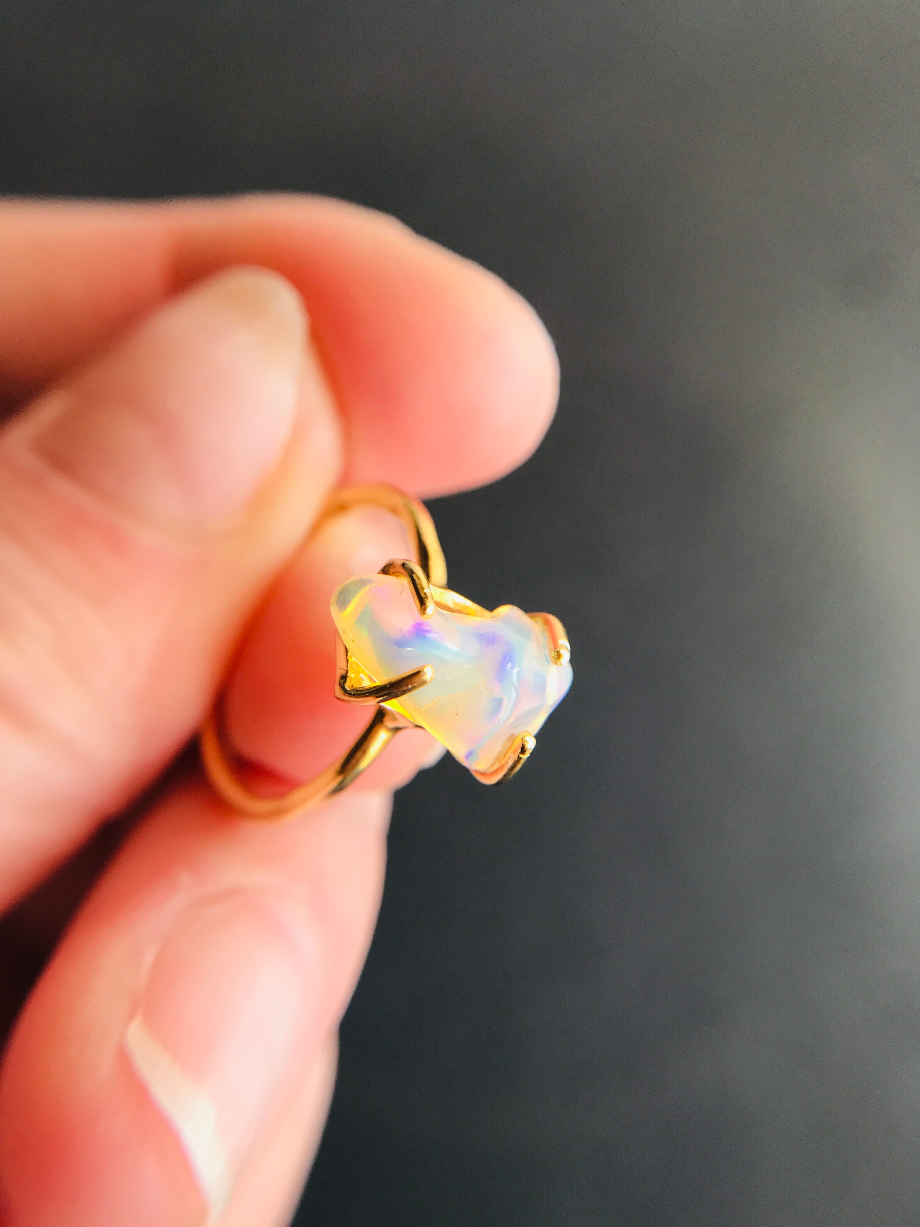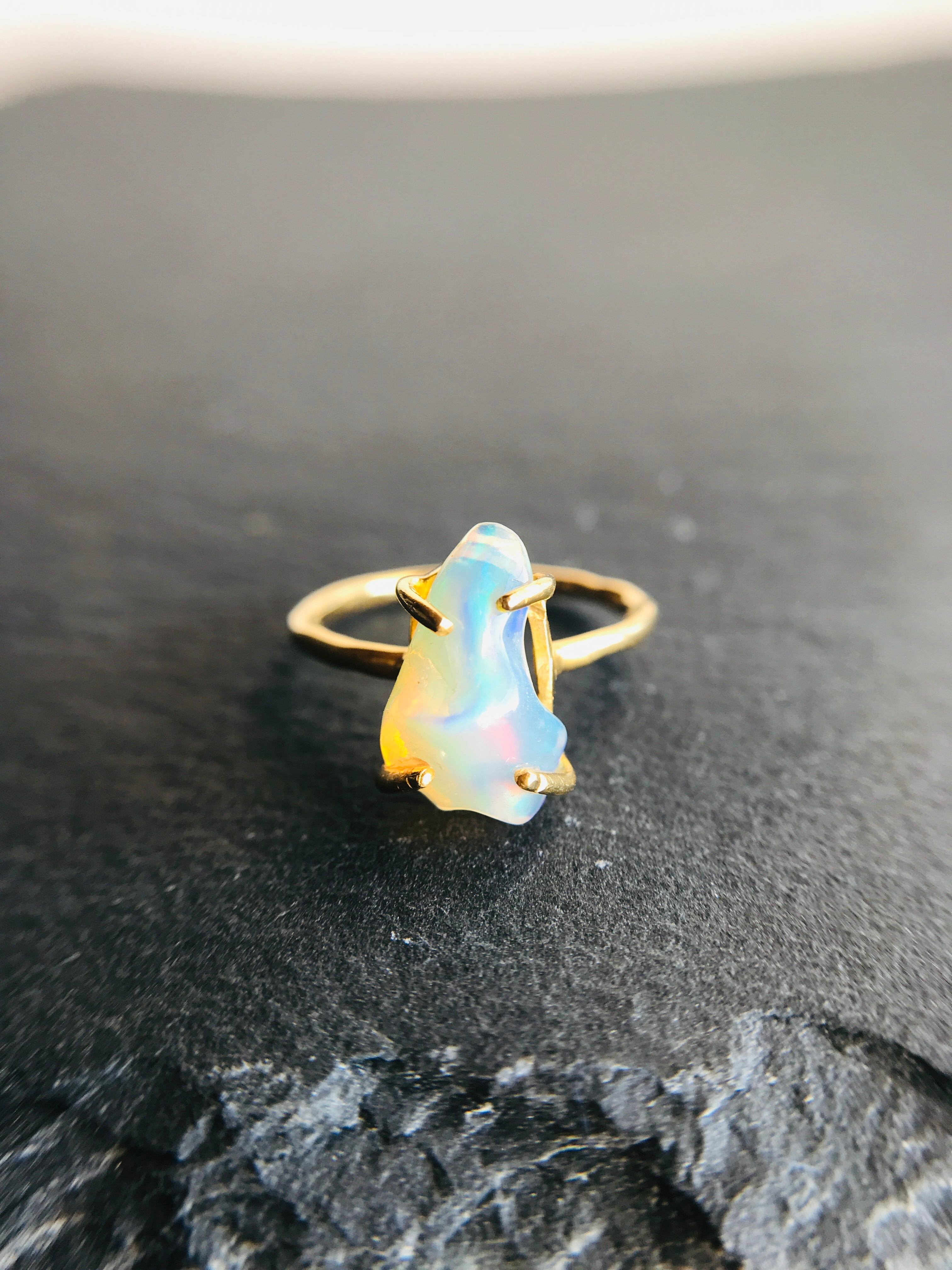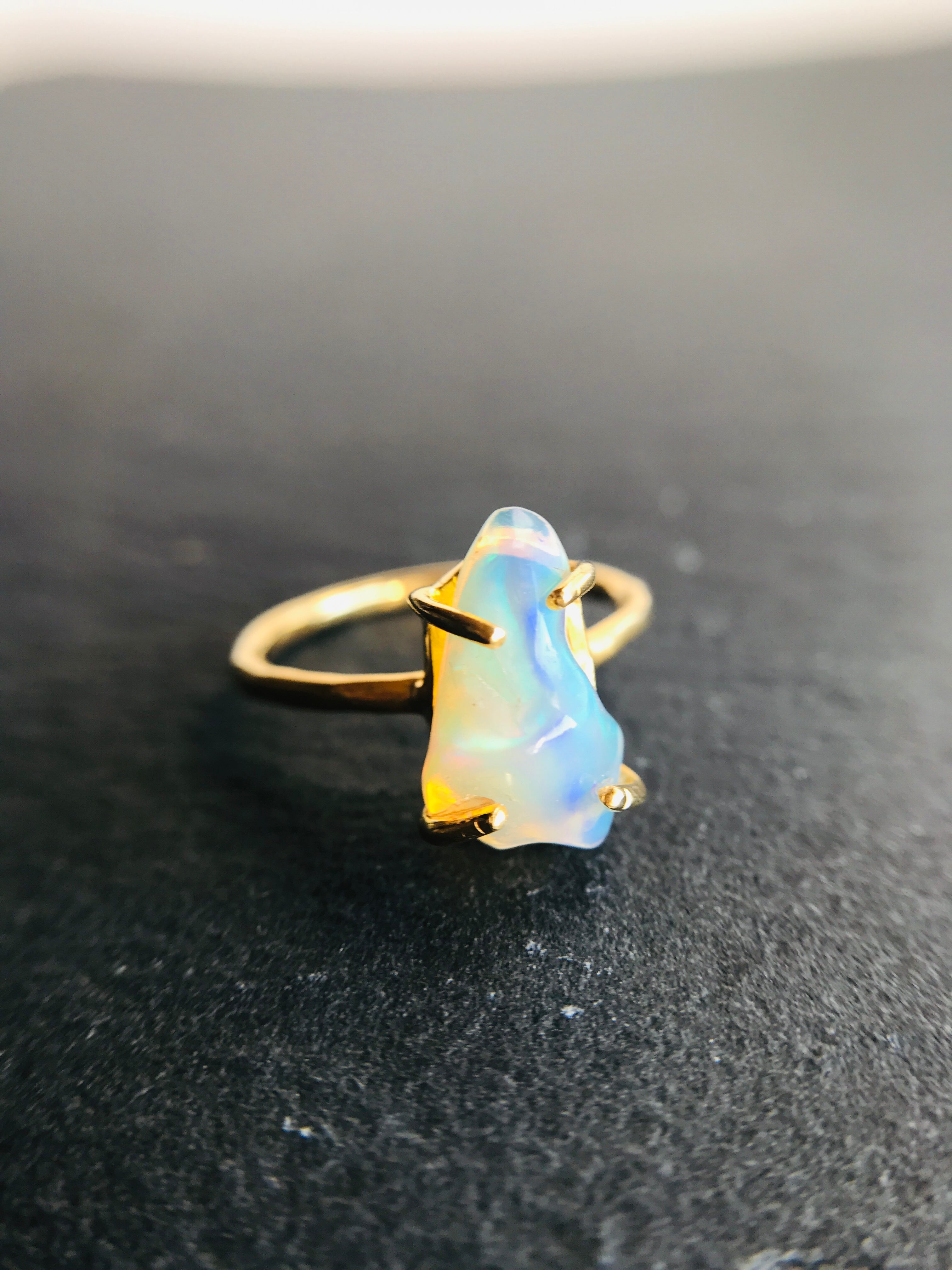 オパールの原石をそのまま、4つの爪でシンプルにリングとして仕上げています。原石らしい自然な形ですので、唯一無二の自分だけのアクセサリーとして身に着けていただけます。