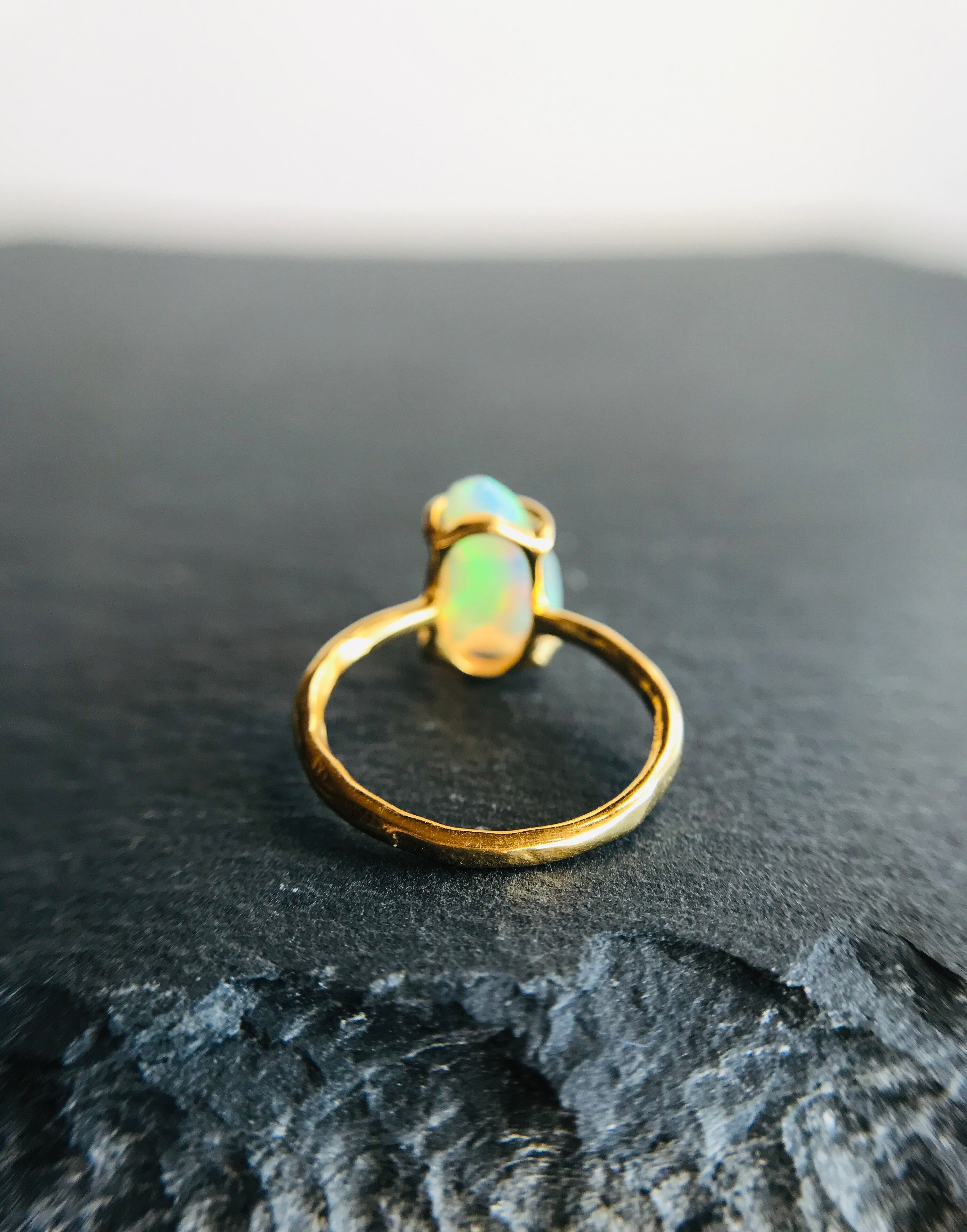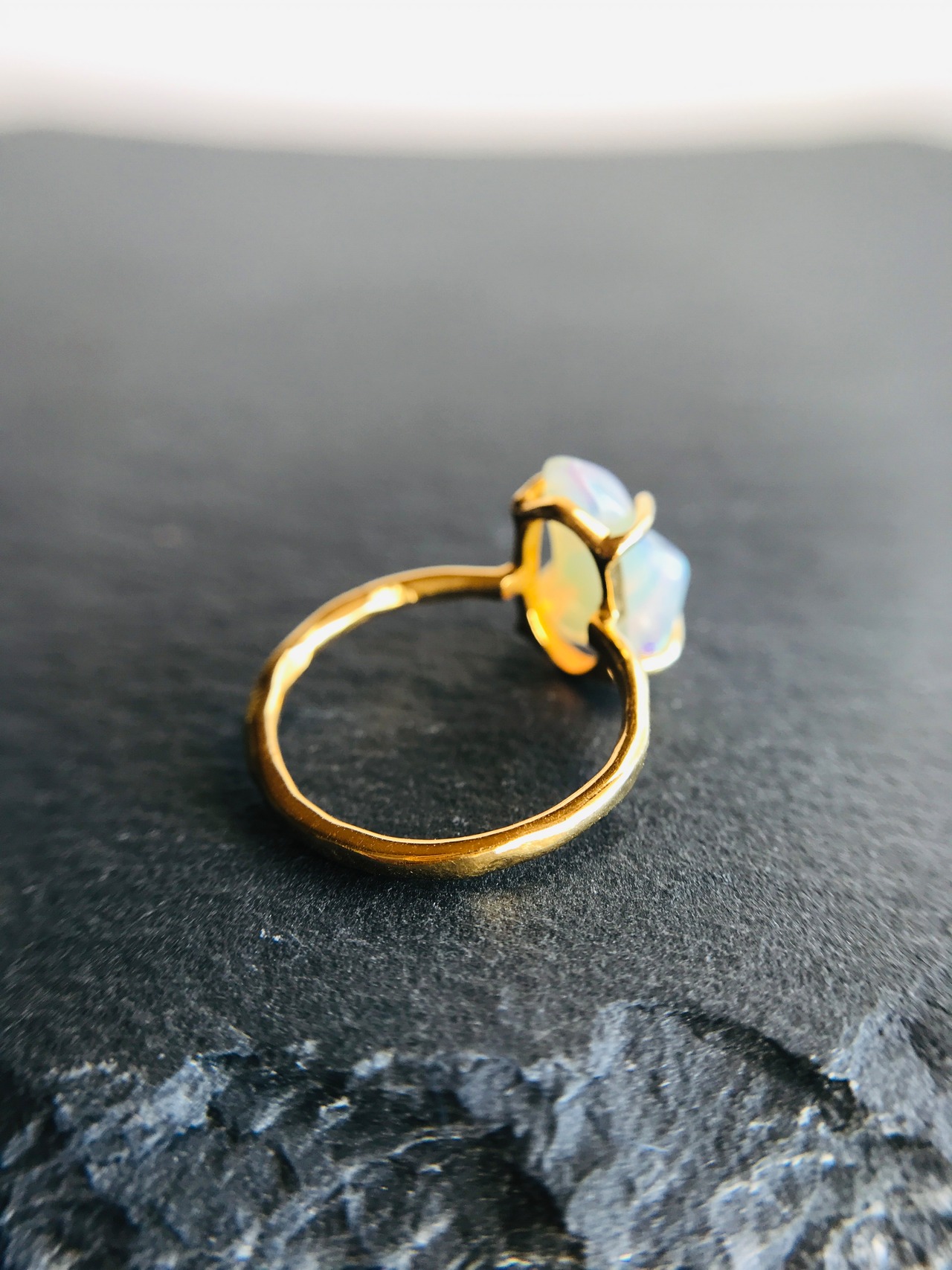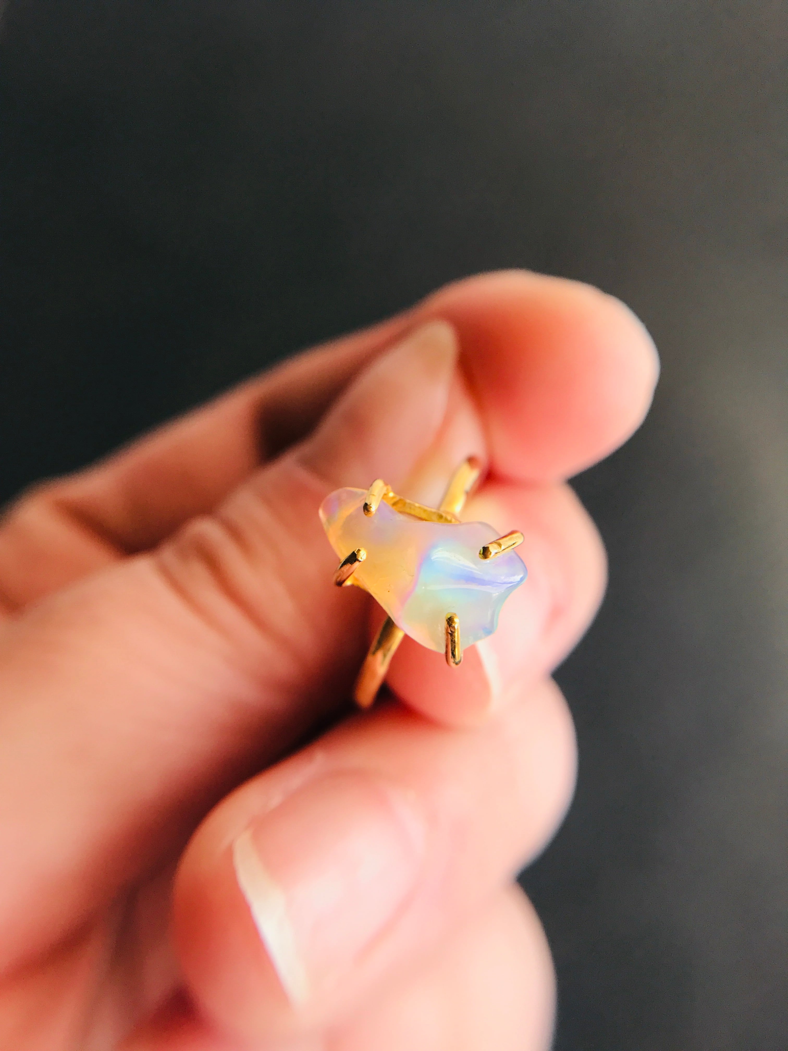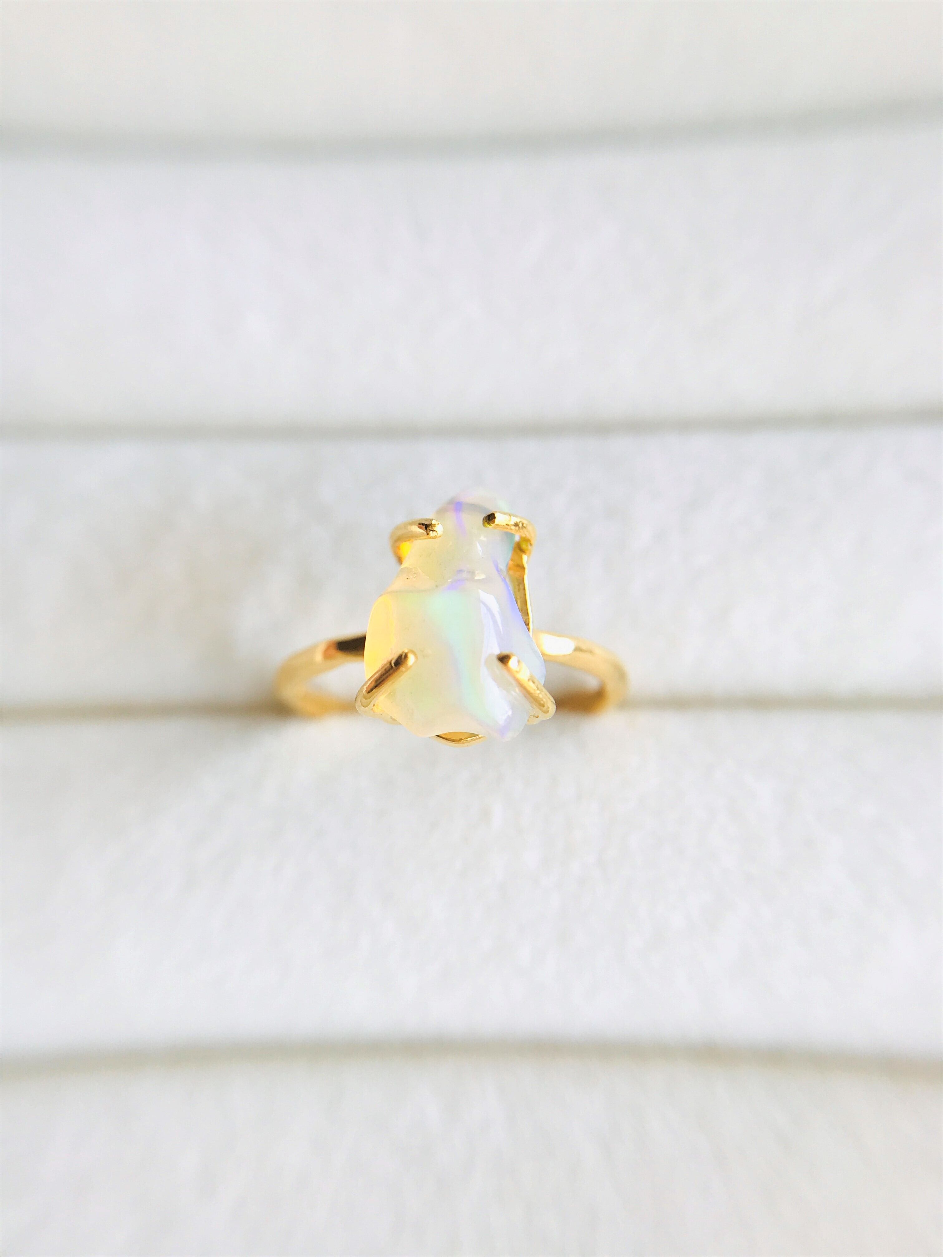 オパールの原石をそのまま、4つの爪でシンプルにリングとして仕上げています。原石らしい自然な形ですので、唯一無二の自分だけのアクセサリーとして身に着けていただけます。