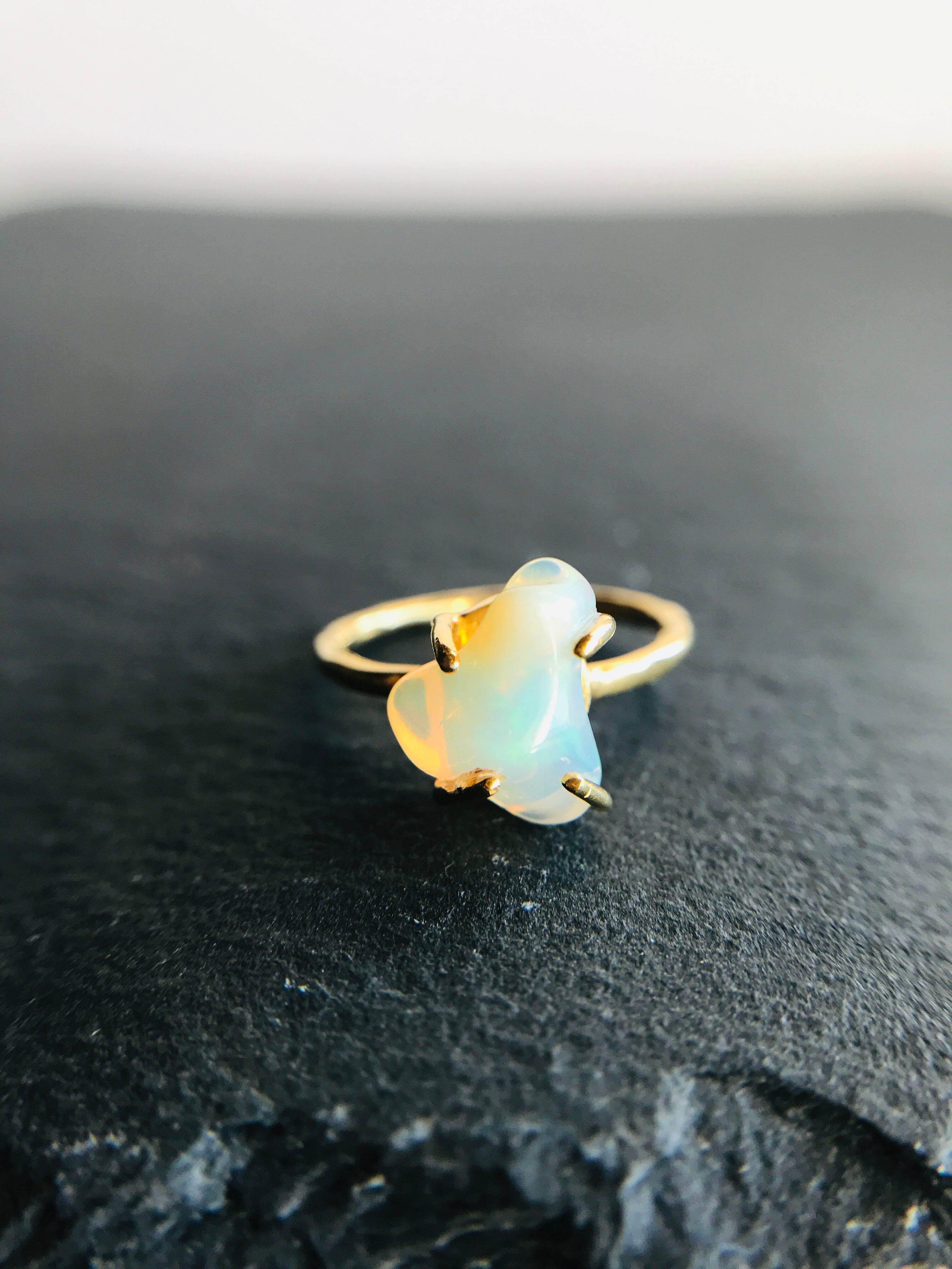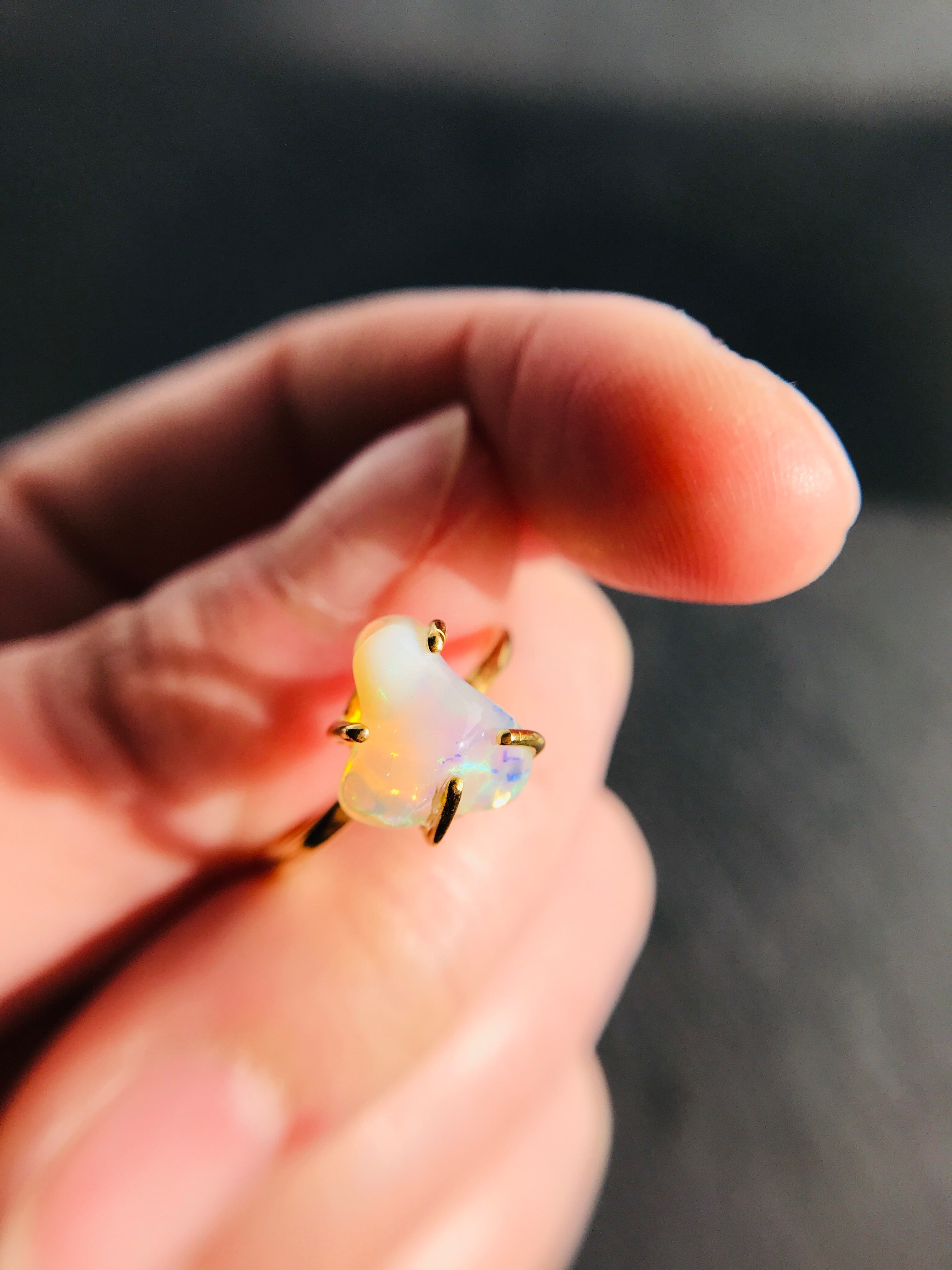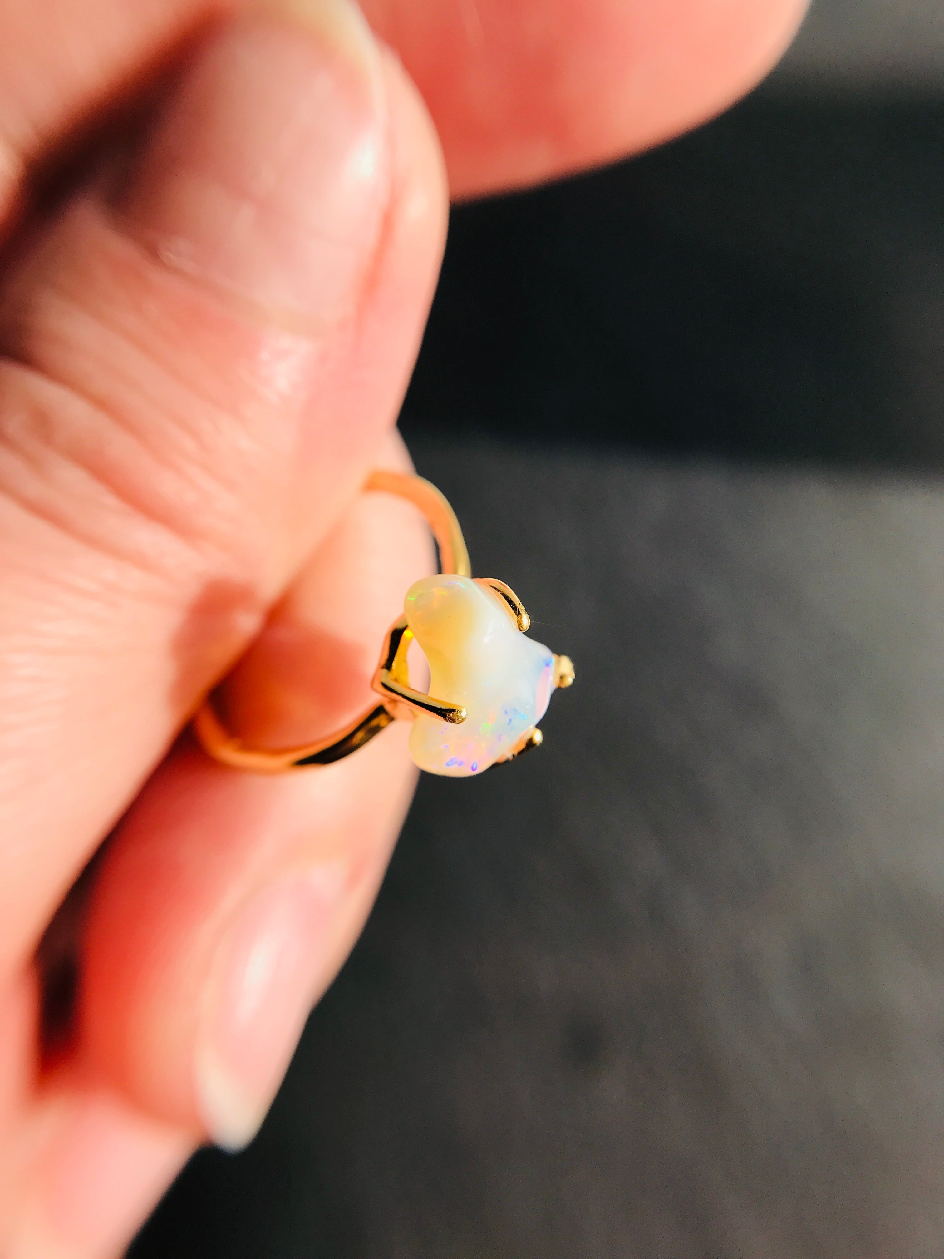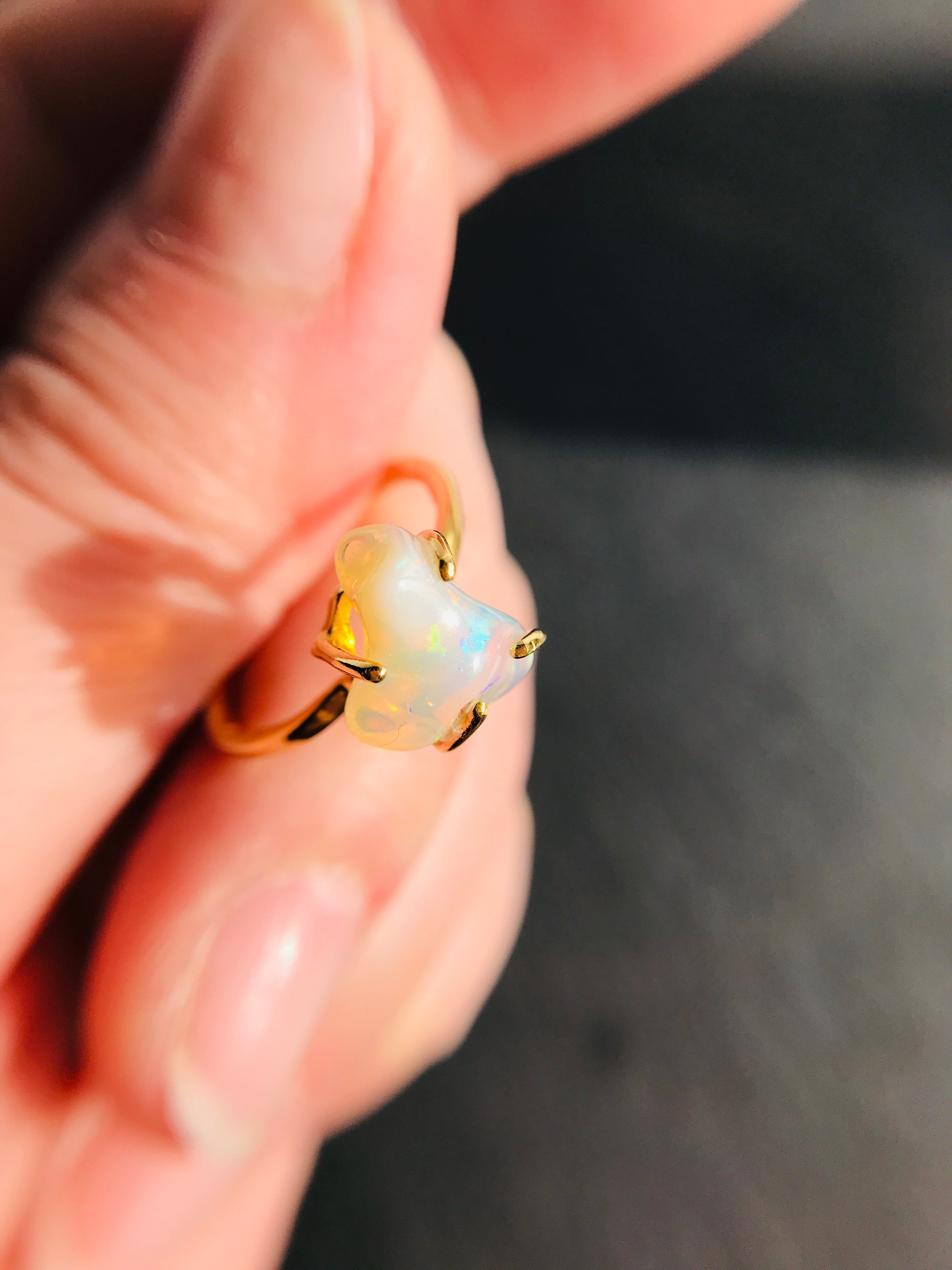 オパールの原石をそのまま、4つの爪でシンプルにリングとして仕上げています。原石らしい自然な形ですので、唯一無二の自分だけのアクセサリーとして身に着けていただけます。