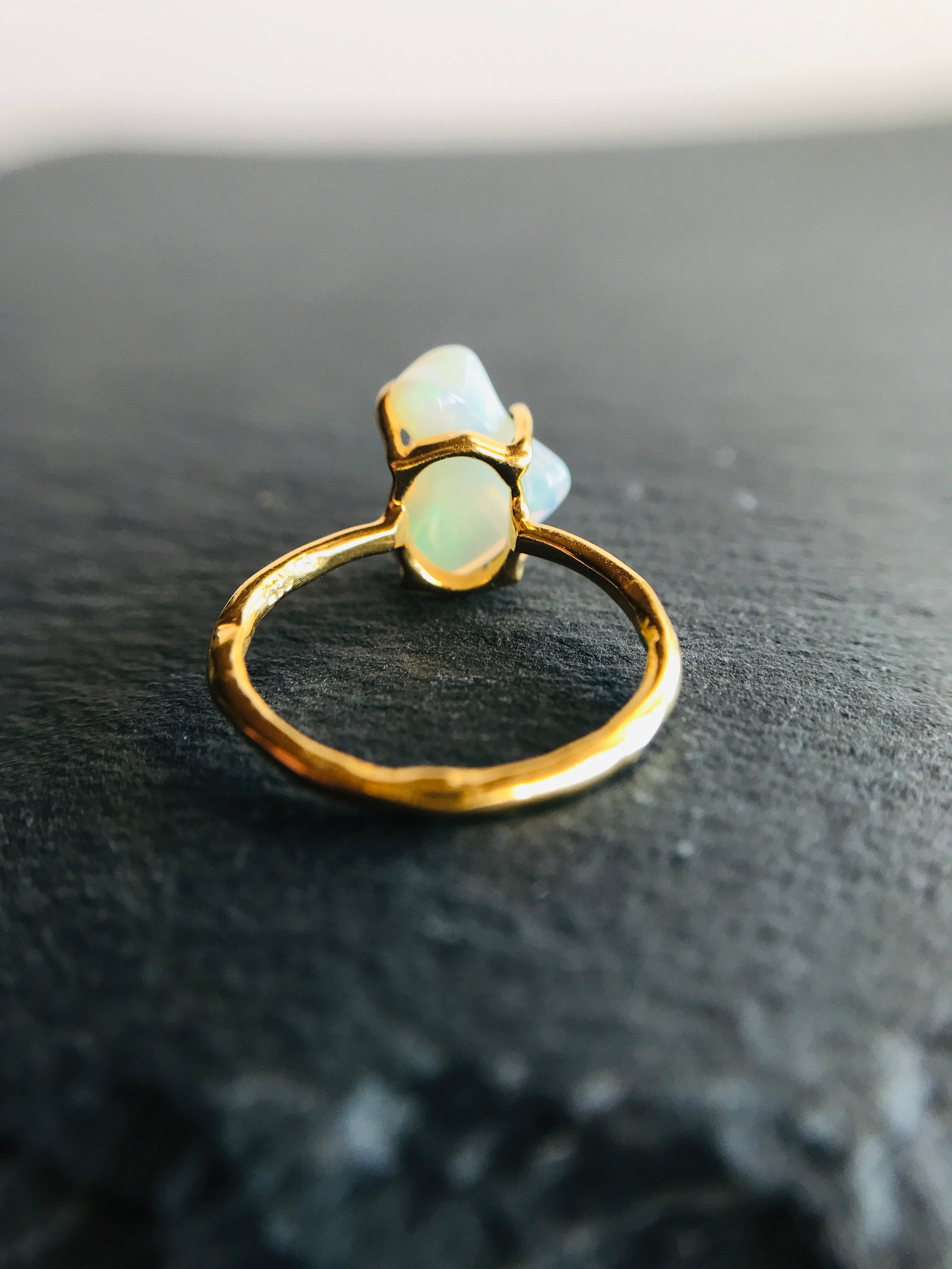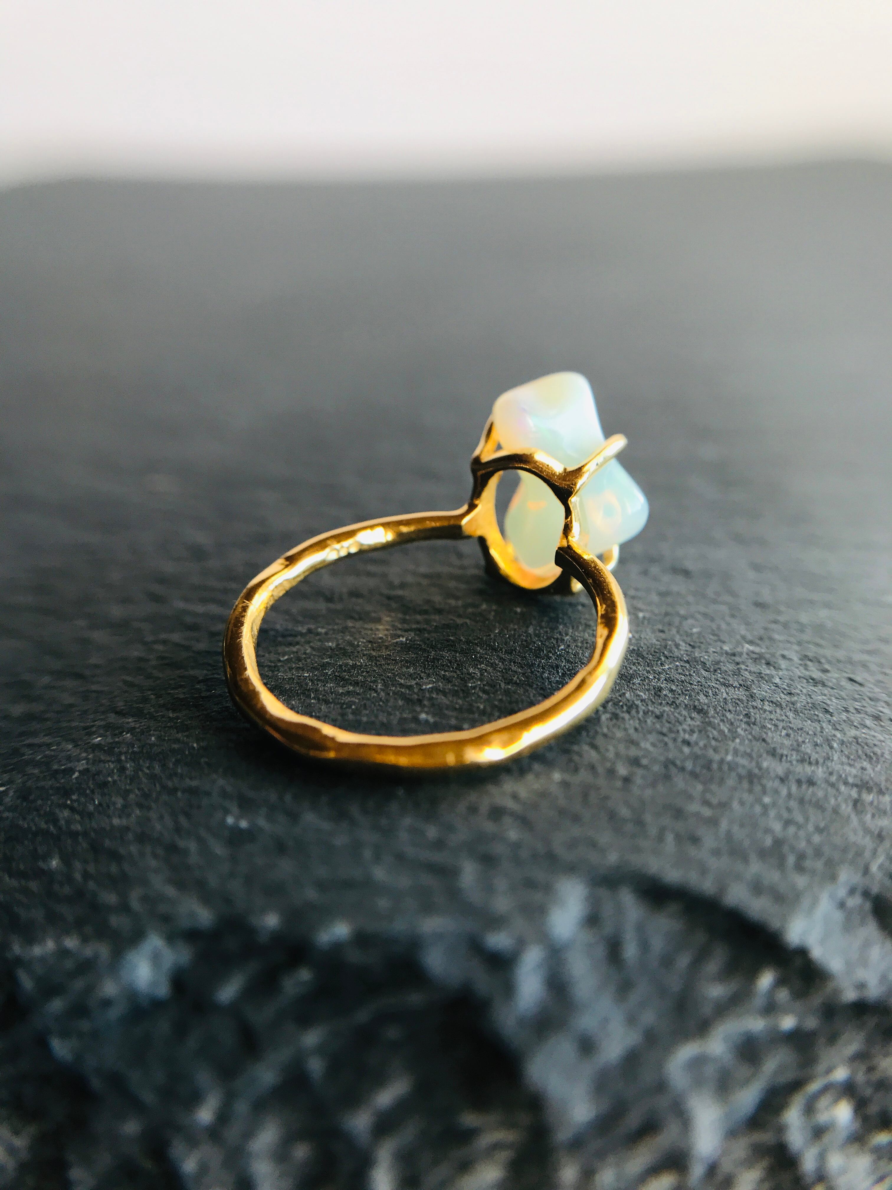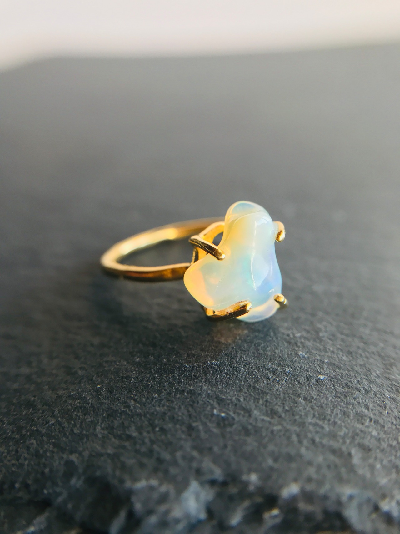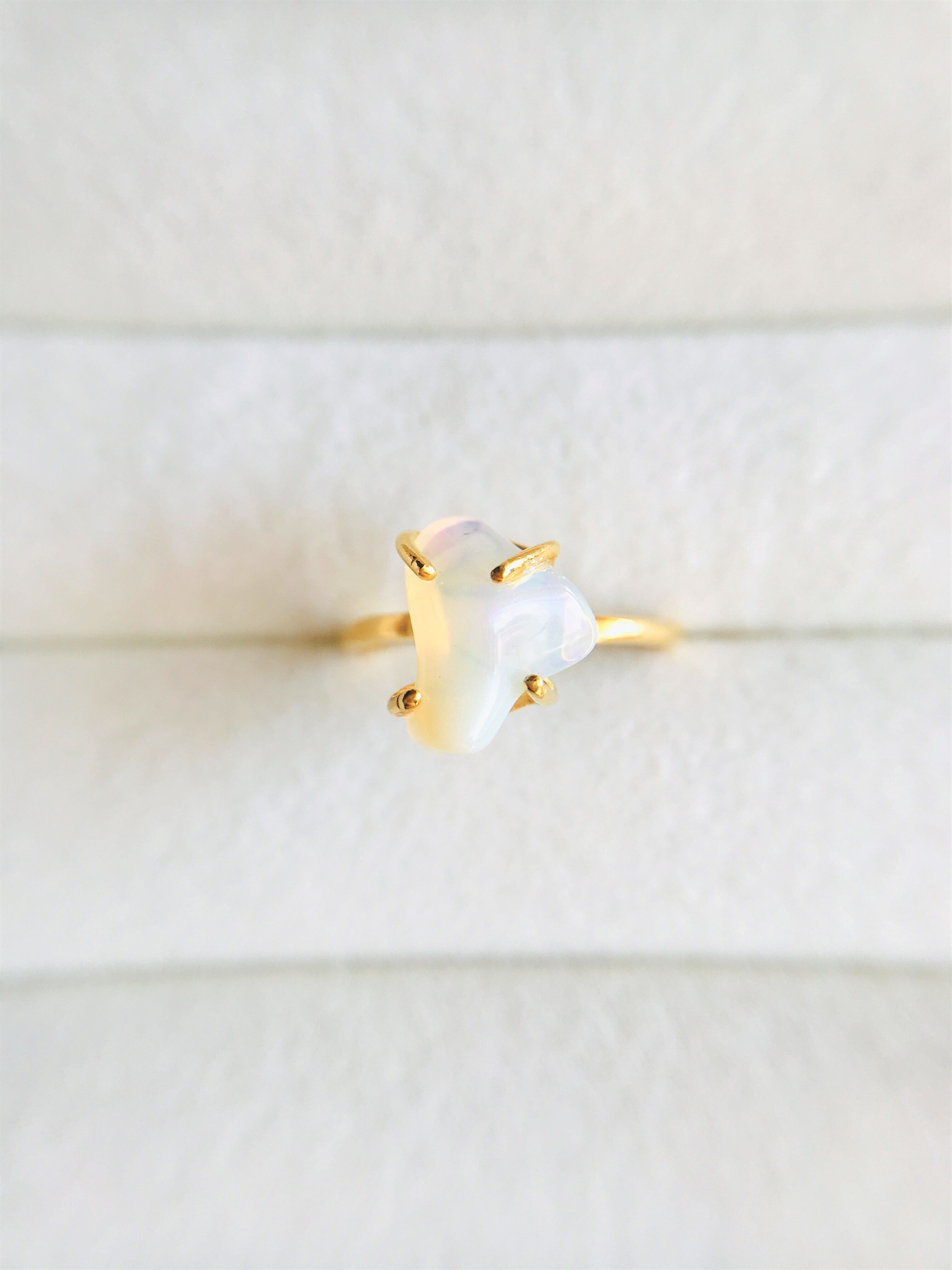 オパールの原石をそのまま、4つの爪でシンプルにリングとして仕上げています。原石らしい自然な形ですので、唯一無二の自分だけのアクセサリーとして身に着けていただけます。