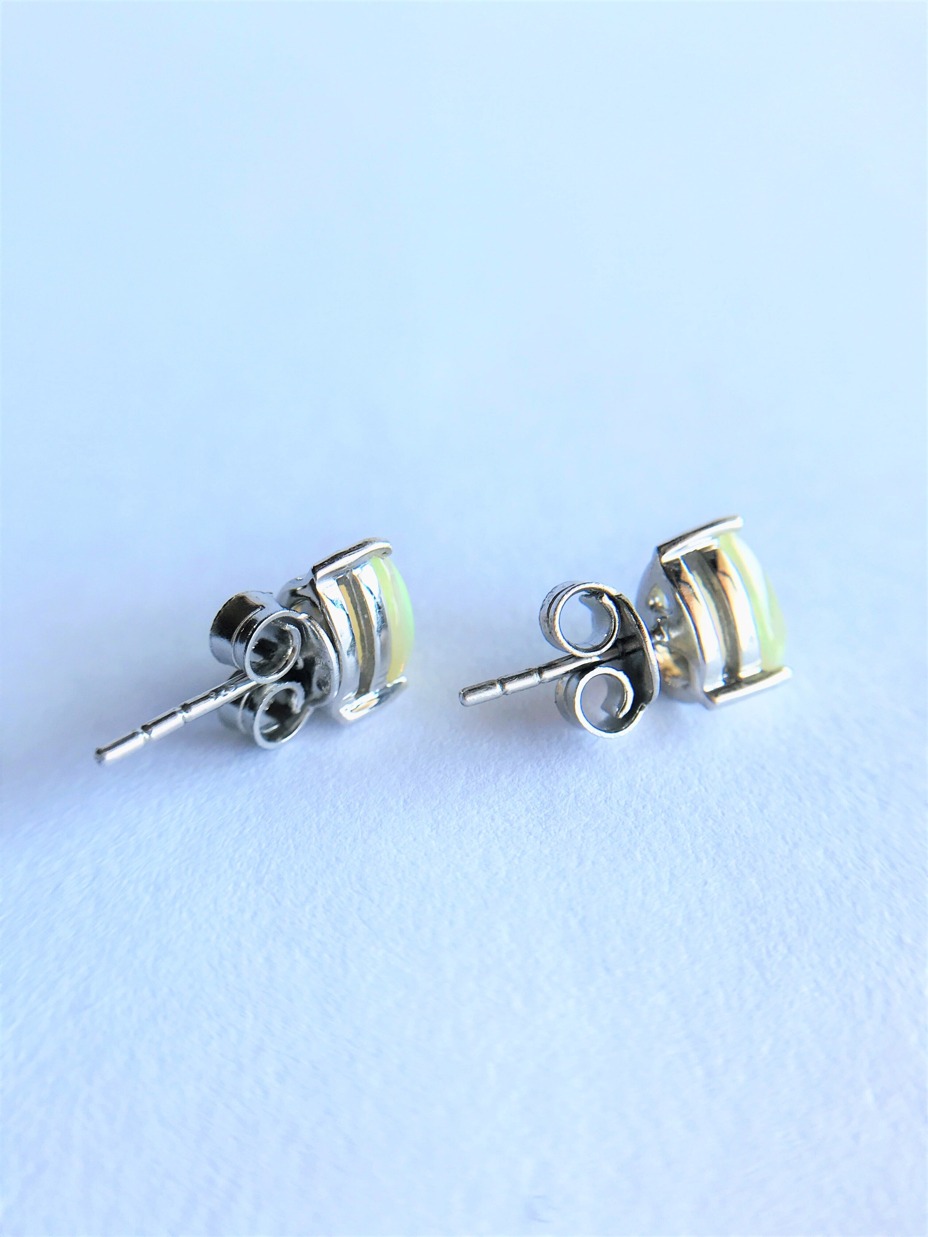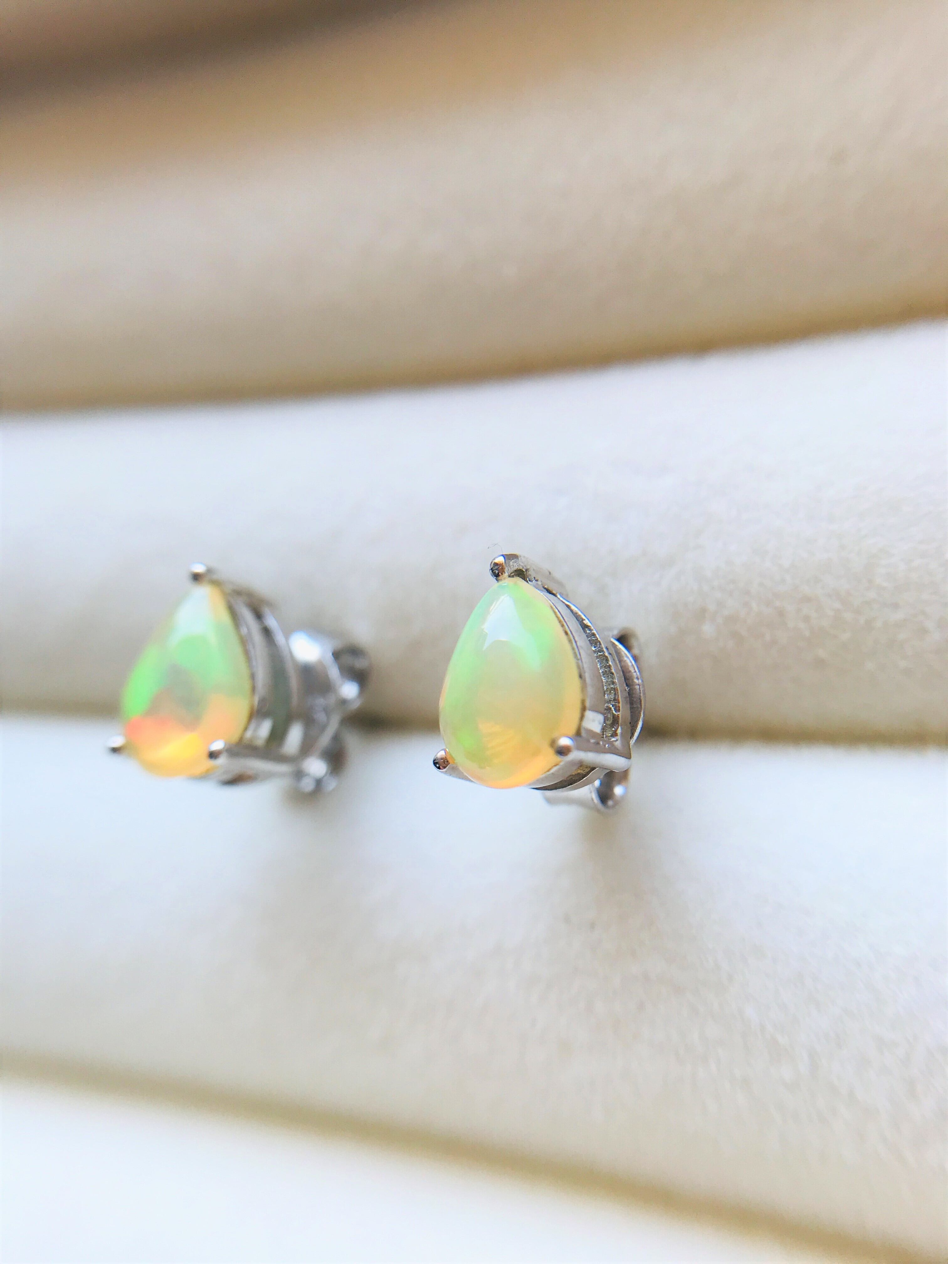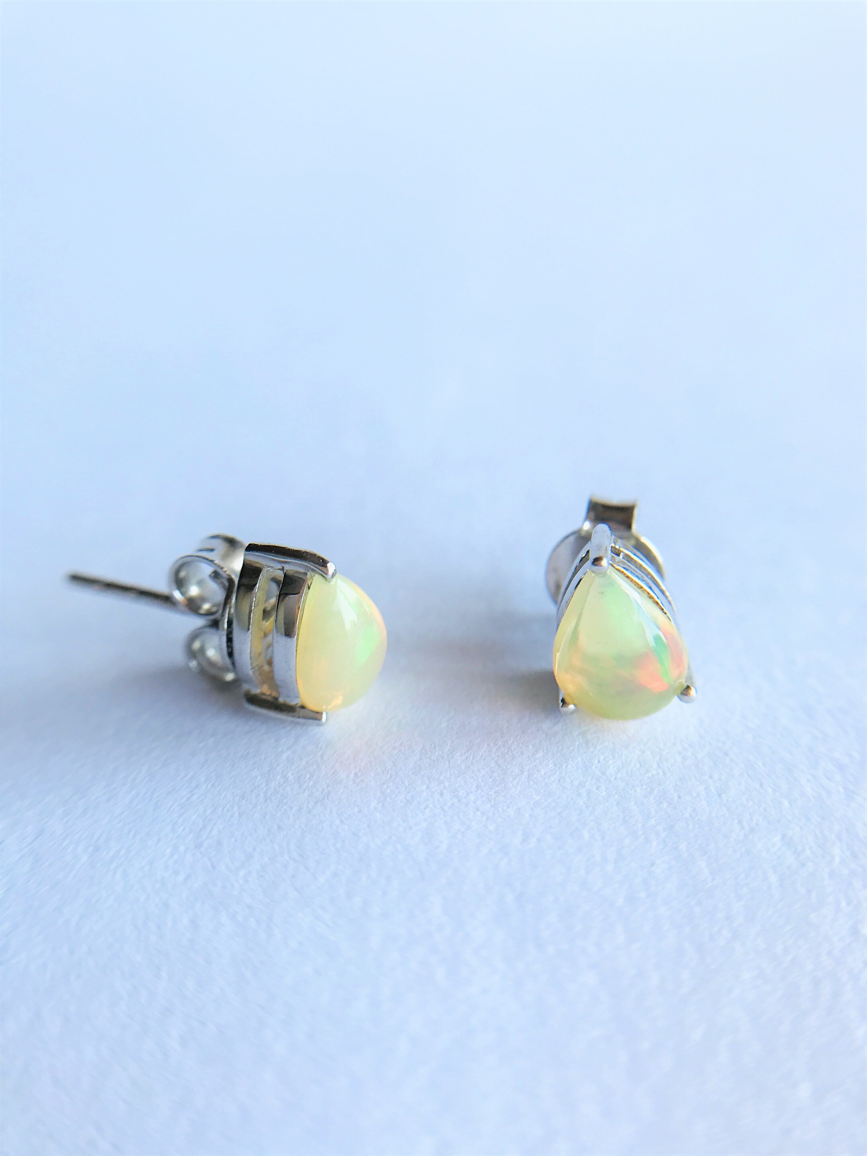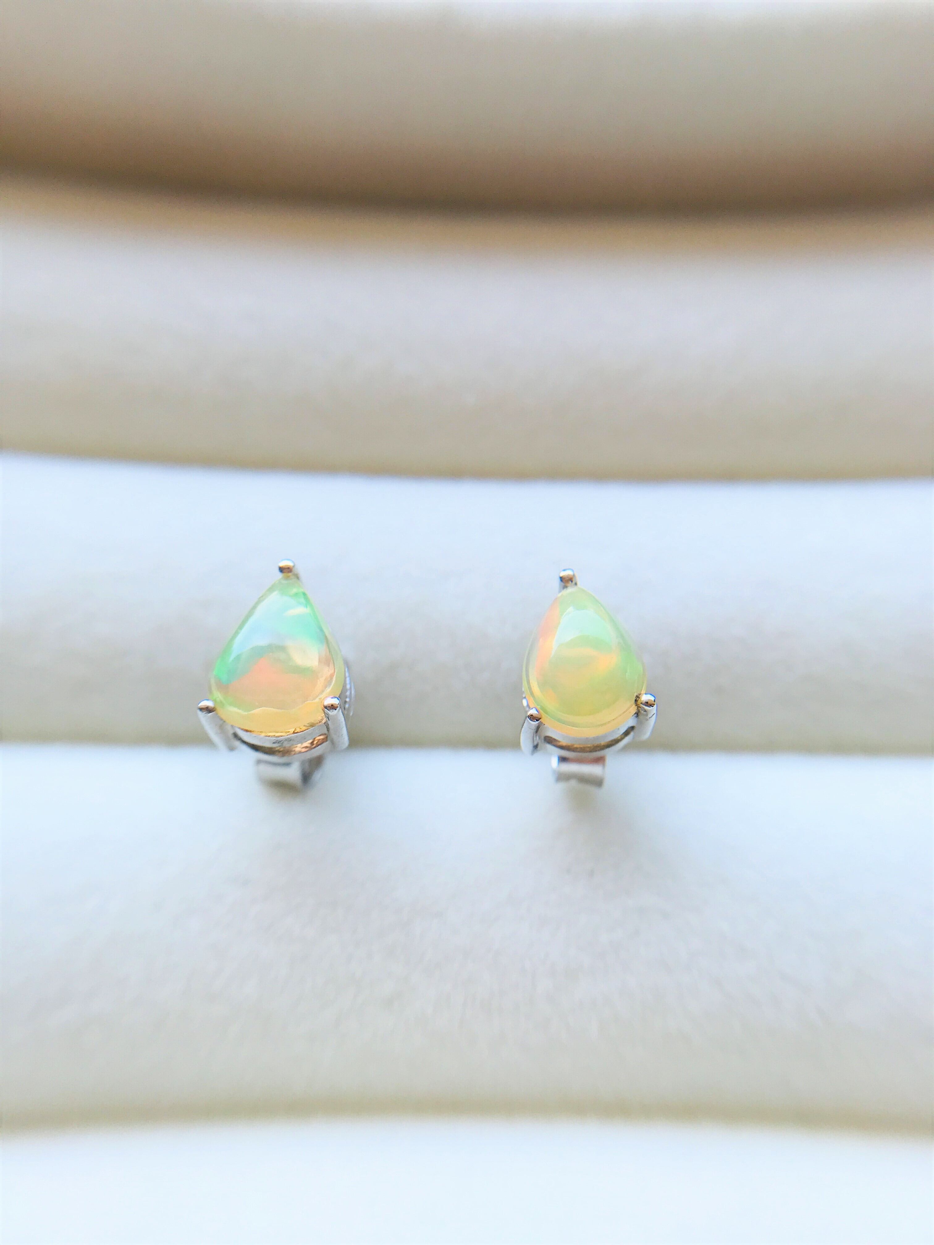 しずく型のオパールルースを、3つの爪でシンプルにピアスとして仕上げています。