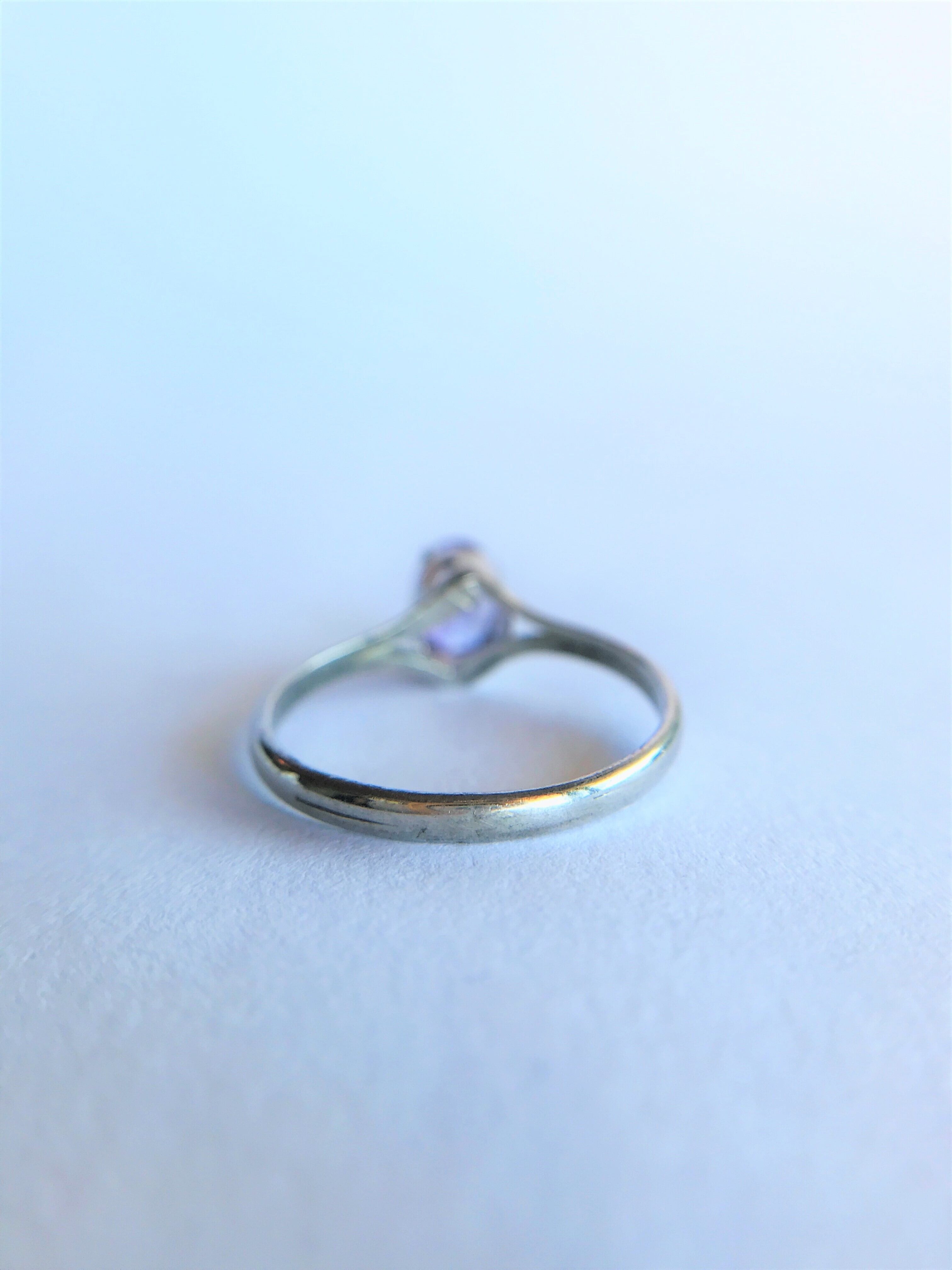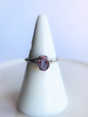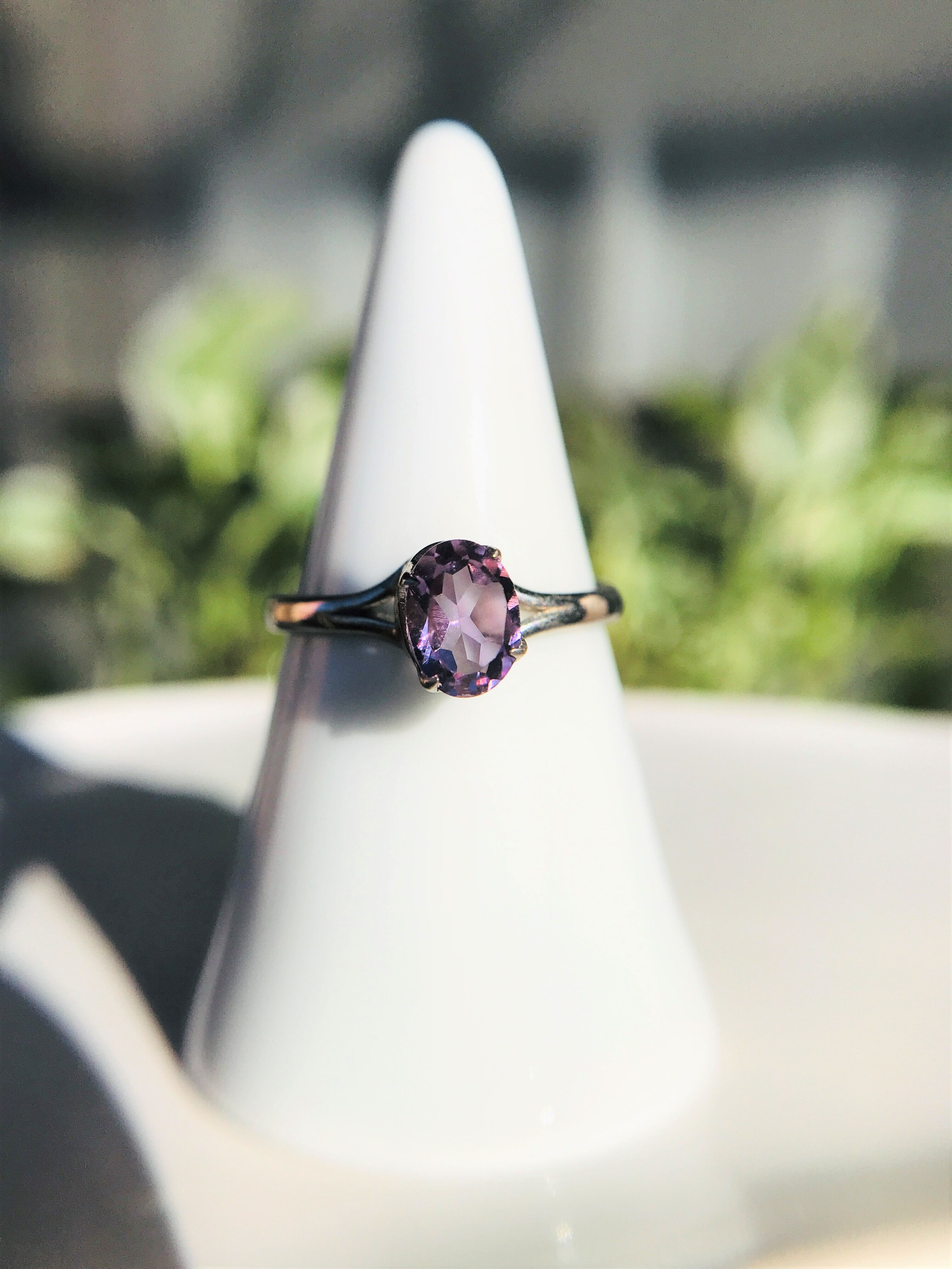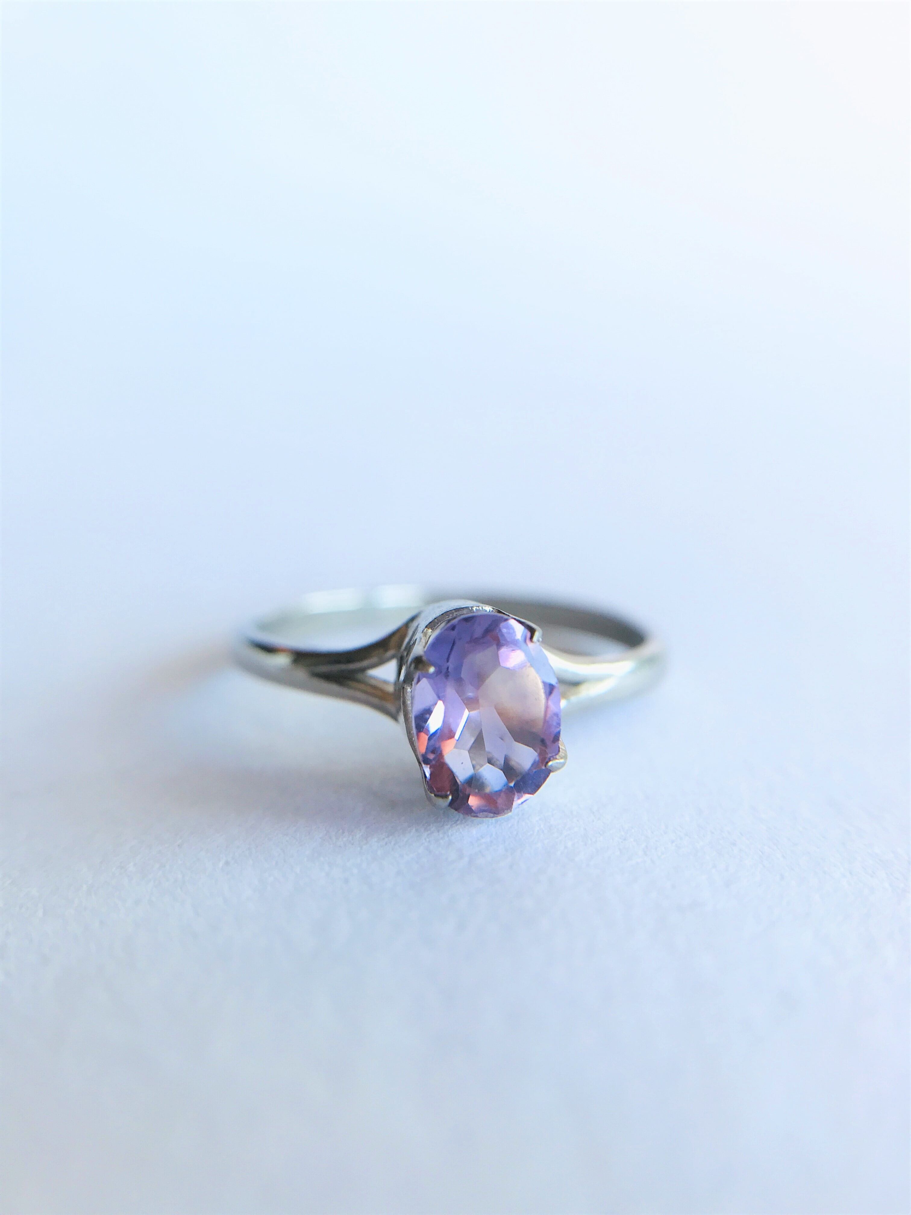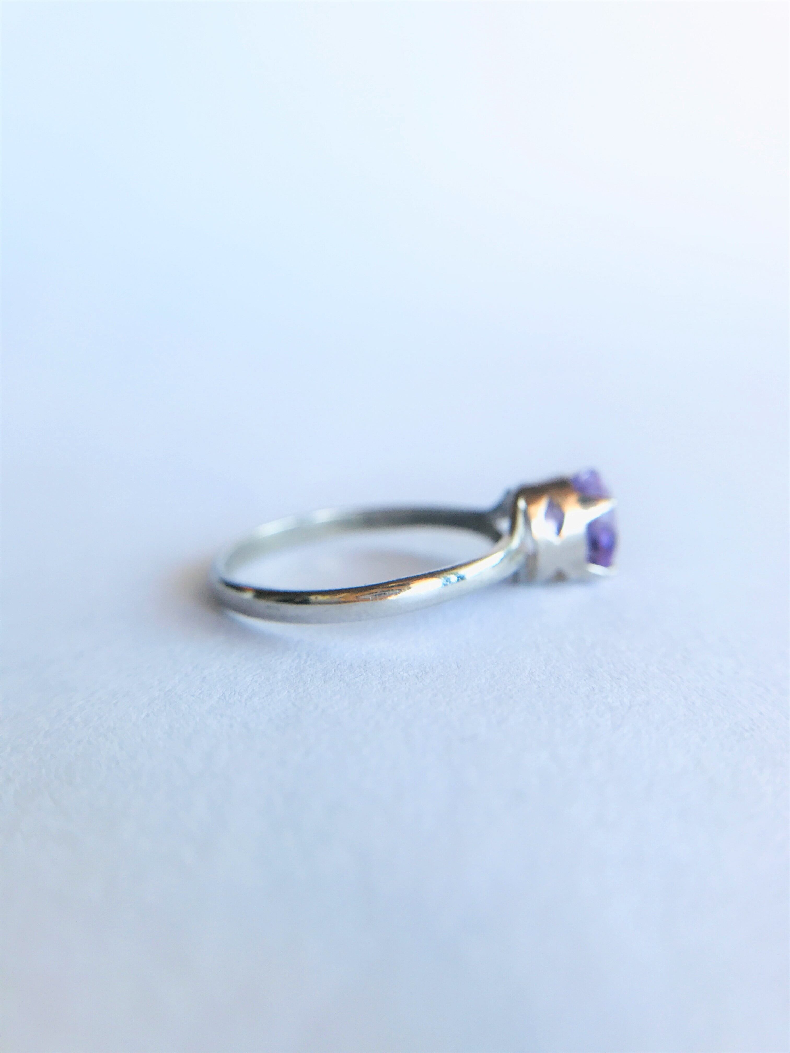 アメジストの紫色の発色はさまざまありますが、こちらのリングは淡いきれいな紫色をしております。オーバル型のアメジストのルースにきれいなカットが入っています。4つの爪で止めてリングに仕上げております。