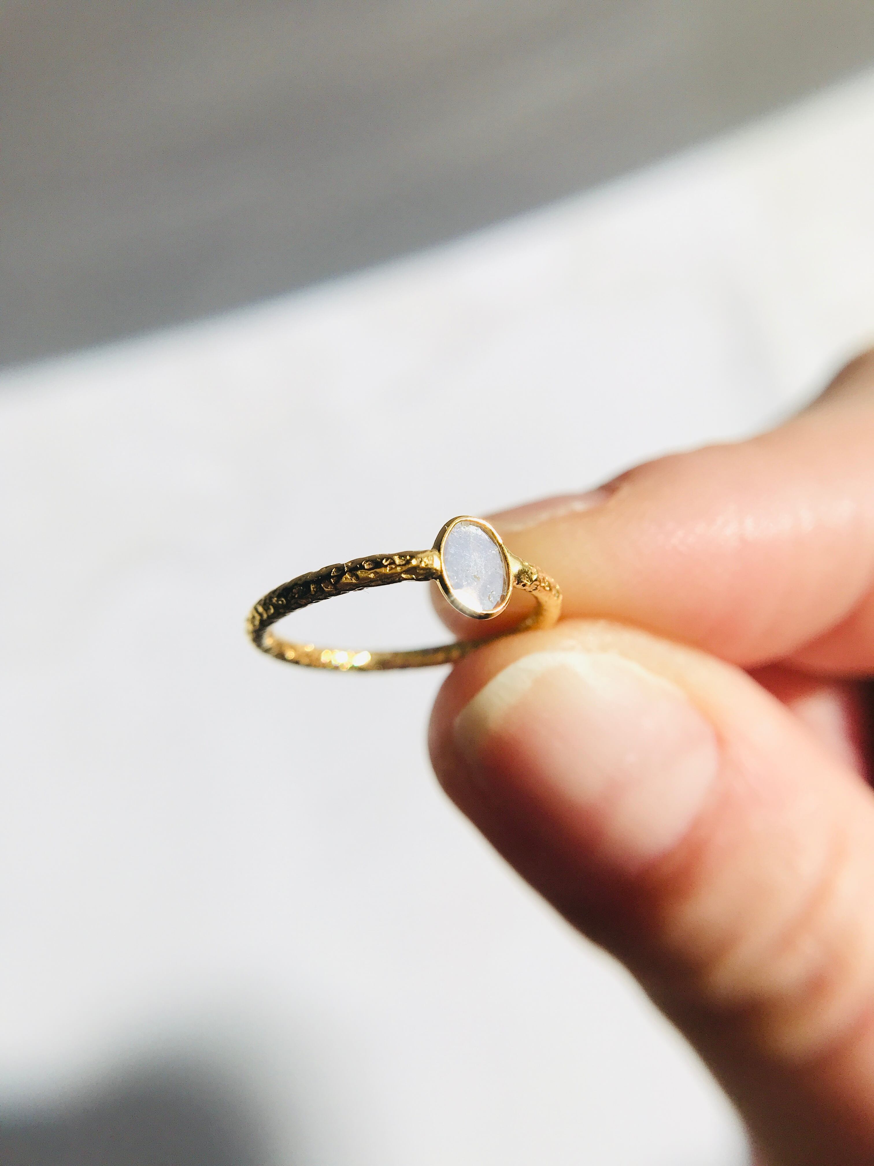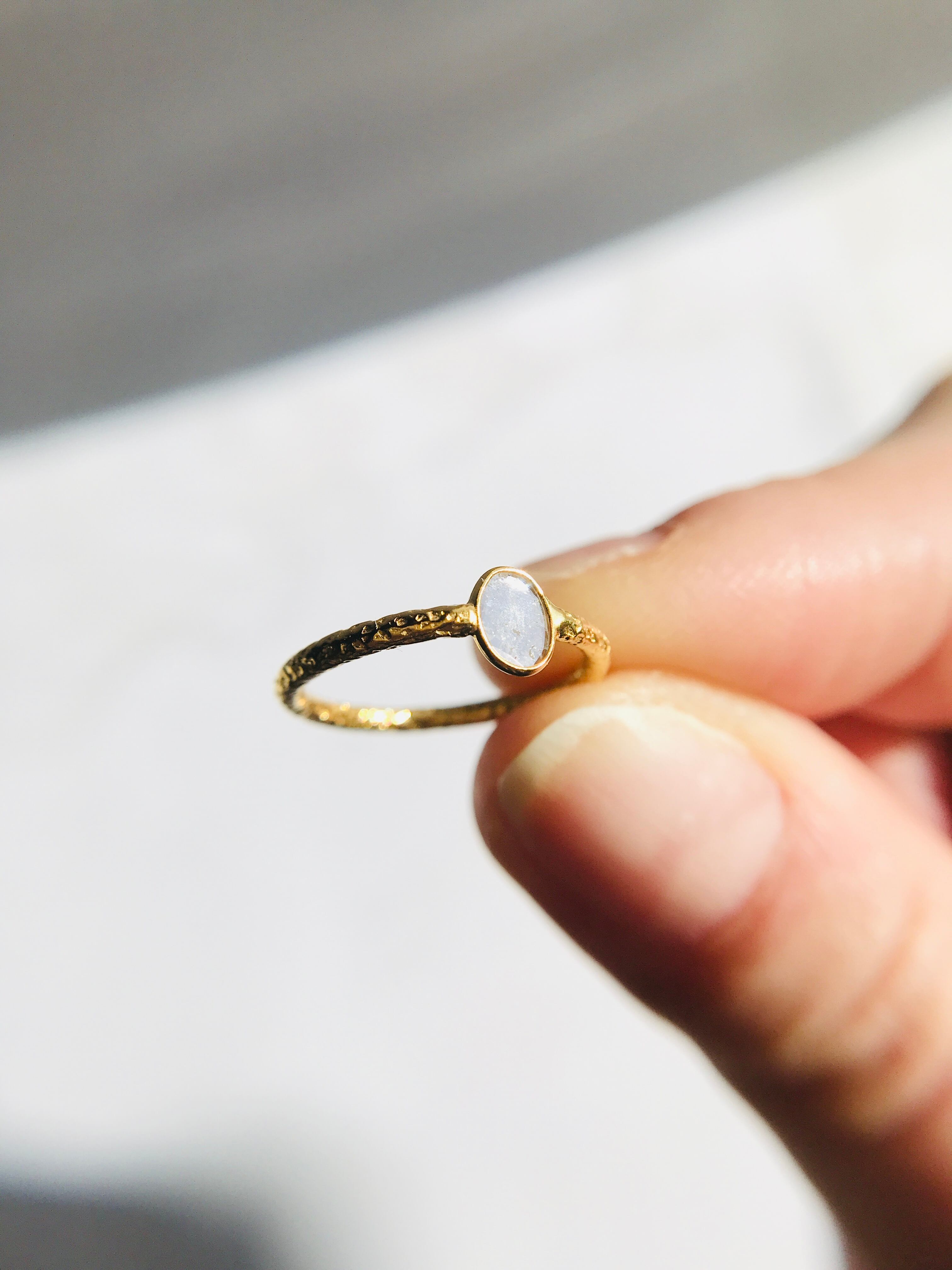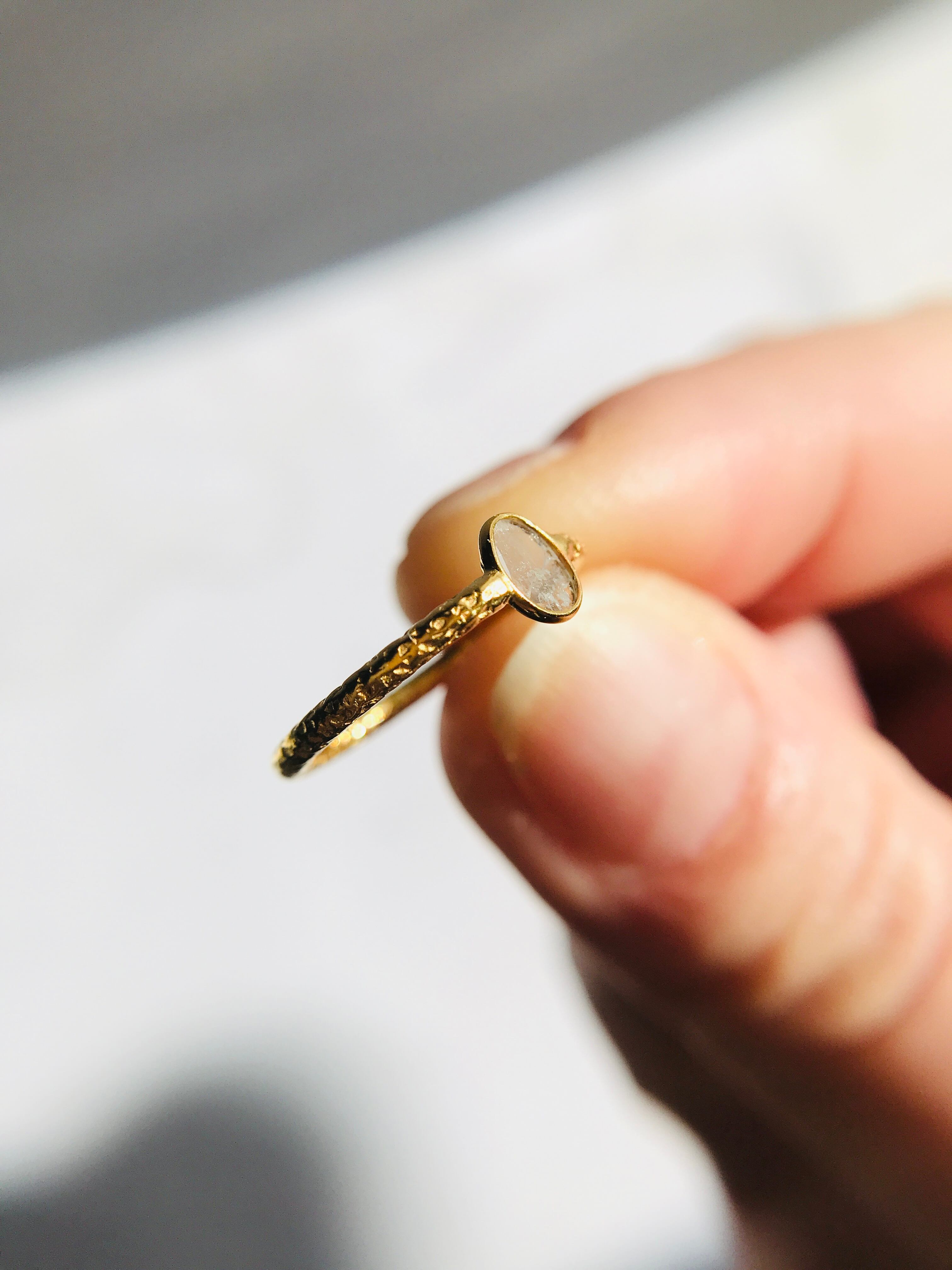 不揃いのスライスダイヤで、中に刻まれている内容物も個々なので、唯一無二のリングとして身に着けていただけます。