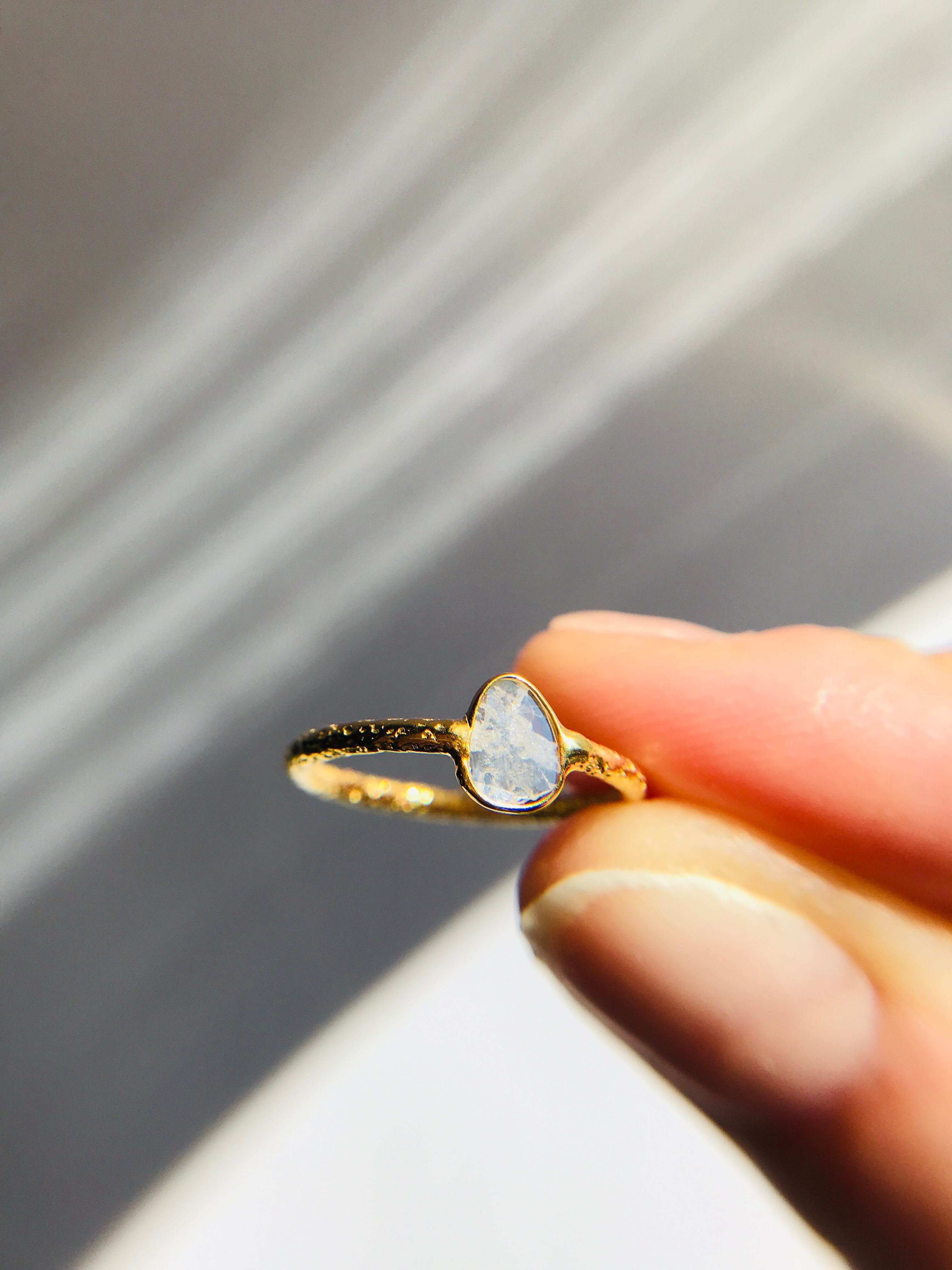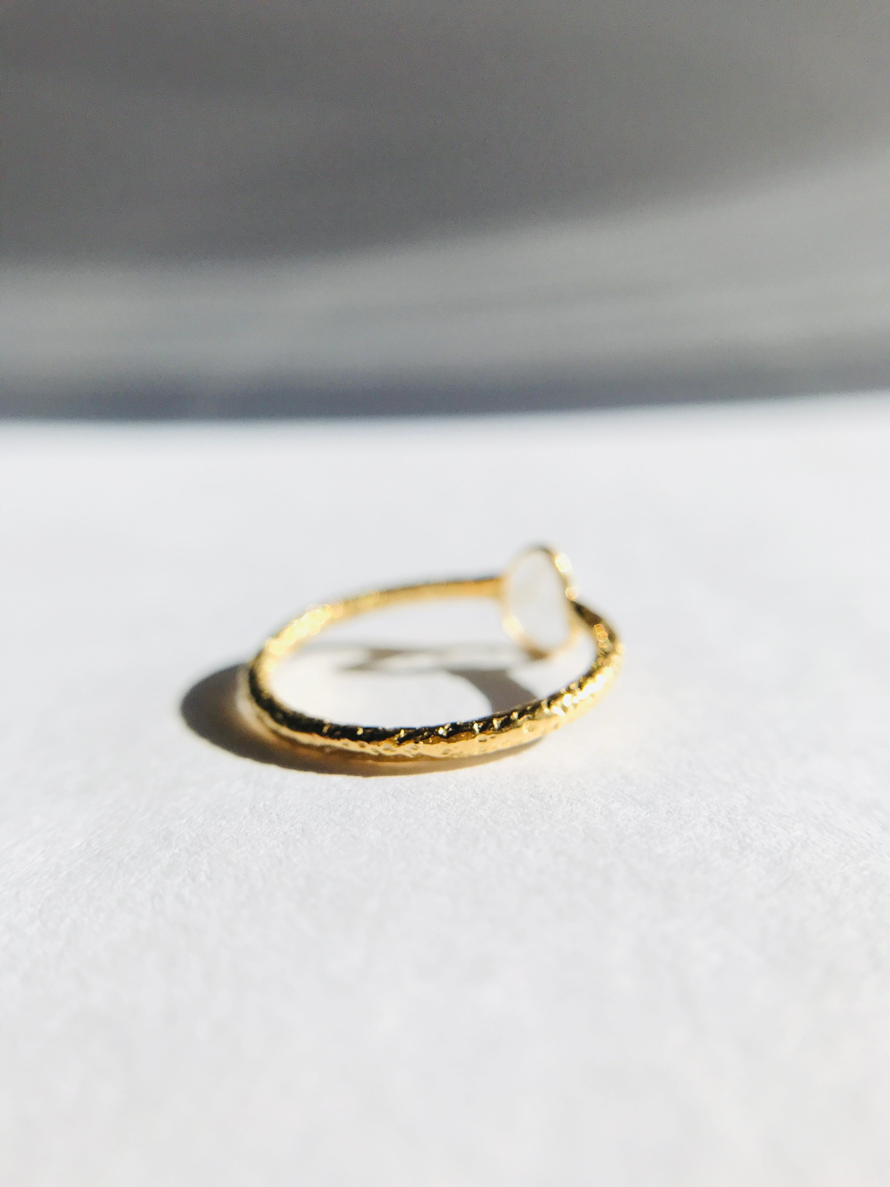 スライスダイヤは、突起が少なく指に馴染みつけごこち抜群なので、普段使いにおすすめです。18Kコーティング素材で指輪を仕上げています。