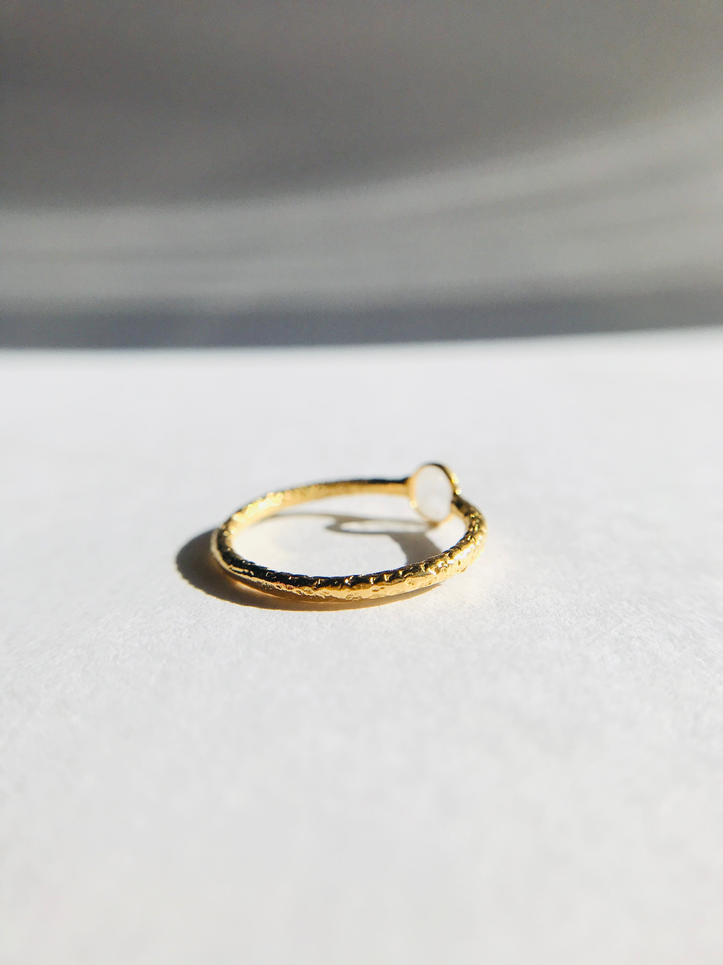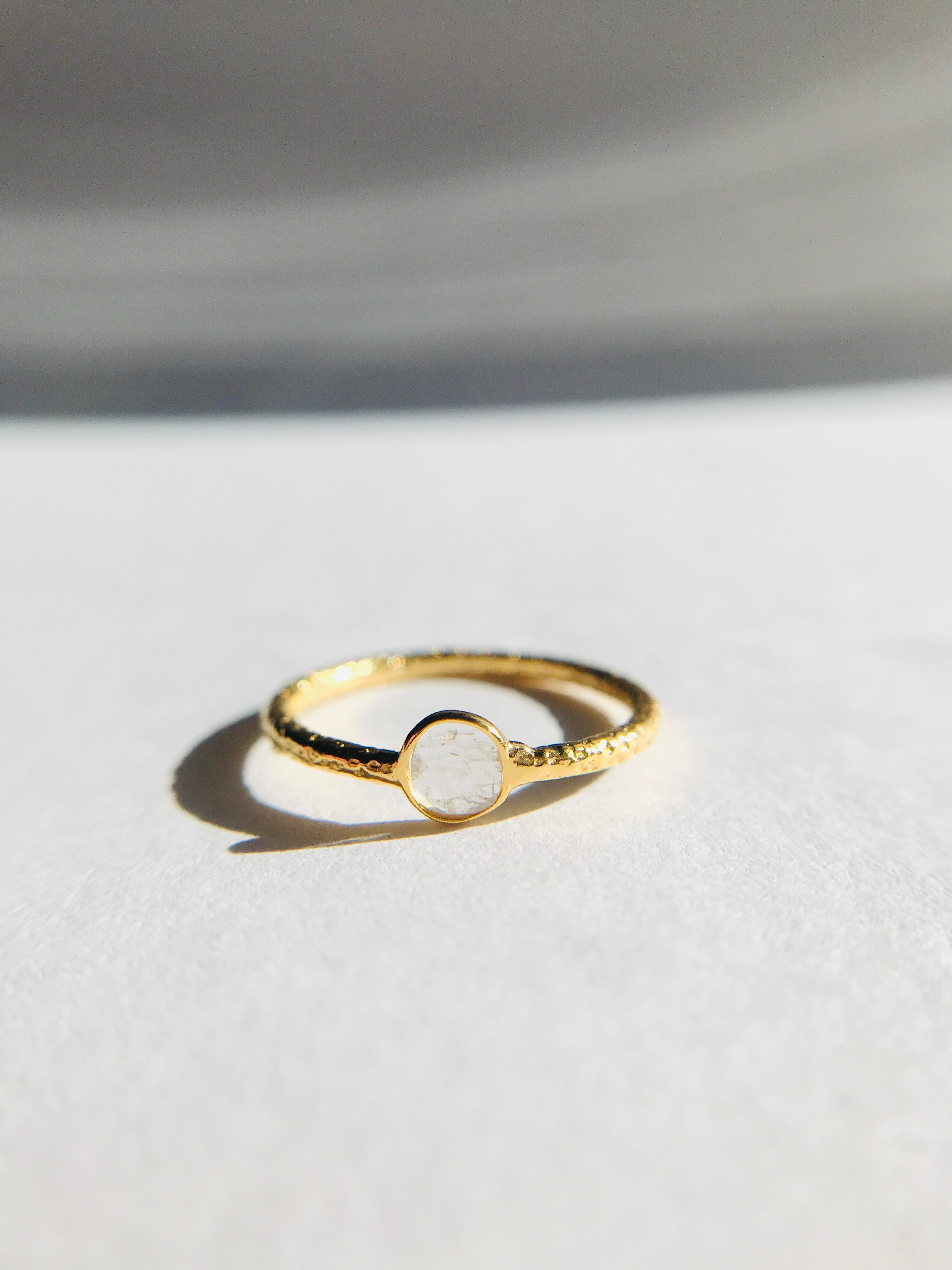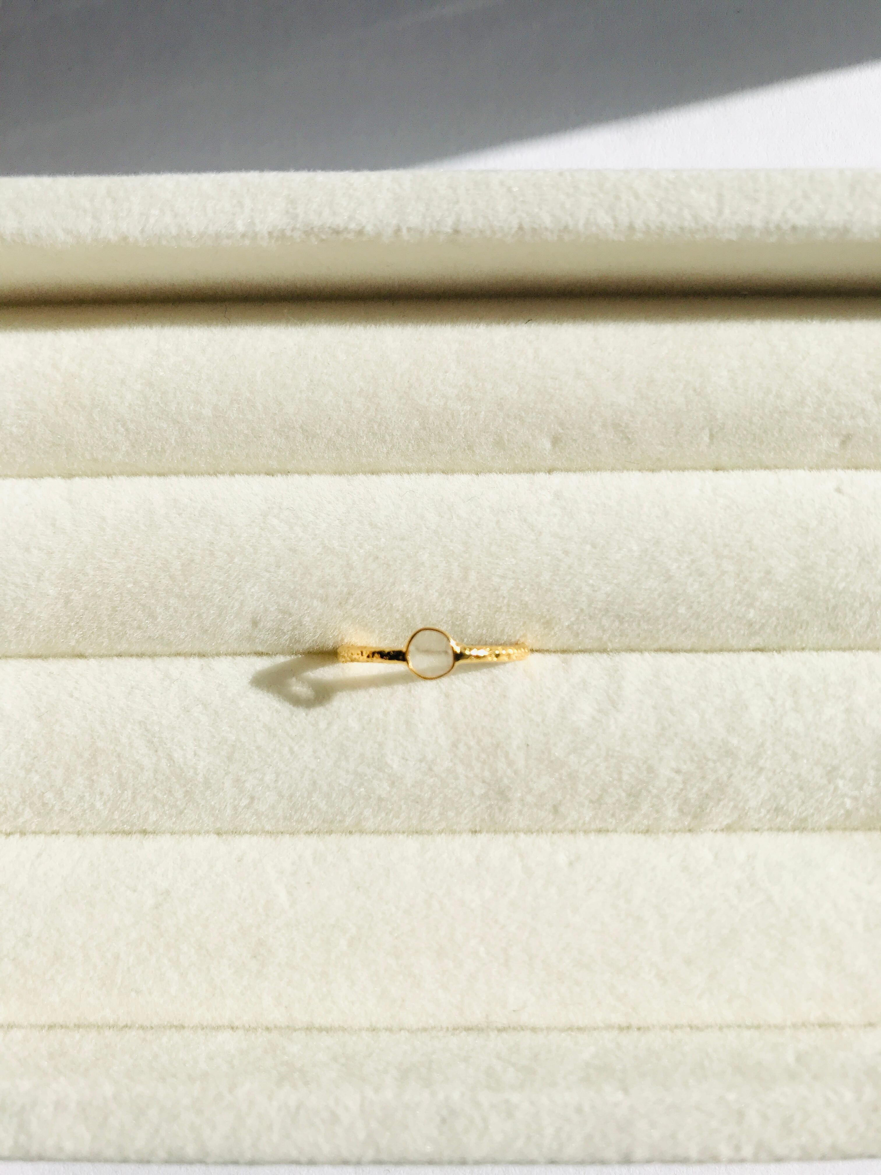 スライスダイヤは、突起が少なく指に馴染みつけごこち抜群なので、普段使いにおすすめです。18Kコーティング素材で指輪を仕上げています。