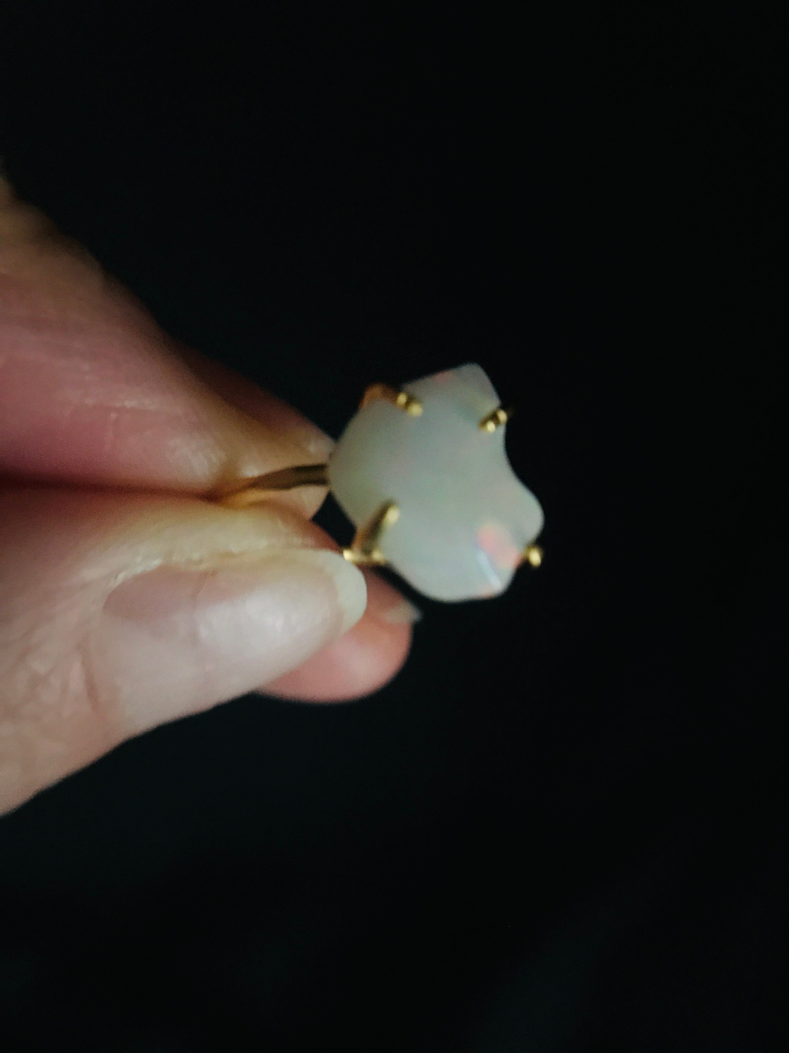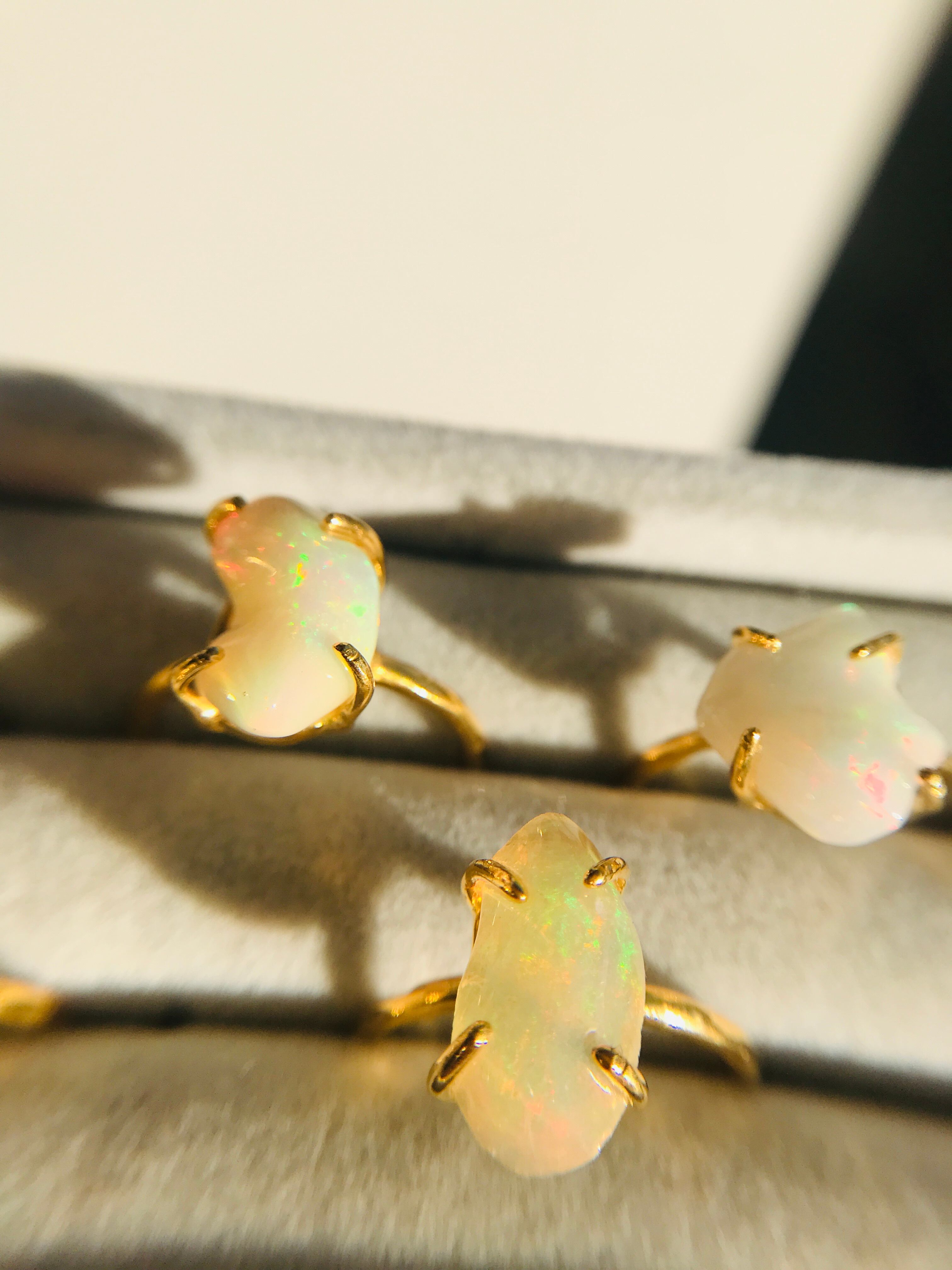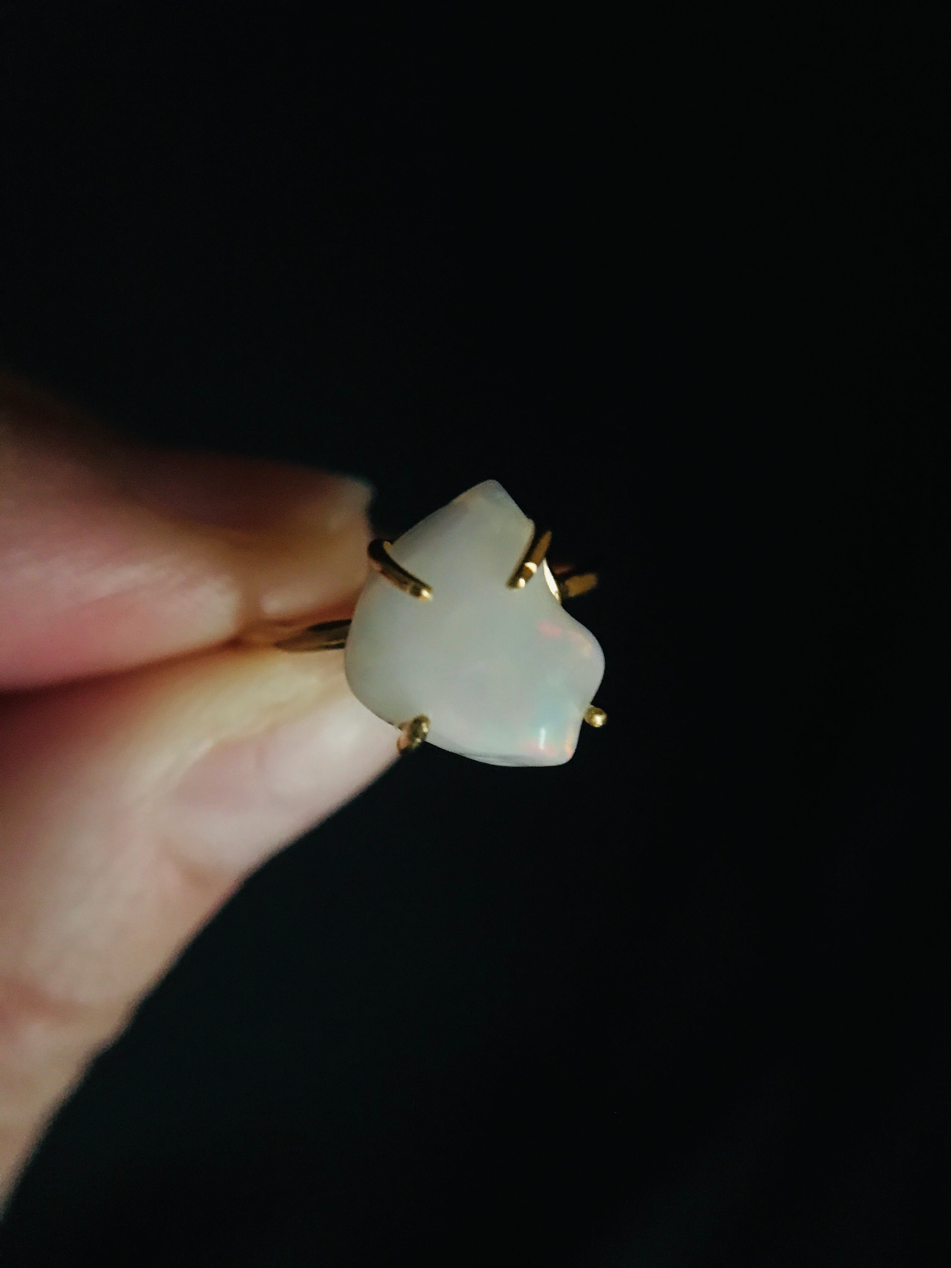 オパールの原石をそのまま、4つの爪でシンプルにリングとして仕上げています。原石らしい自然な形ですので、唯一無二の自分だけのアクセサリーとして身に着けていただけます。