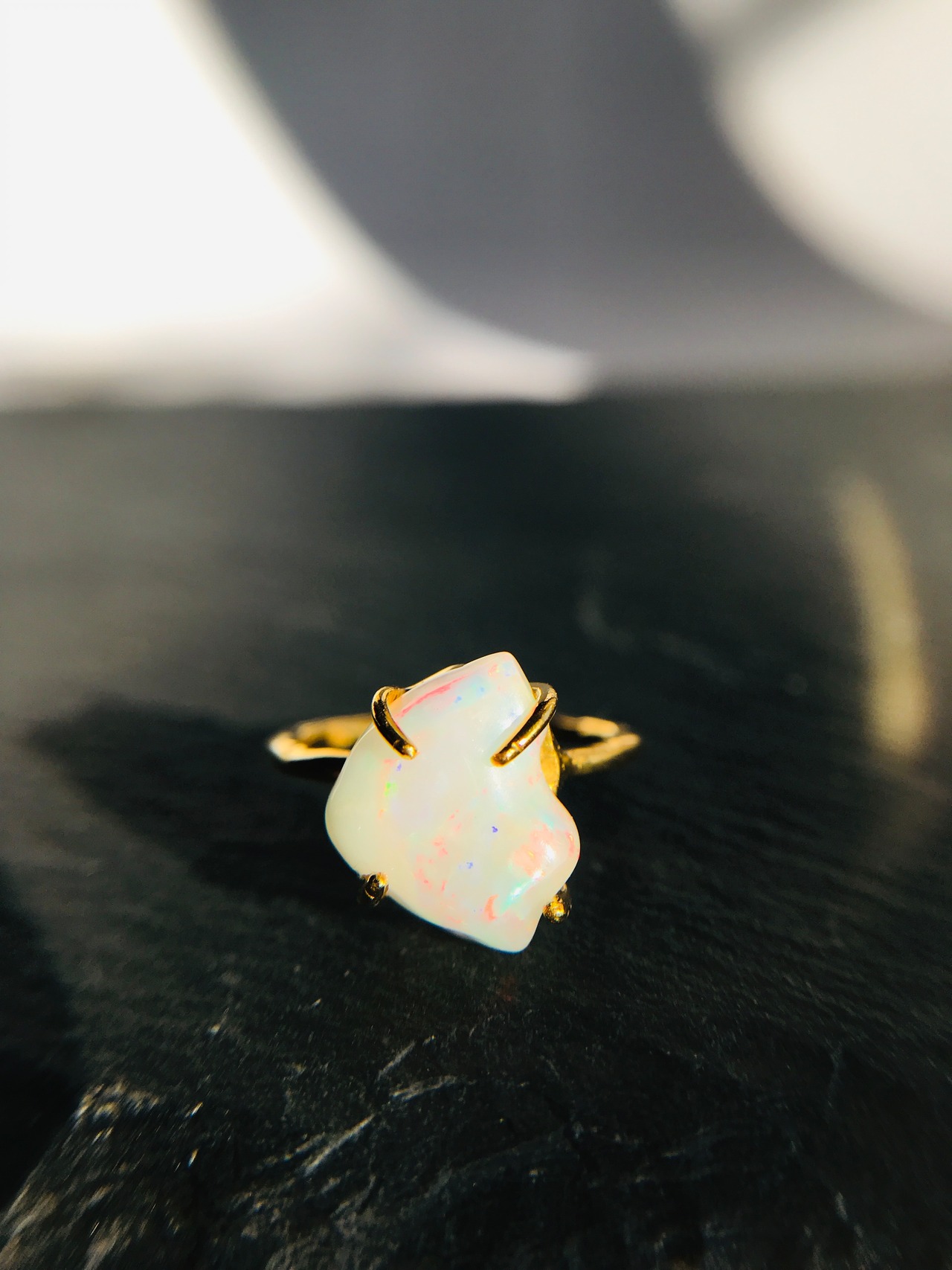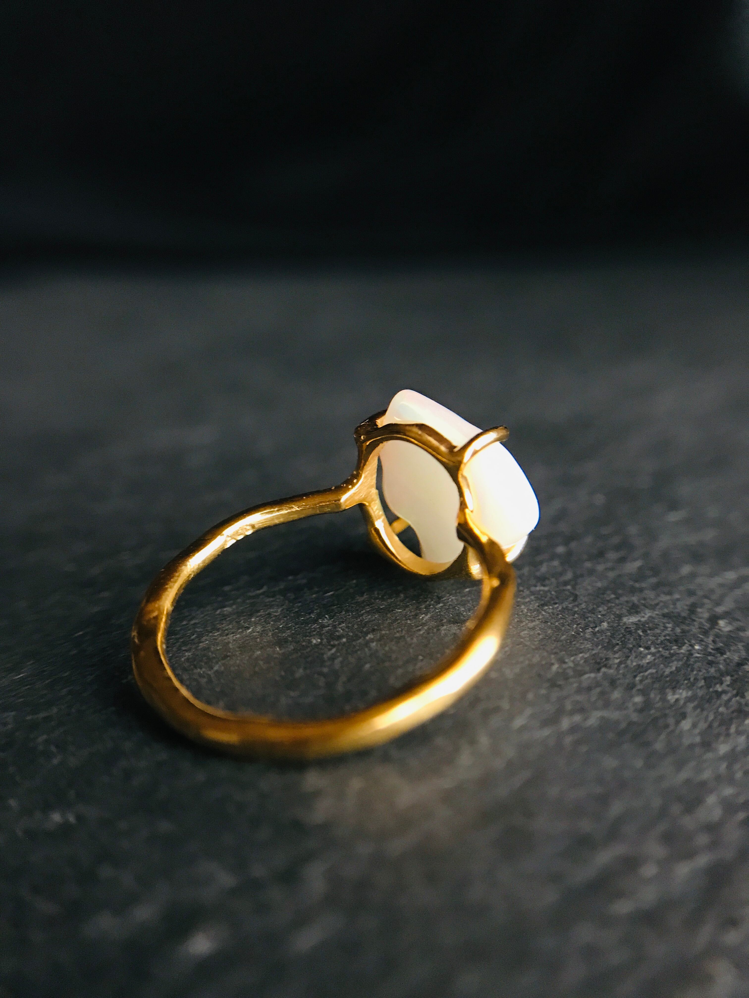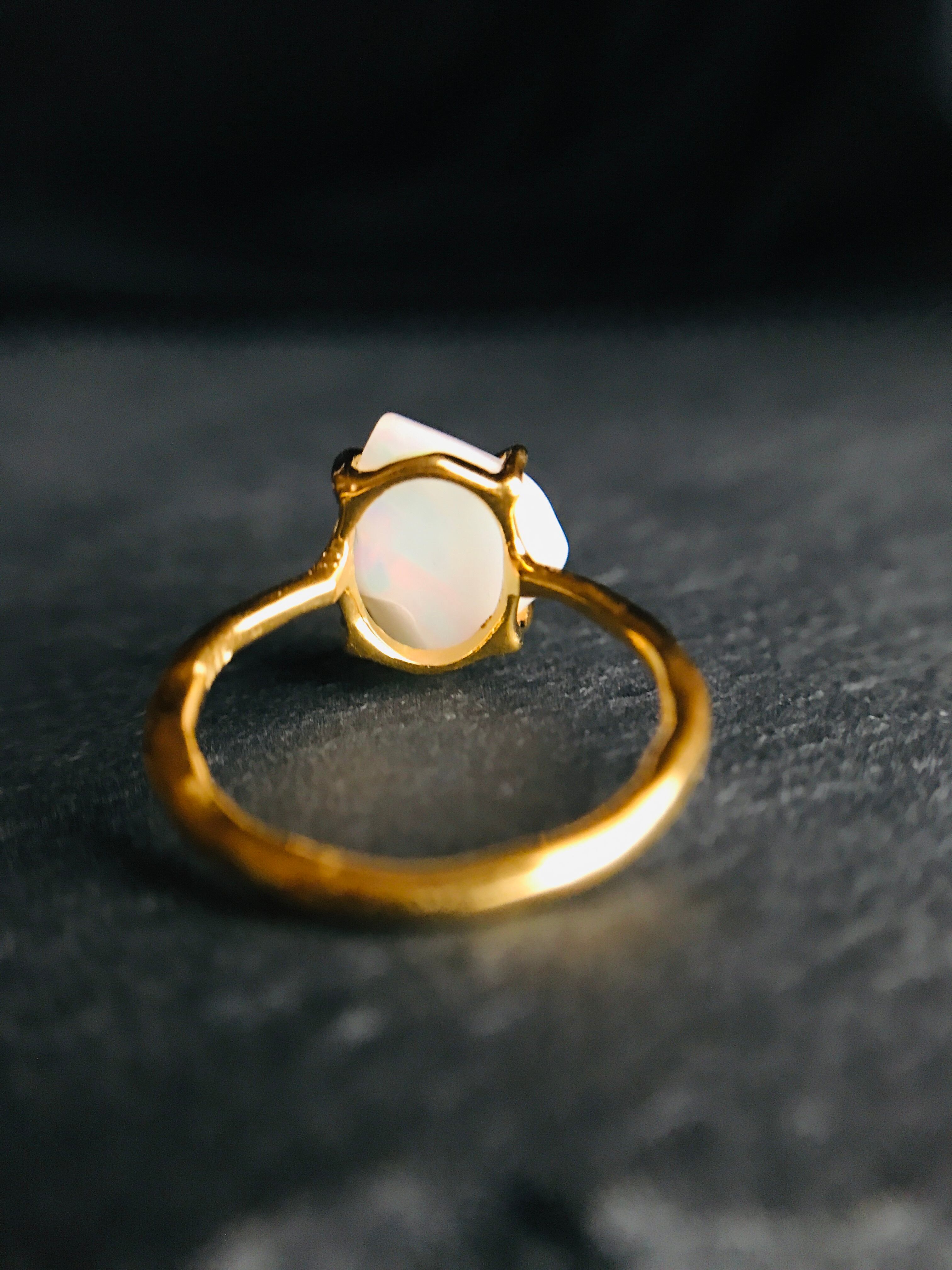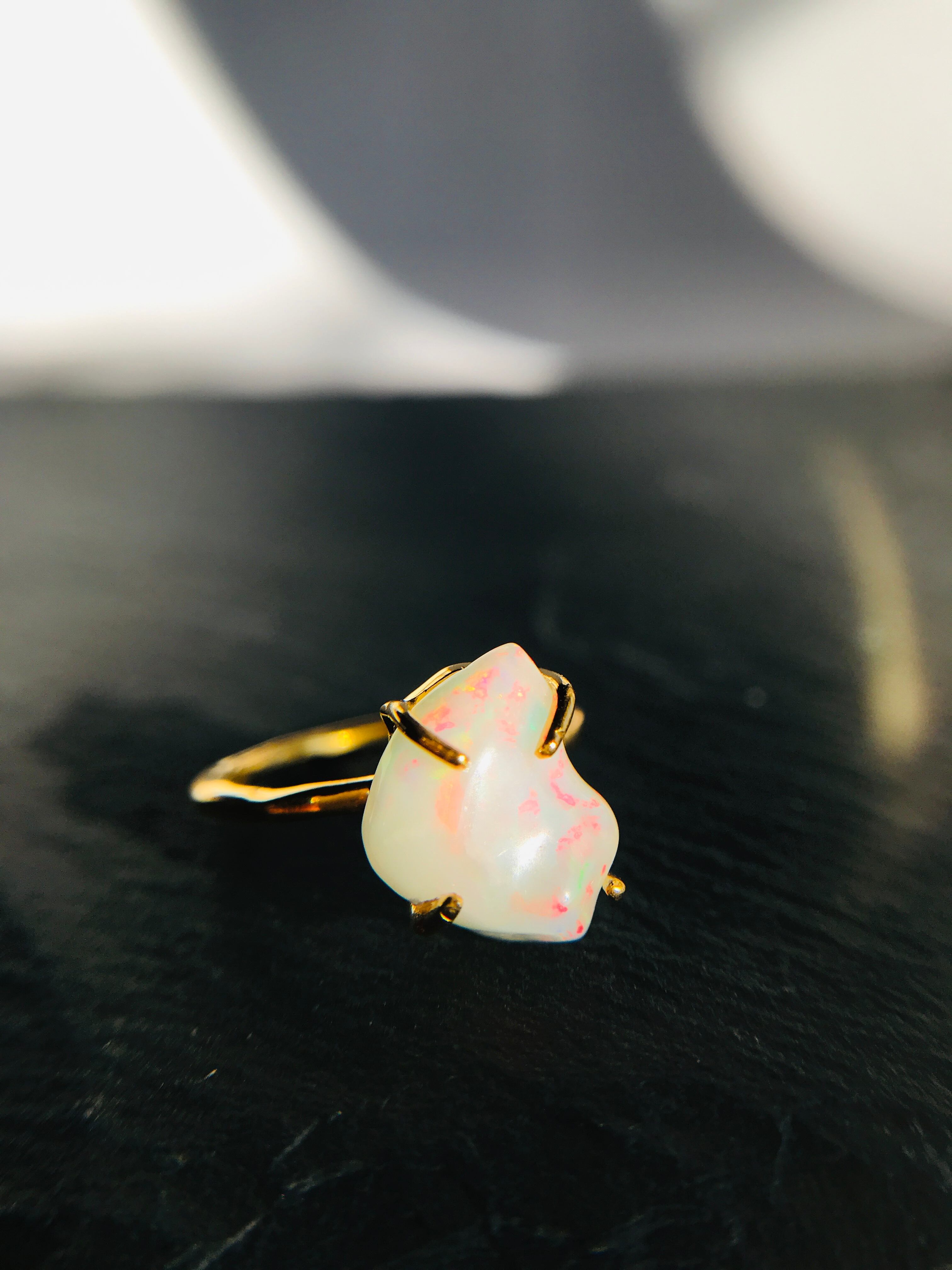 オパールの原石をそのまま、4つの爪でシンプルにリングとして仕上げています。原石らしい自然な形ですので、唯一無二の自分だけのアクセサリーとして身に着けていただけます。