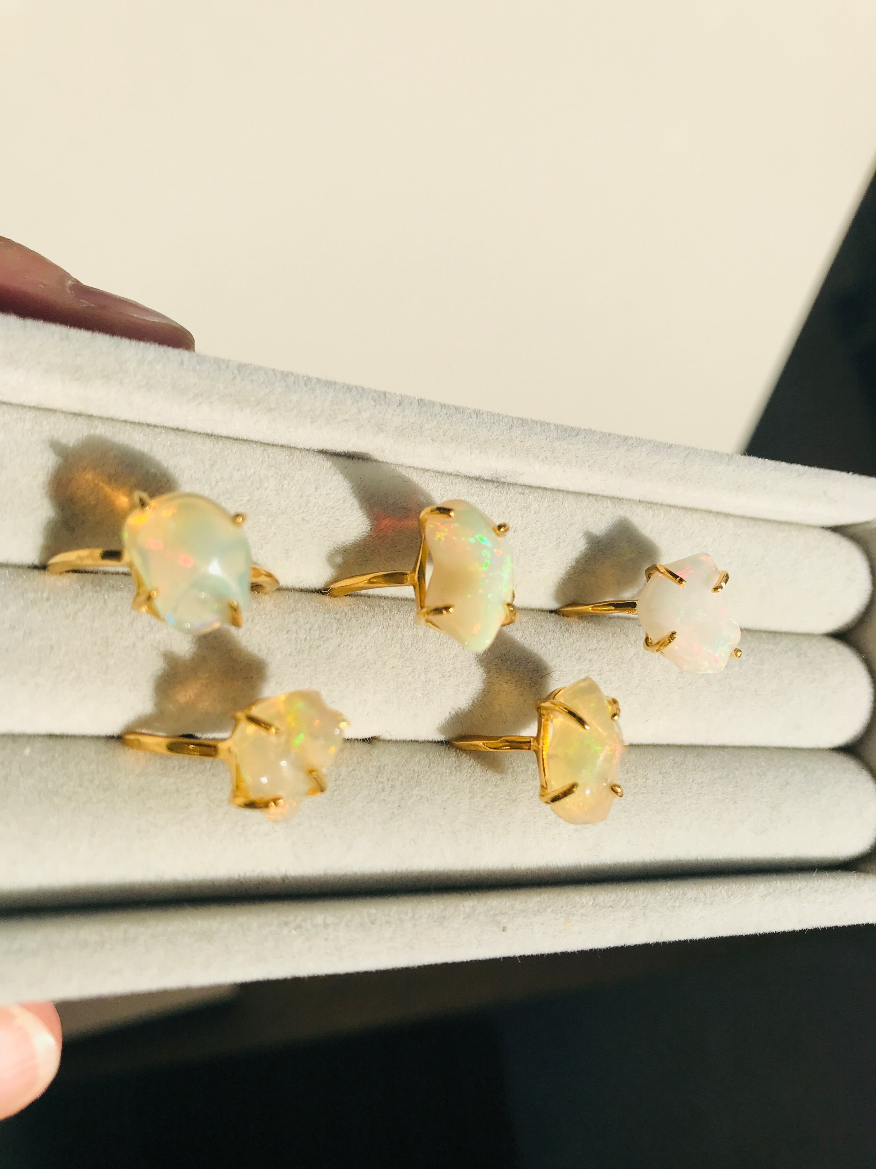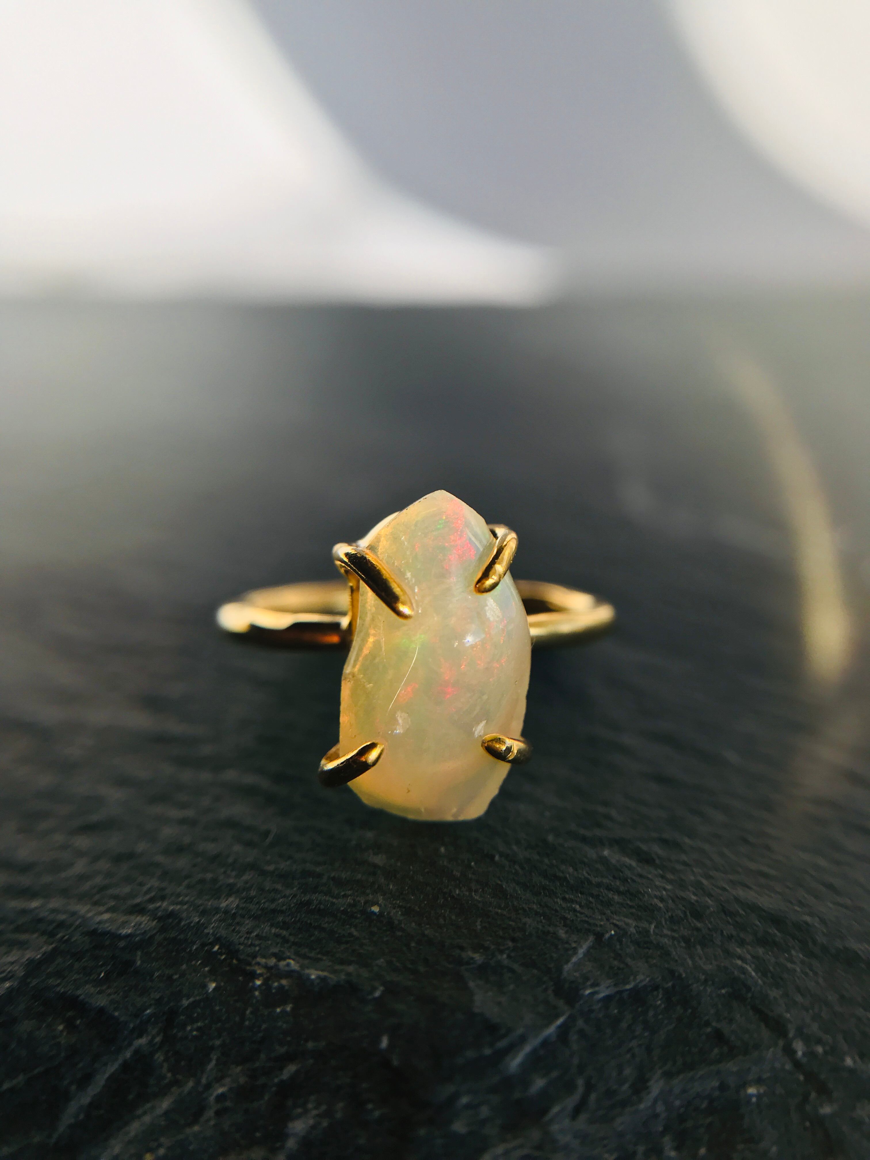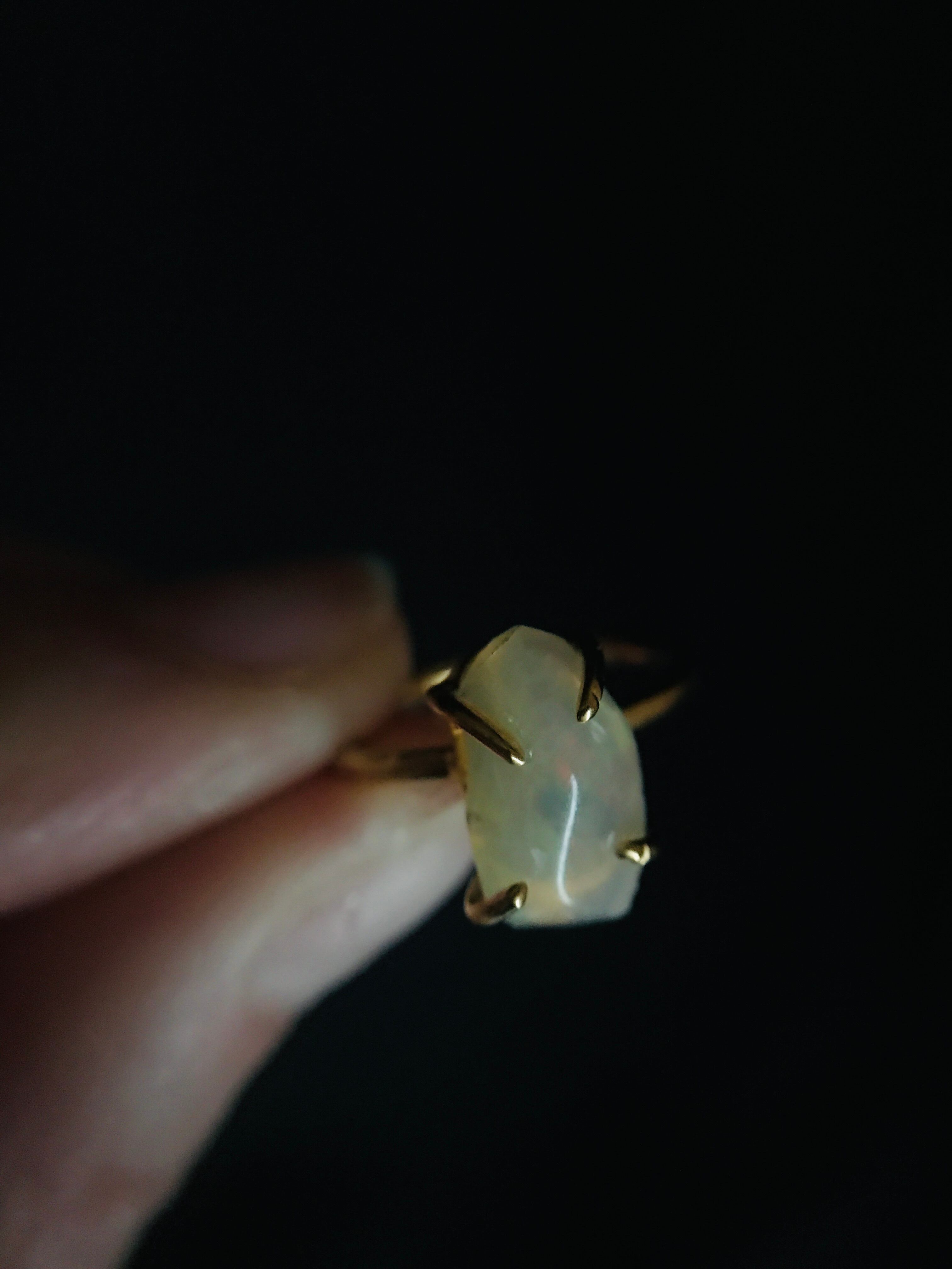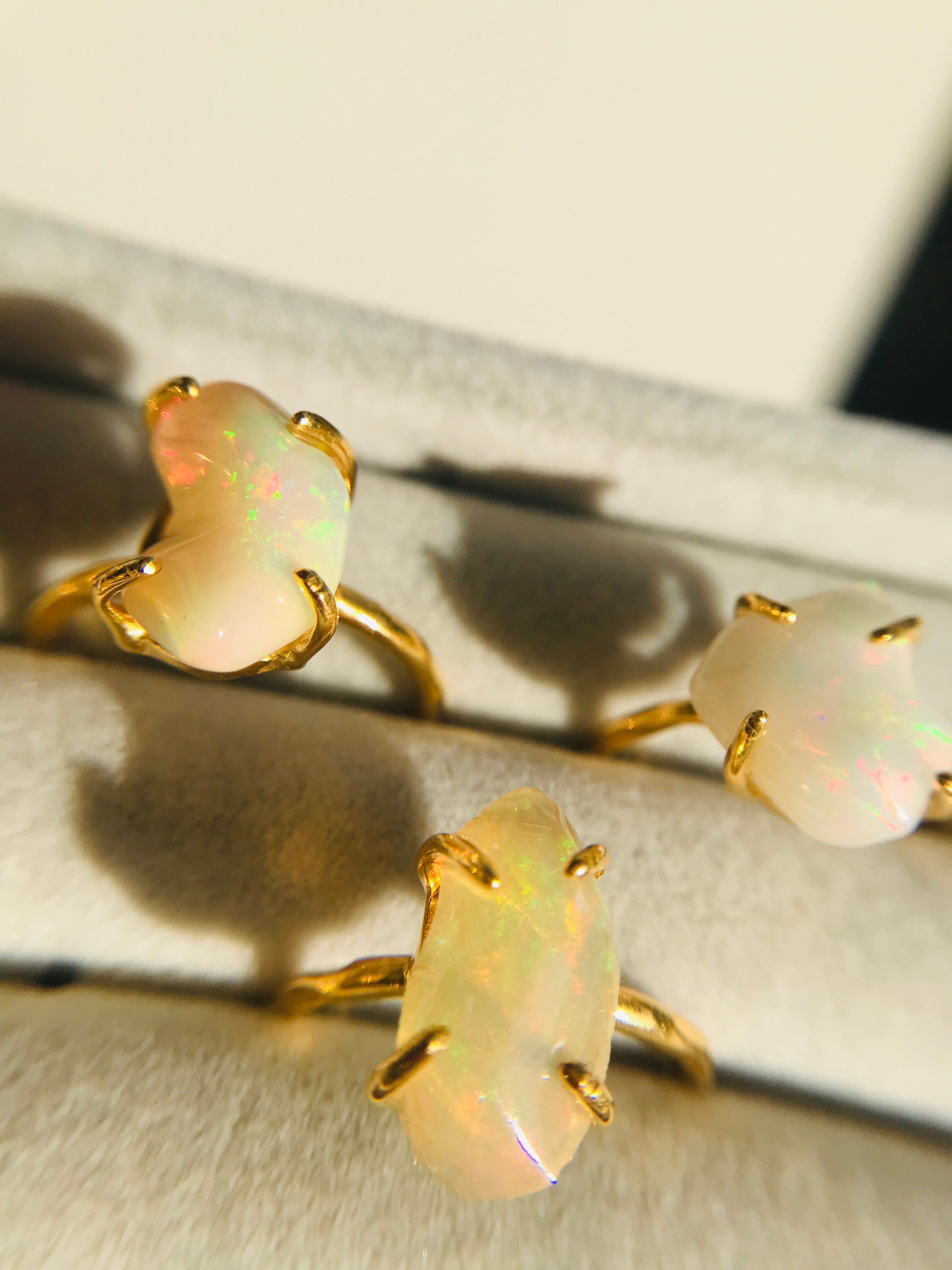 オパールの原石をそのまま、4つの爪でシンプルにリングとして仕上げています。原石らしい自然な形ですので、唯一無二の自分だけのアクセサリーとして身に着けていただけます。