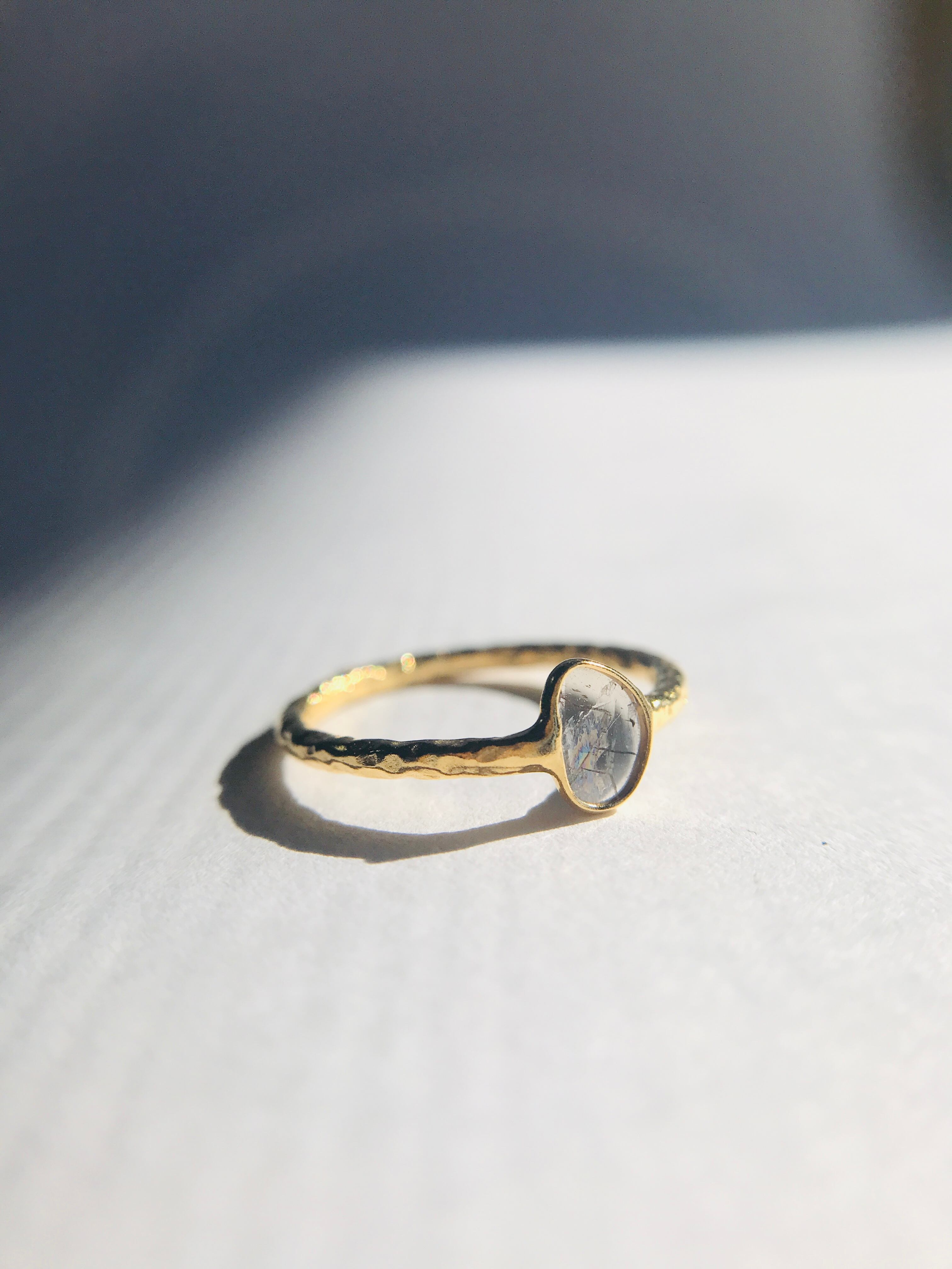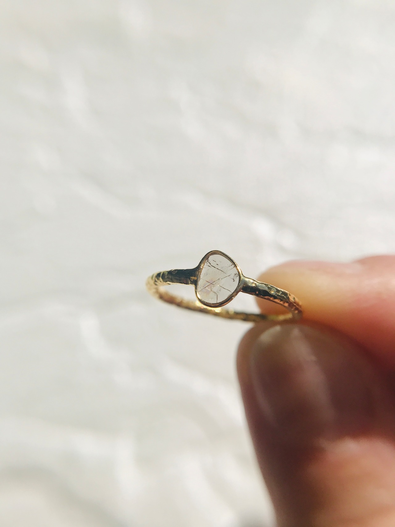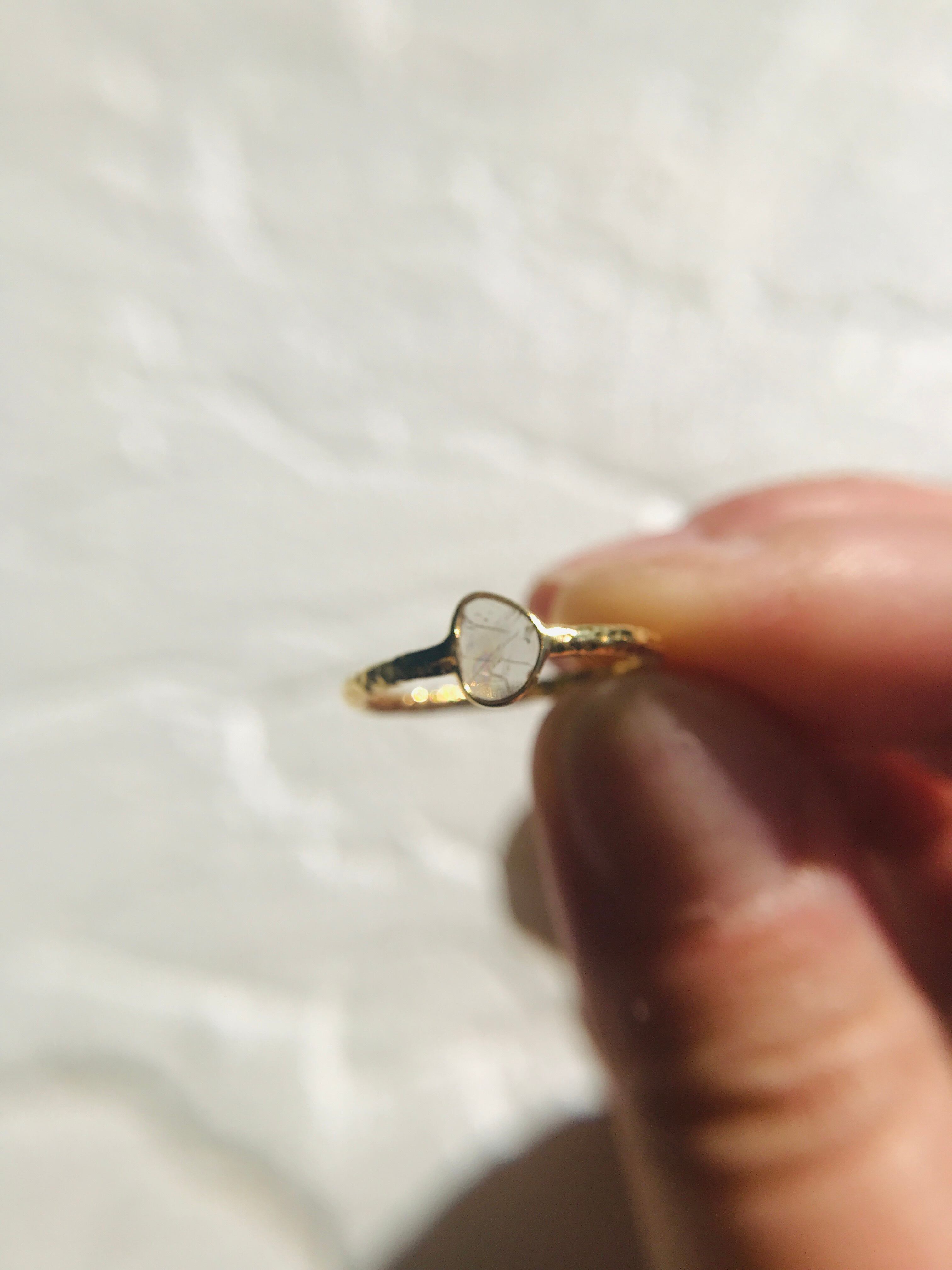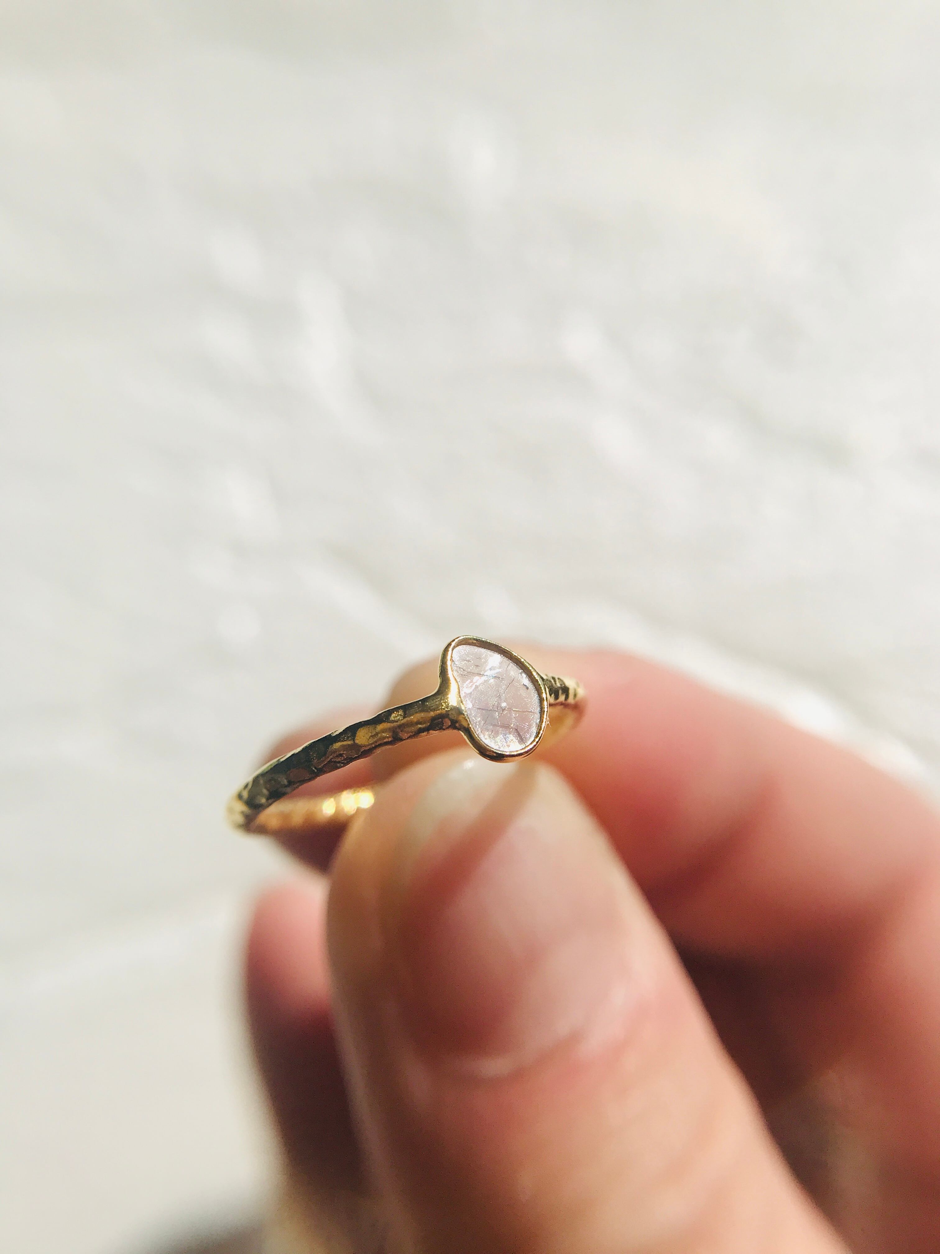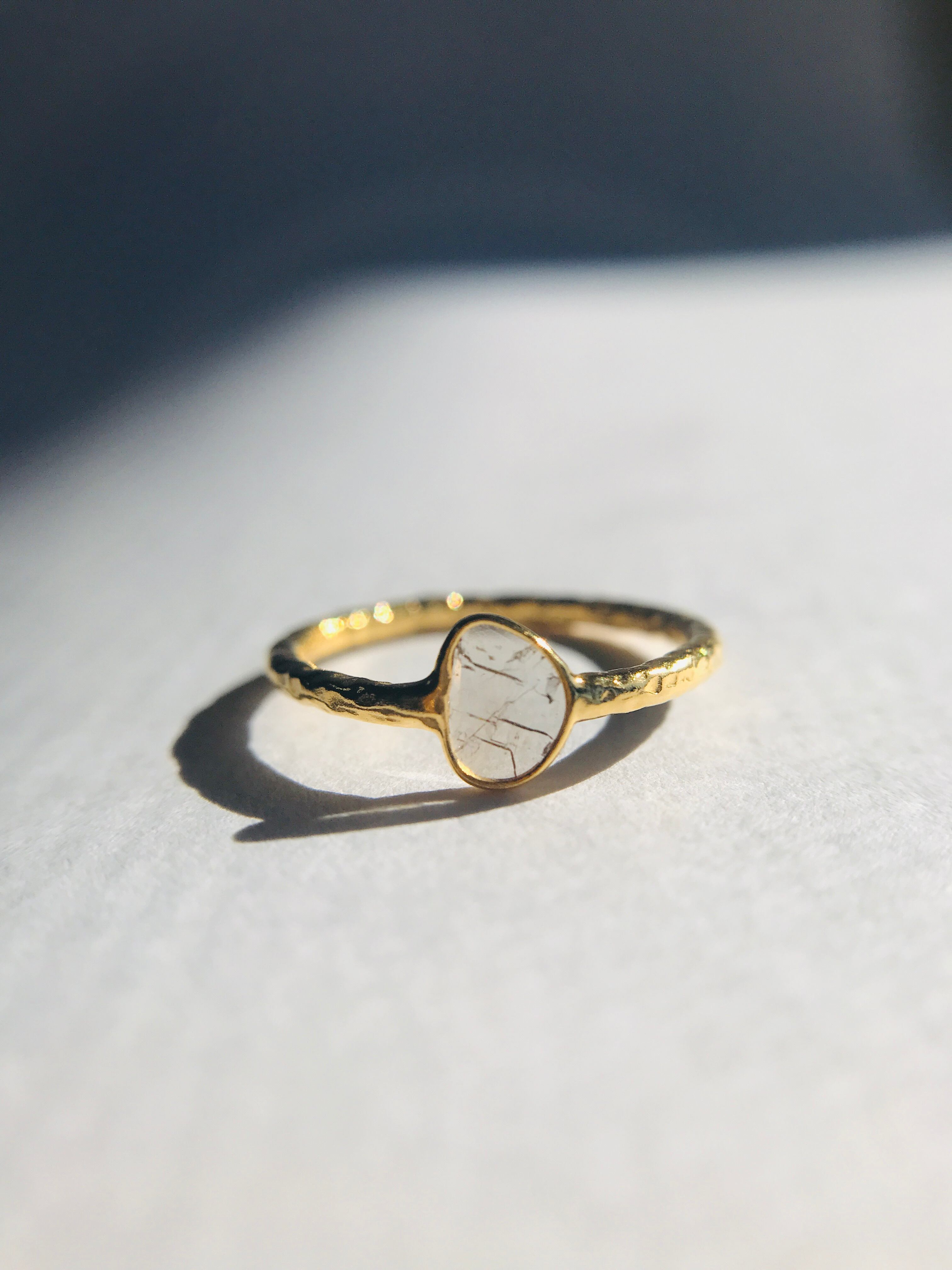 不揃いのスライスダイヤで、中に刻まれている内容物も個々なので、唯一無二のリングとして身に着けていただけます。