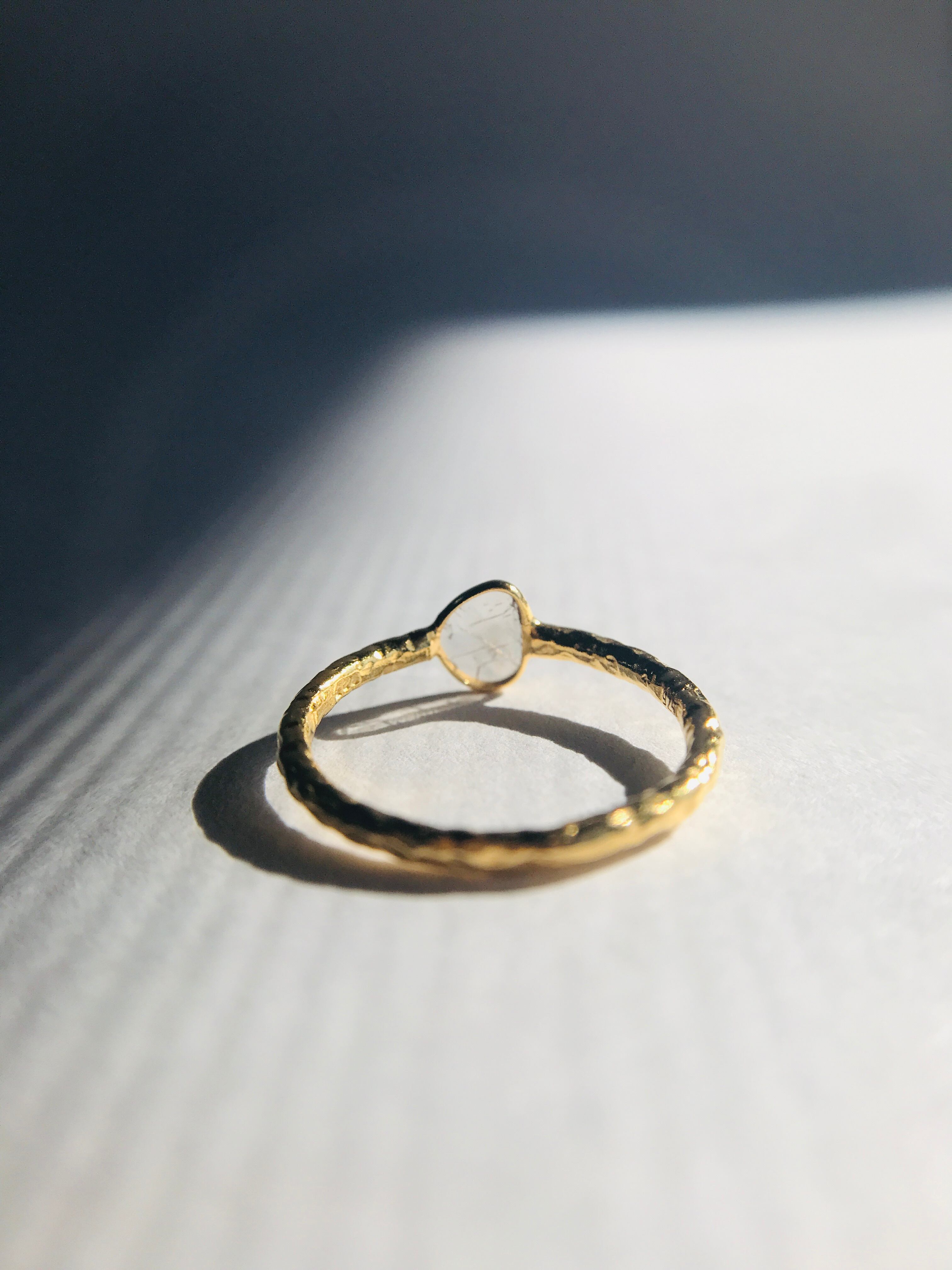 スライスダイヤは、突起が少なく指に馴染みつけごこち抜群なので、普段使いにおすすめです。18Kコーティング素材で指輪を仕上げています。