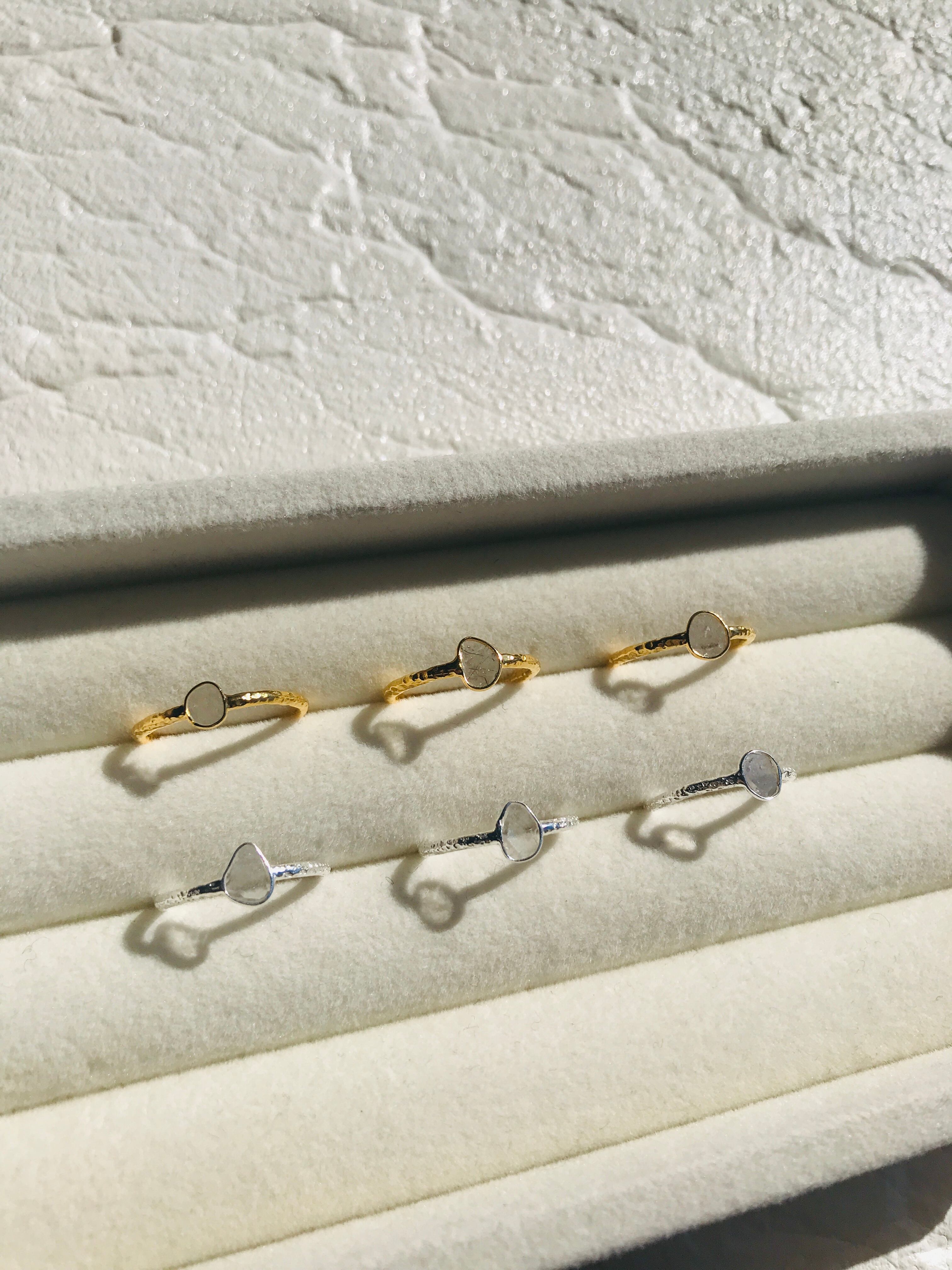 不揃いのスライスダイヤで、中に刻まれている内容物も個々なので、唯一無二のリングとして身に着けていただけます。