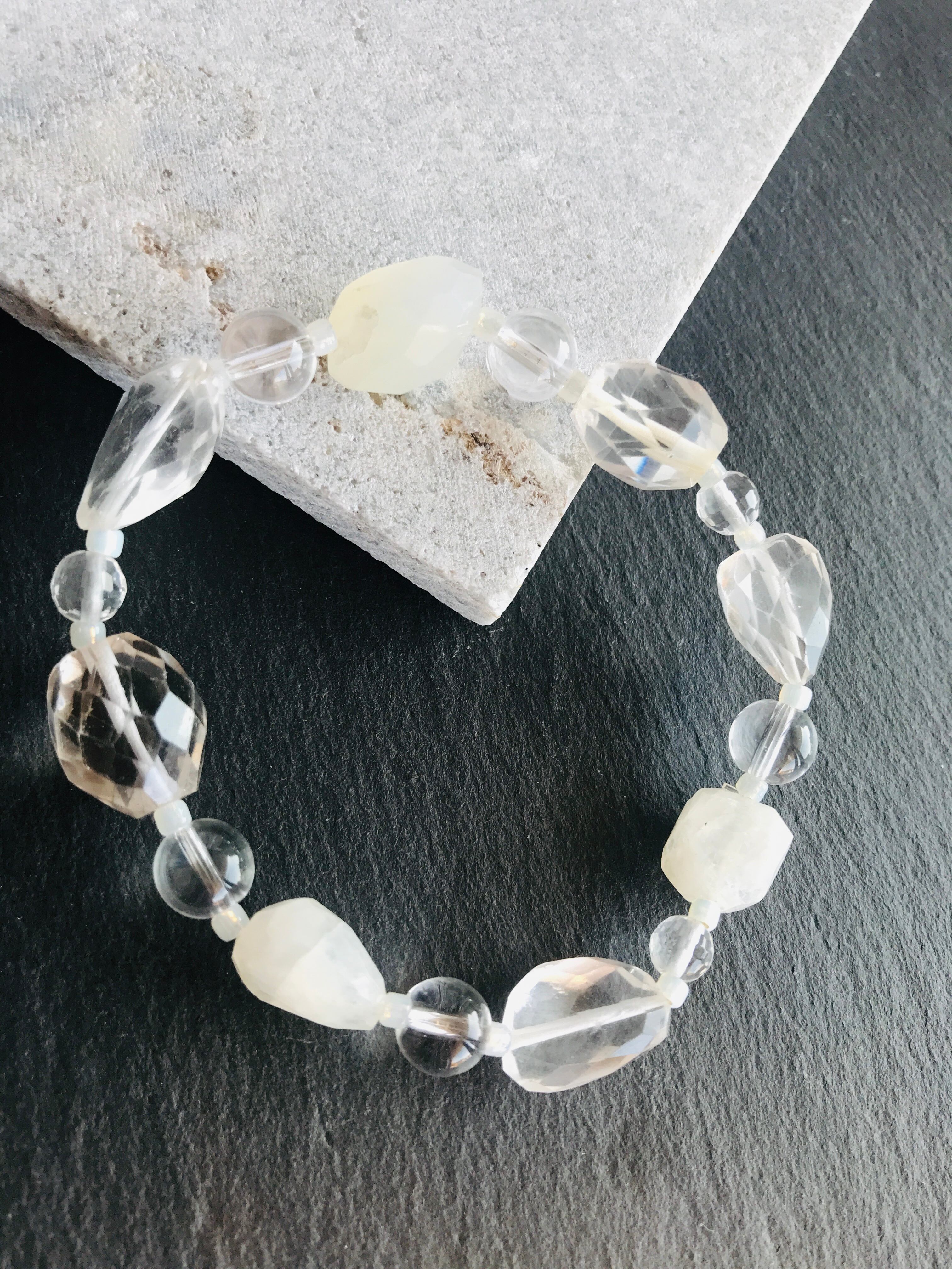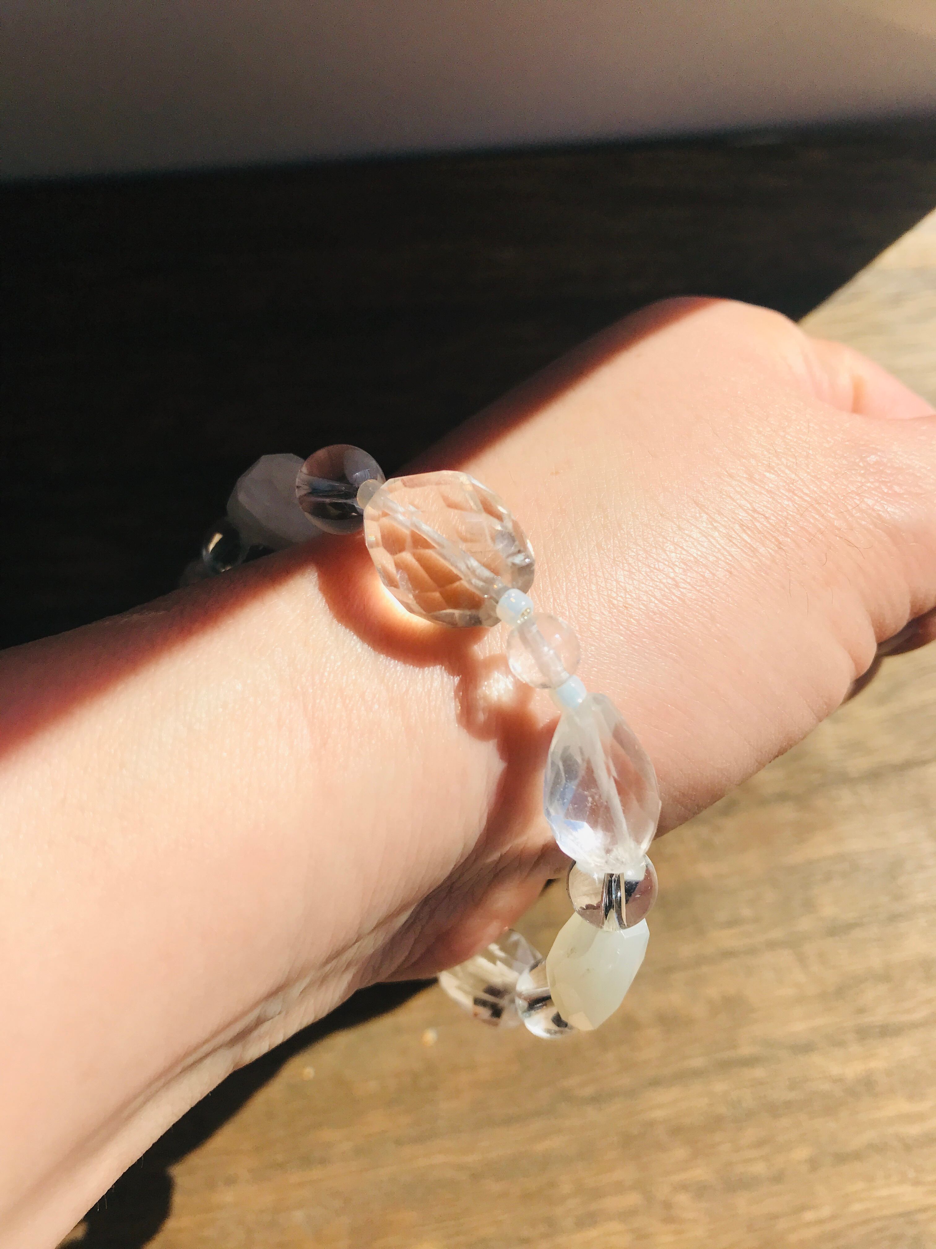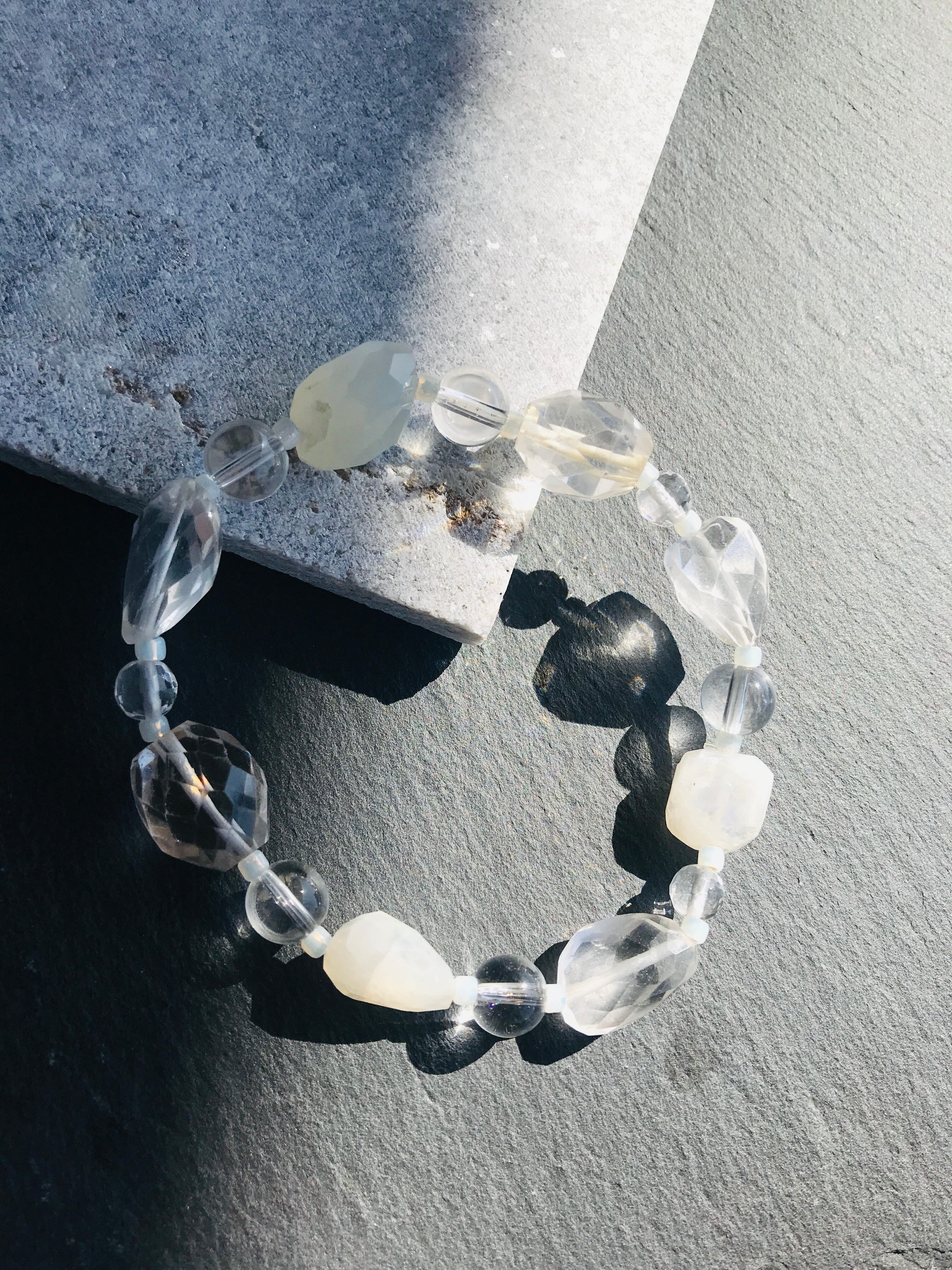 クリスタルとムーンストーンを組み合わせた洗練されたブレスレット。