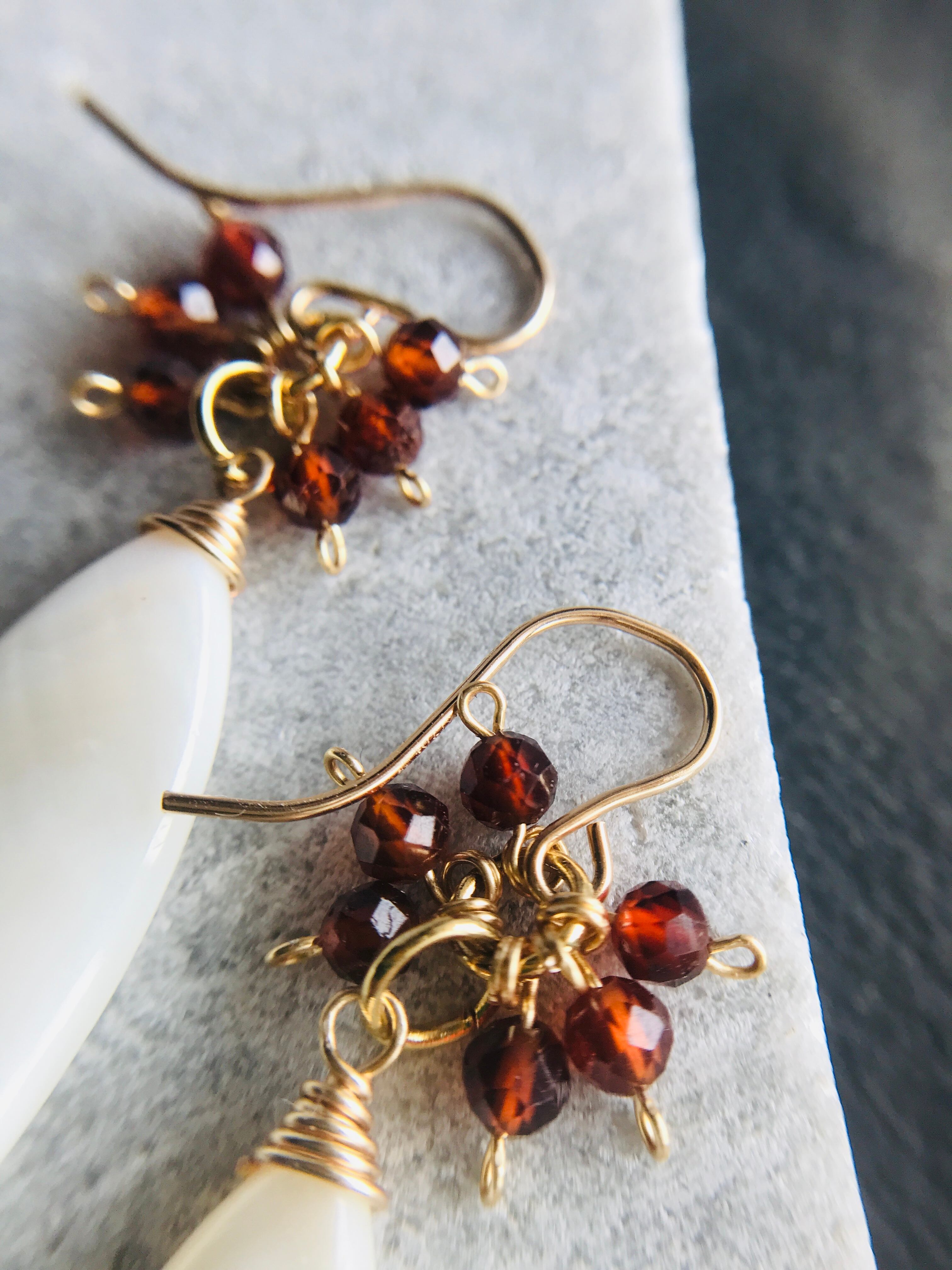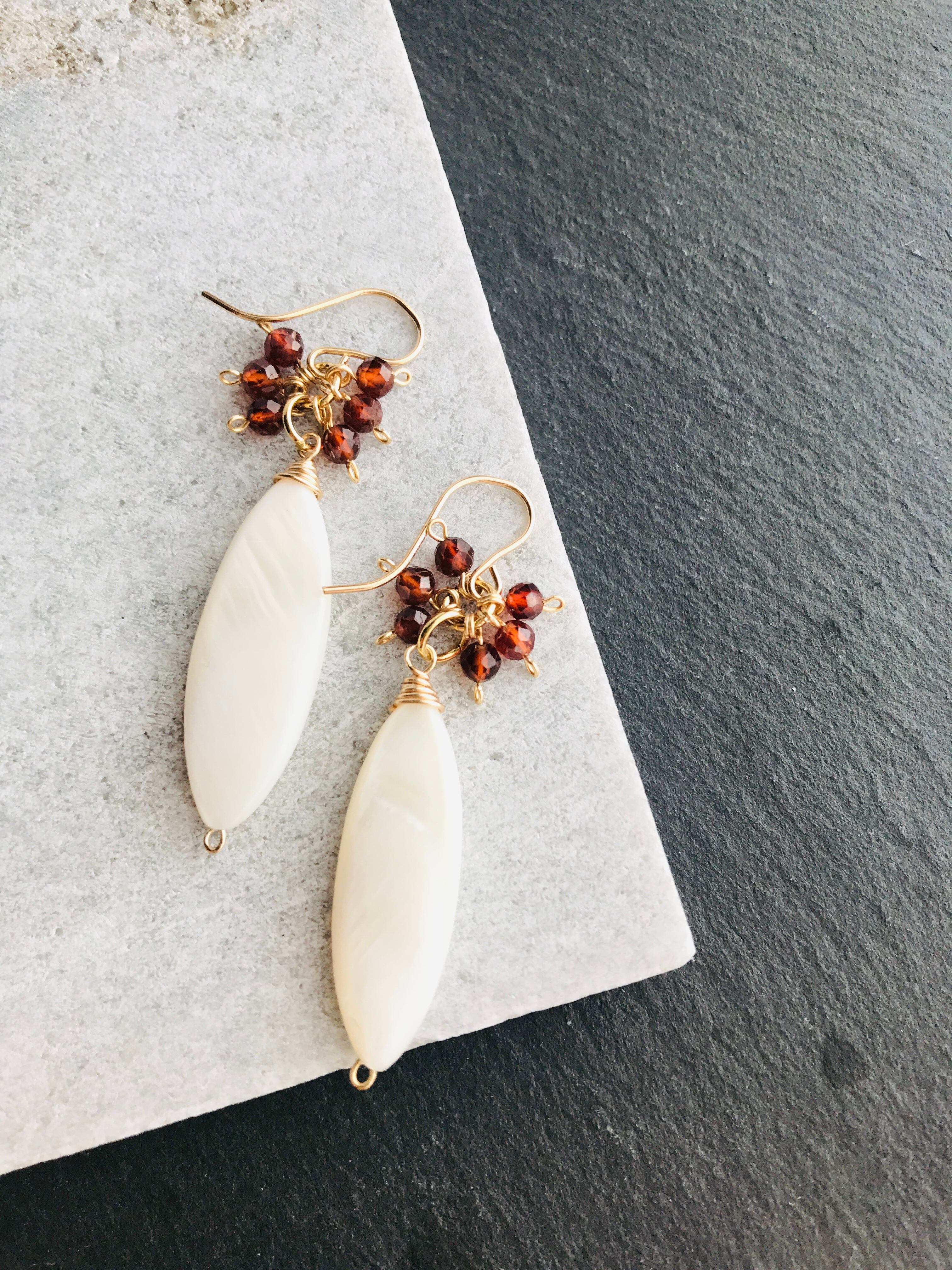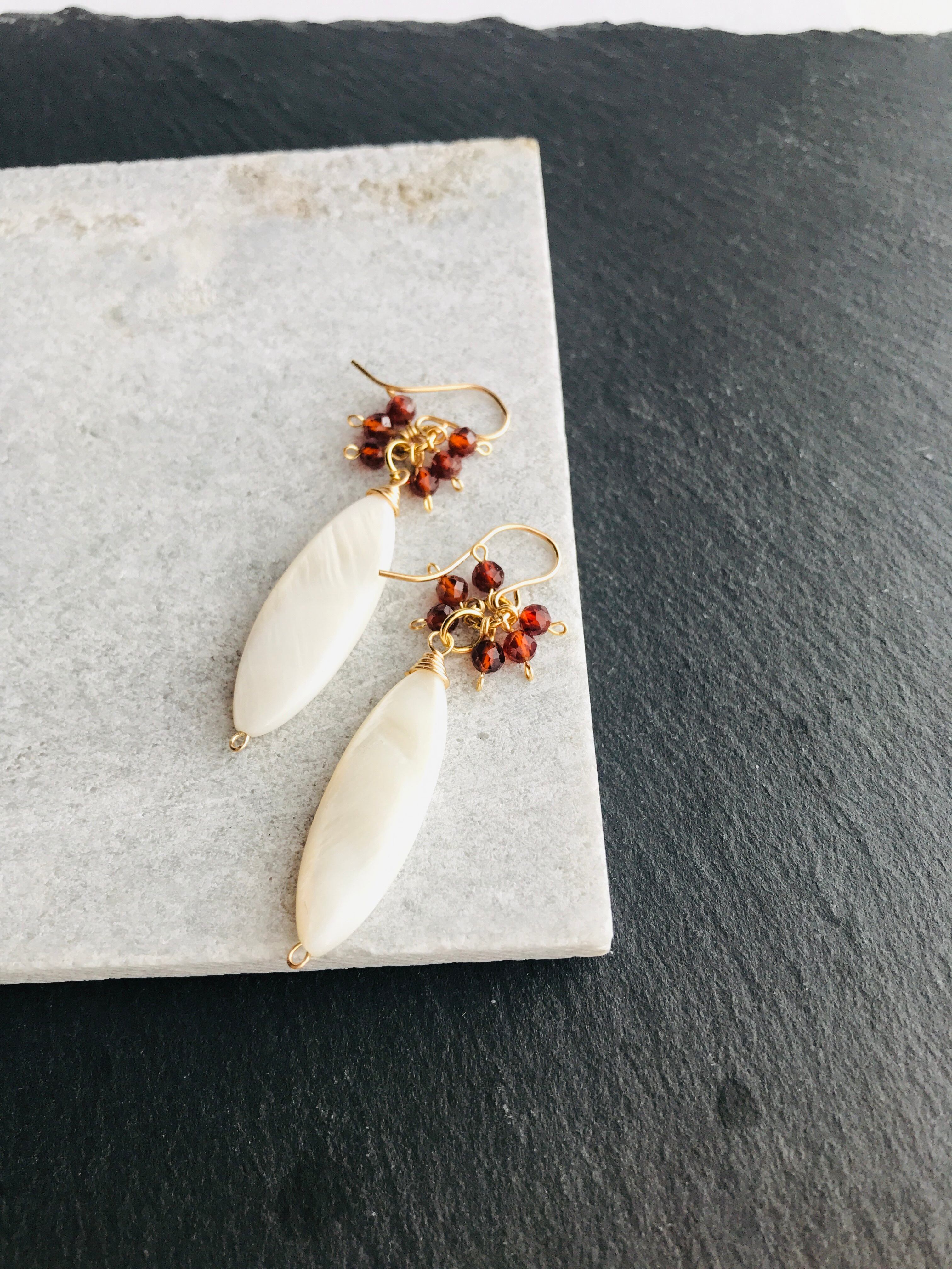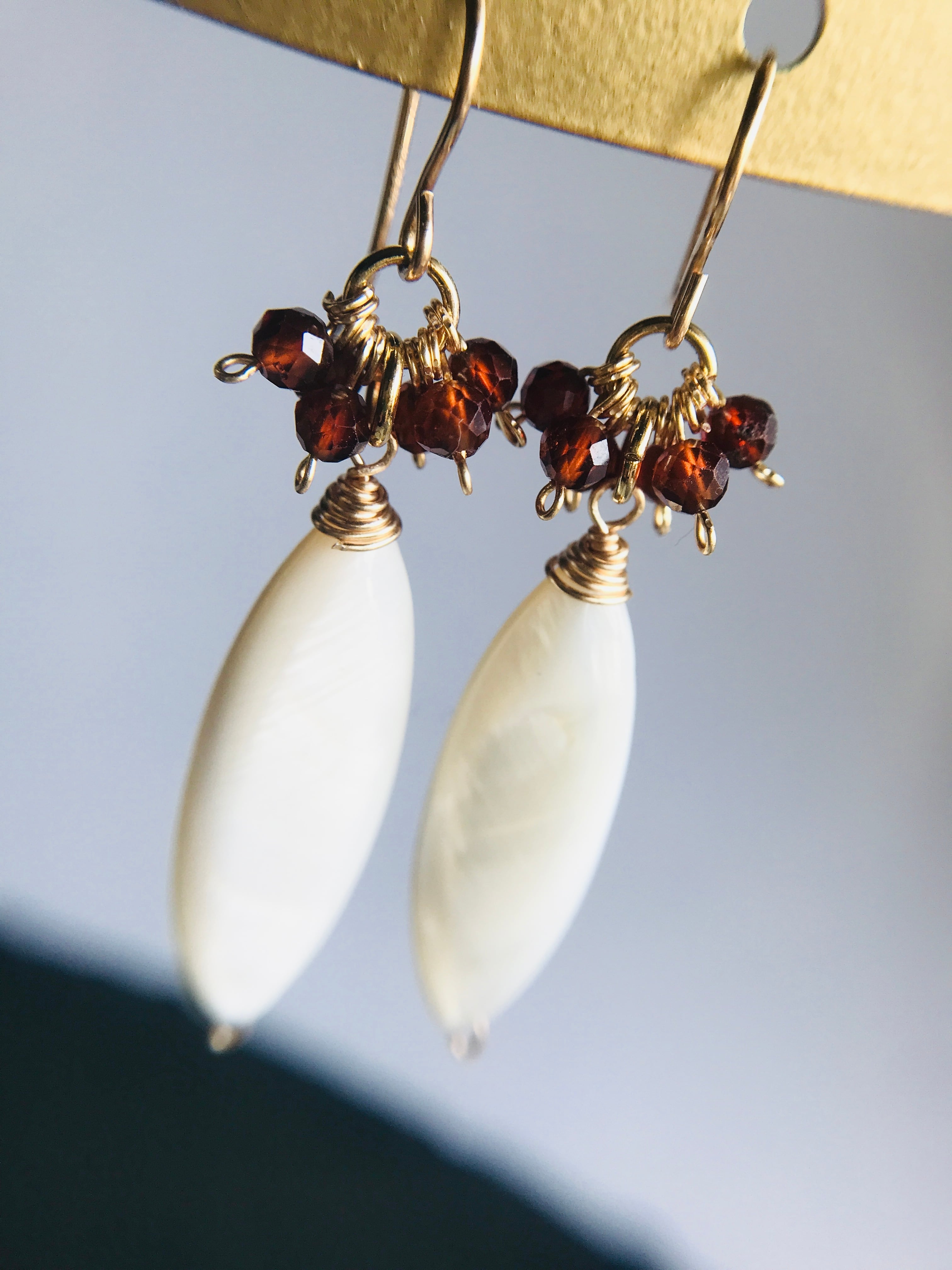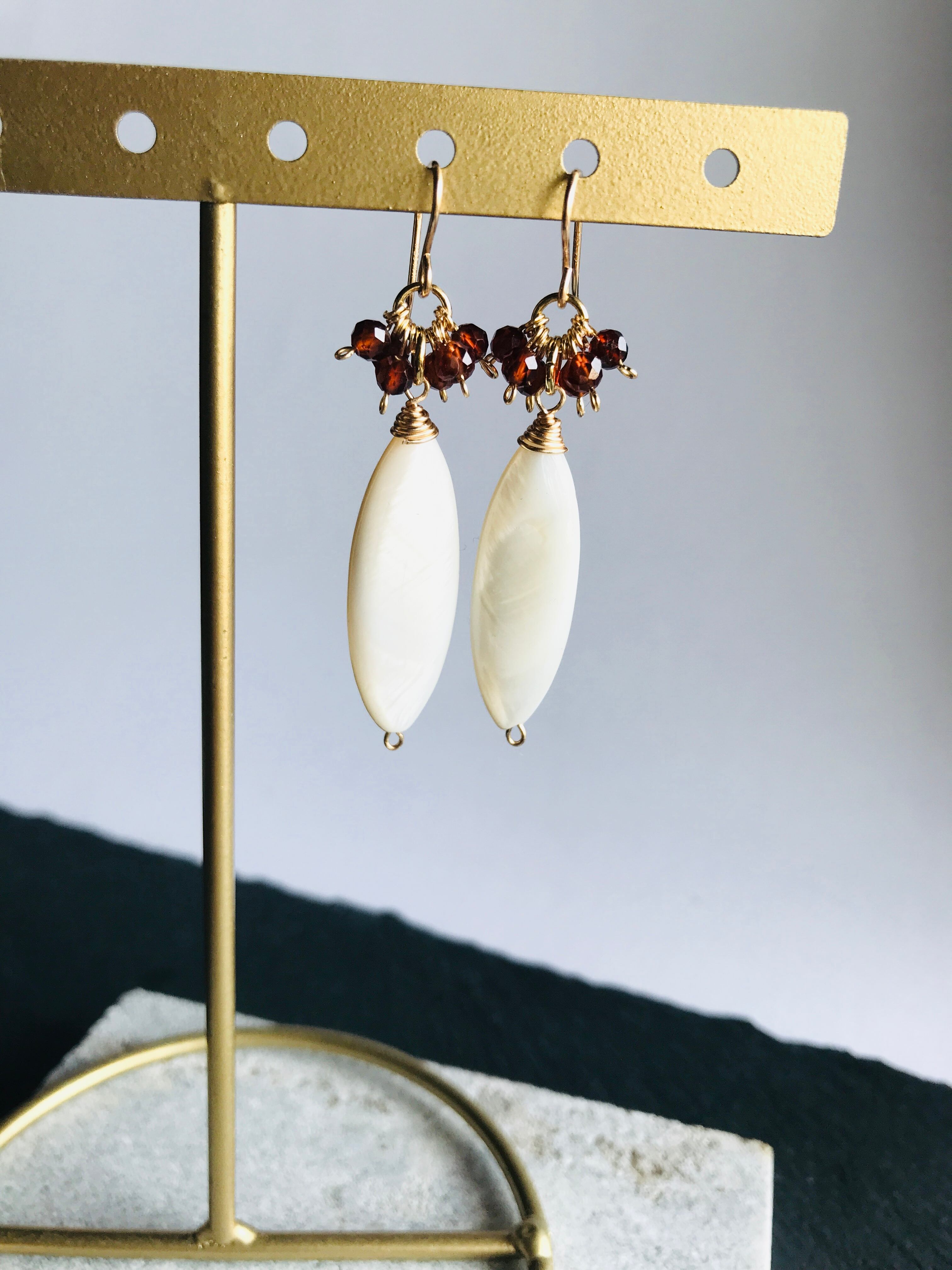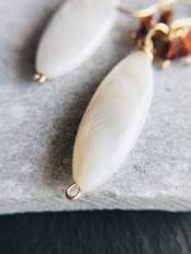 そして、マザーオブパール。。。マーキス型のホワイトシェルが落ち着きと、よりオレンジガーネットが映える組み合わせになっています。