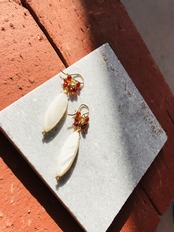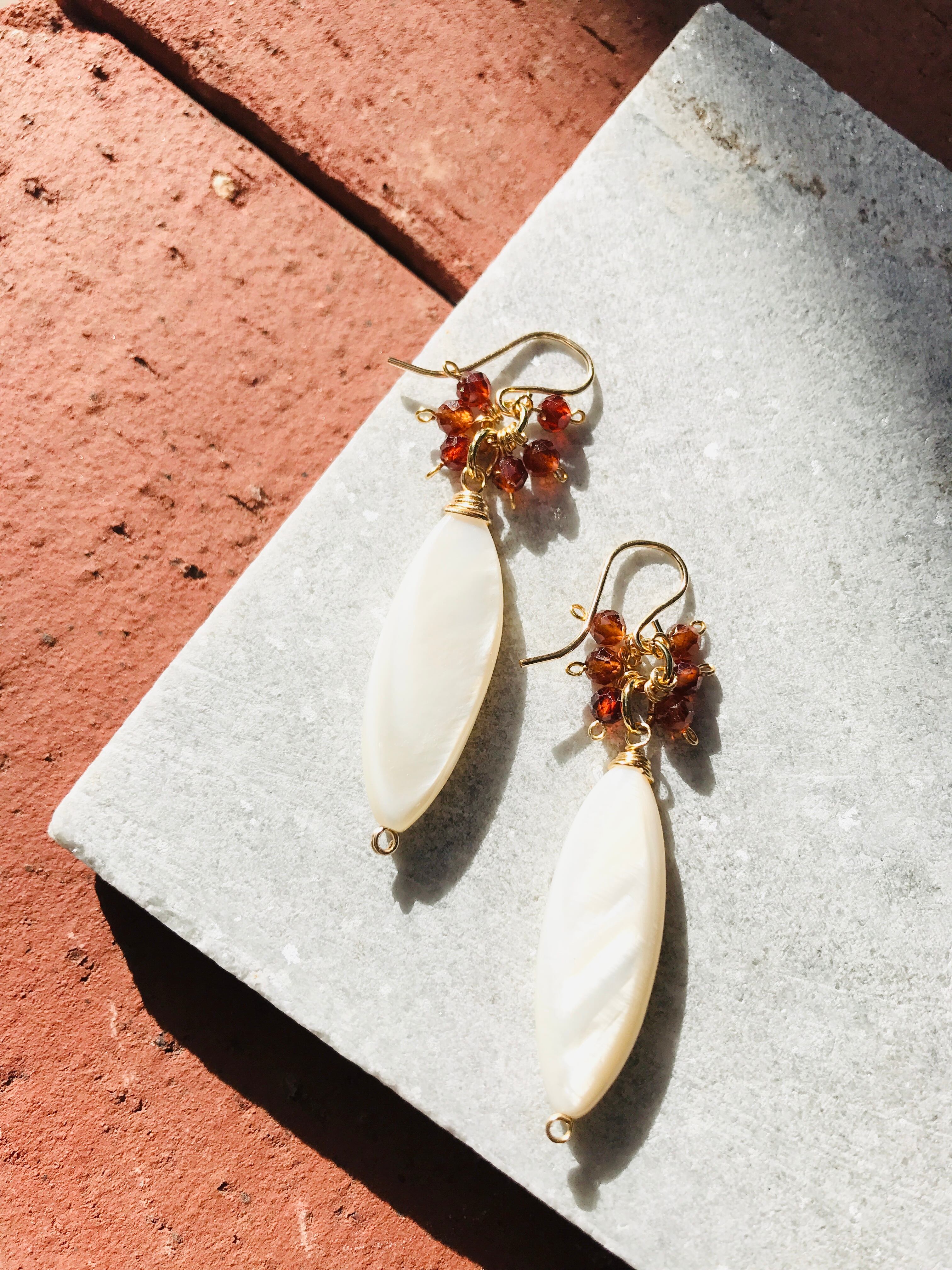 希少価値の高いオレンジガーネットとマーキス型の珍しいマザーオブパール(シェル)を使ったkiranahオリジナルピアスです。