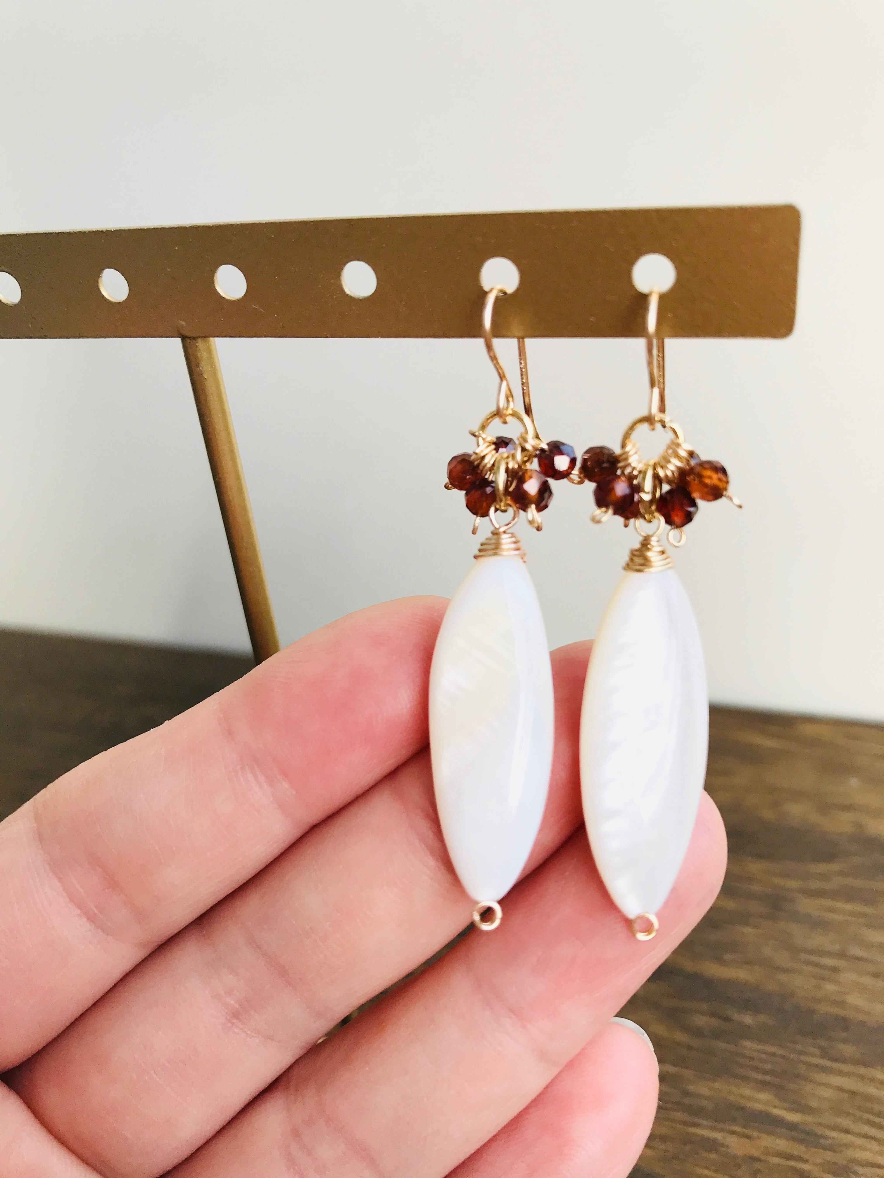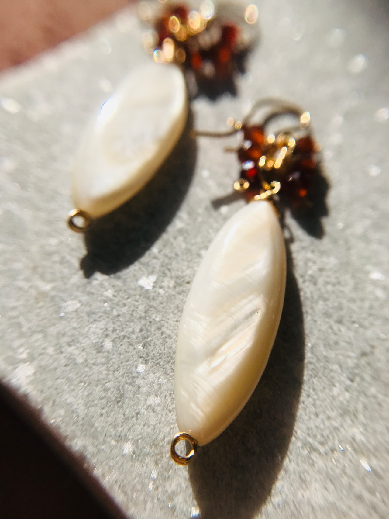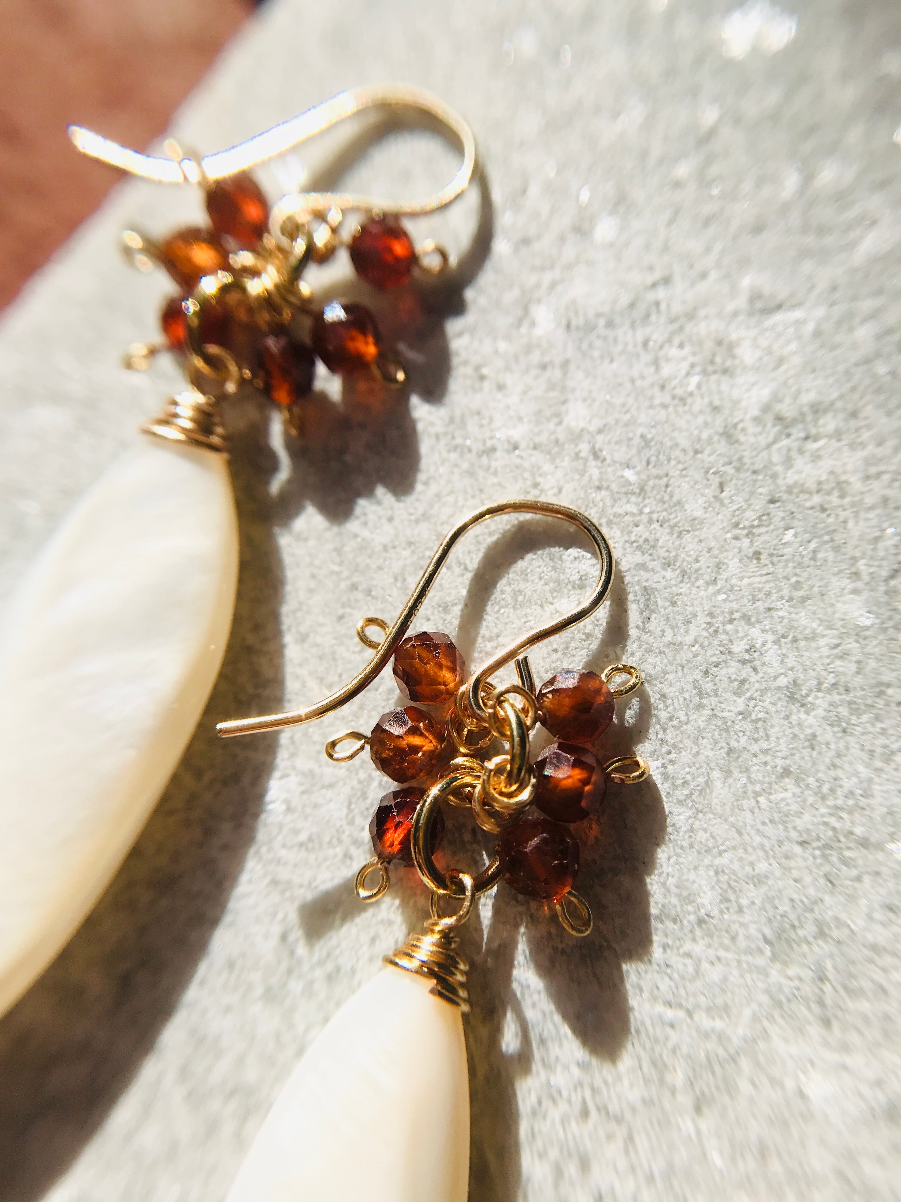 そして、マザーオブパール。。。マーキス型のホワイトシェルが落ち着きと、よりオレンジガーネットが映える組み合わせになっています。