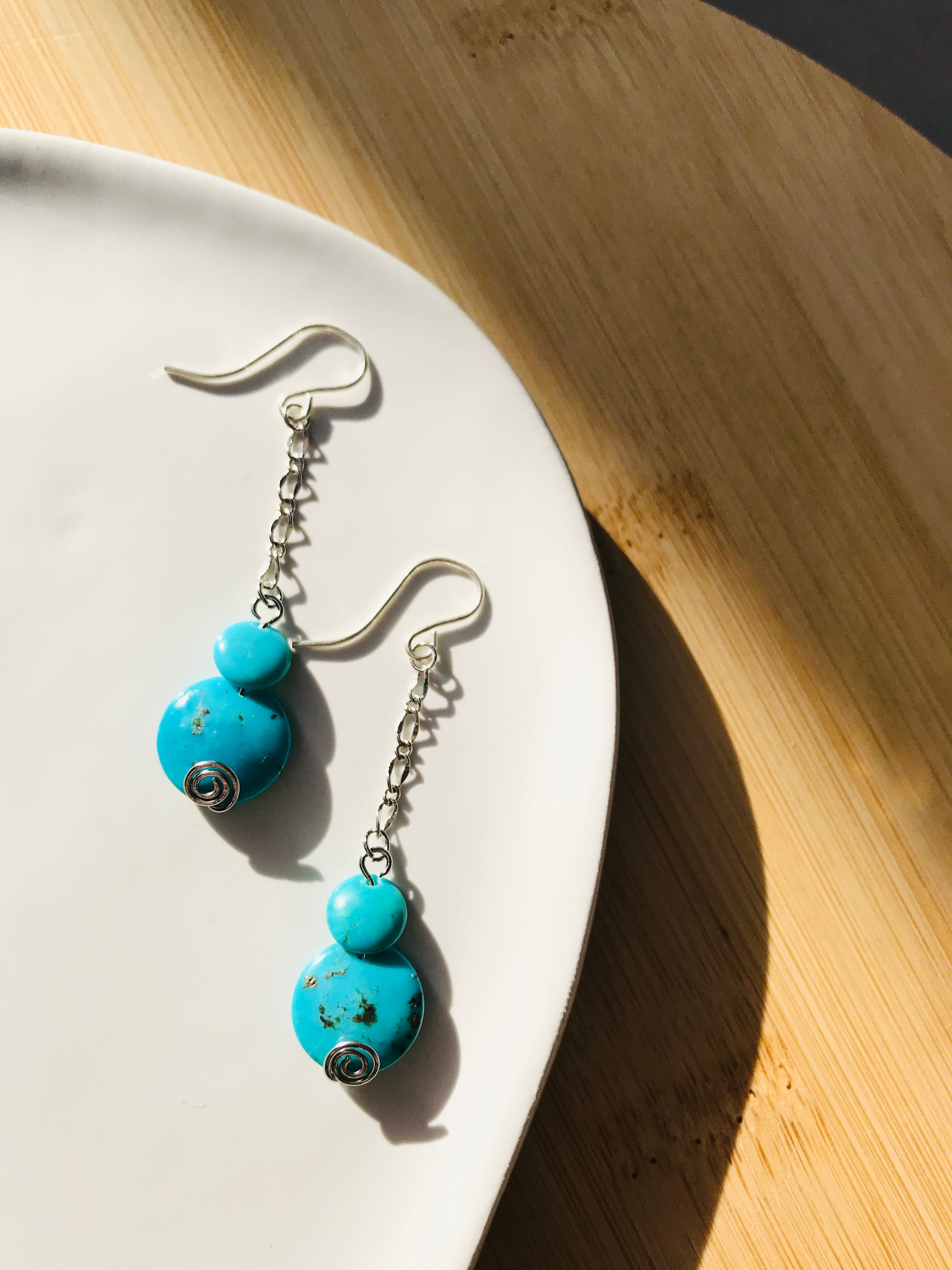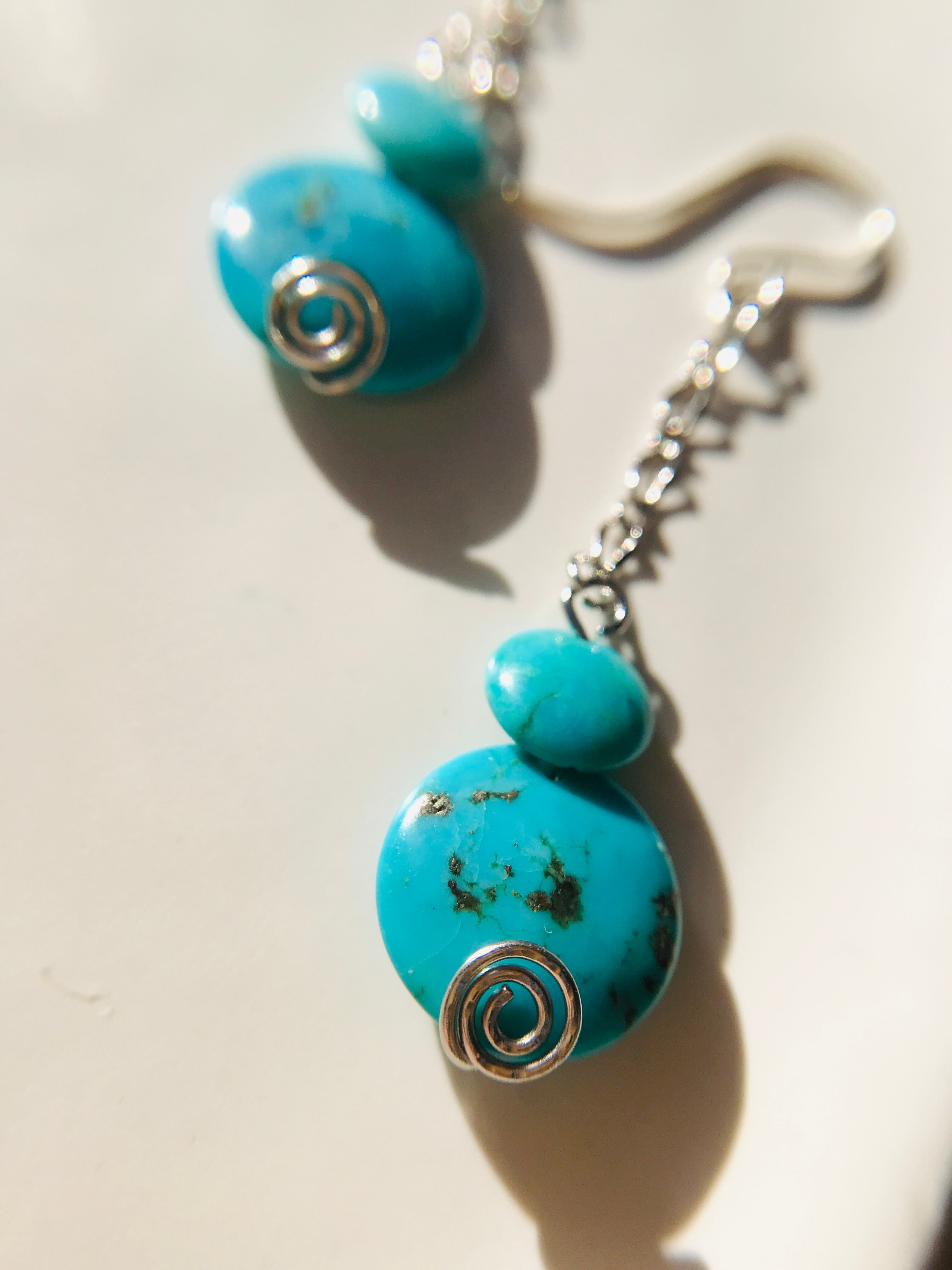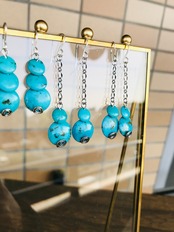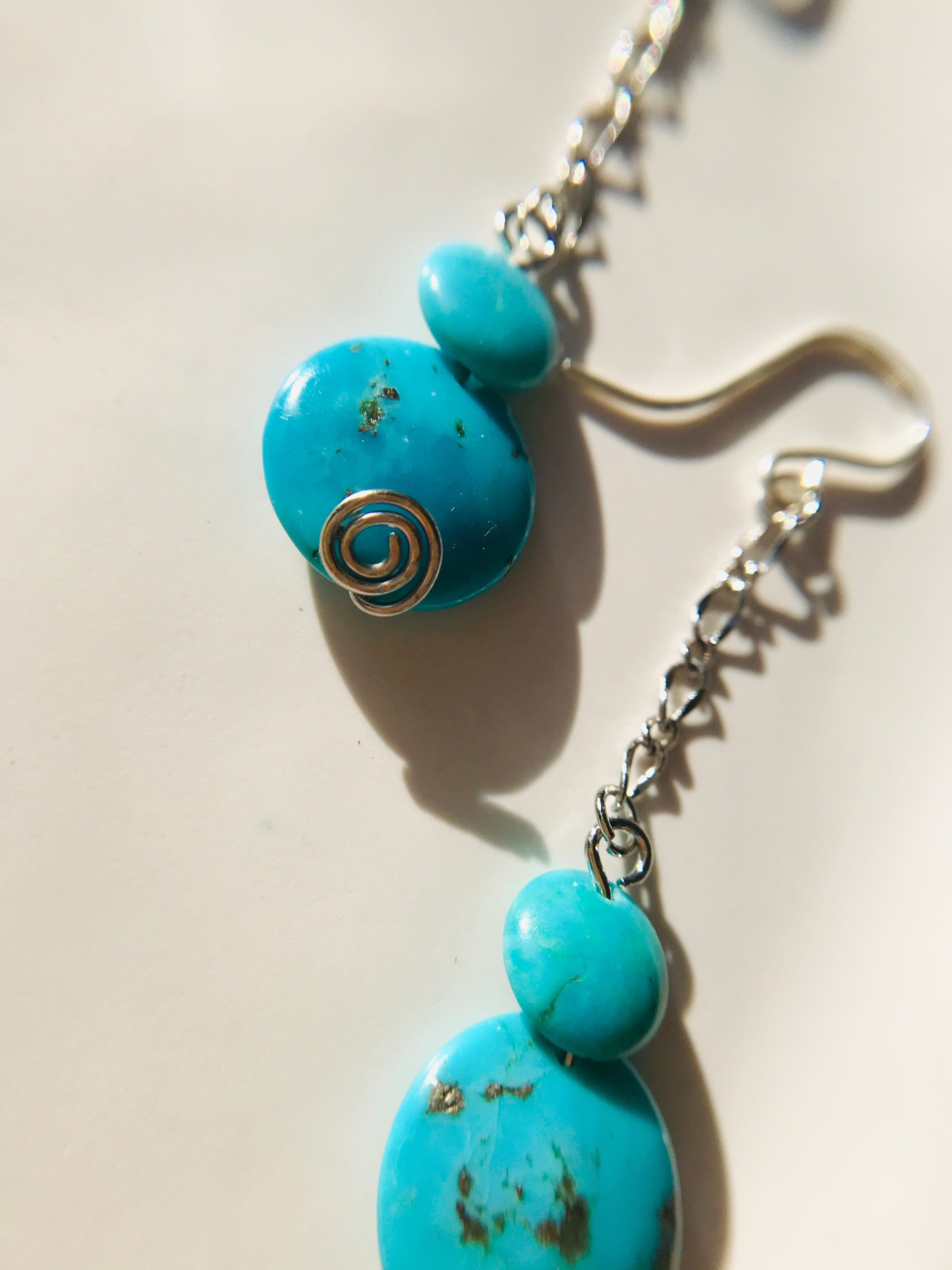 ターコーイズを2連つなげて、ワイヤーで渦巻きにして石止めし、チェーンでつなげてゆらゆら揺れるピアスに仕上げました。