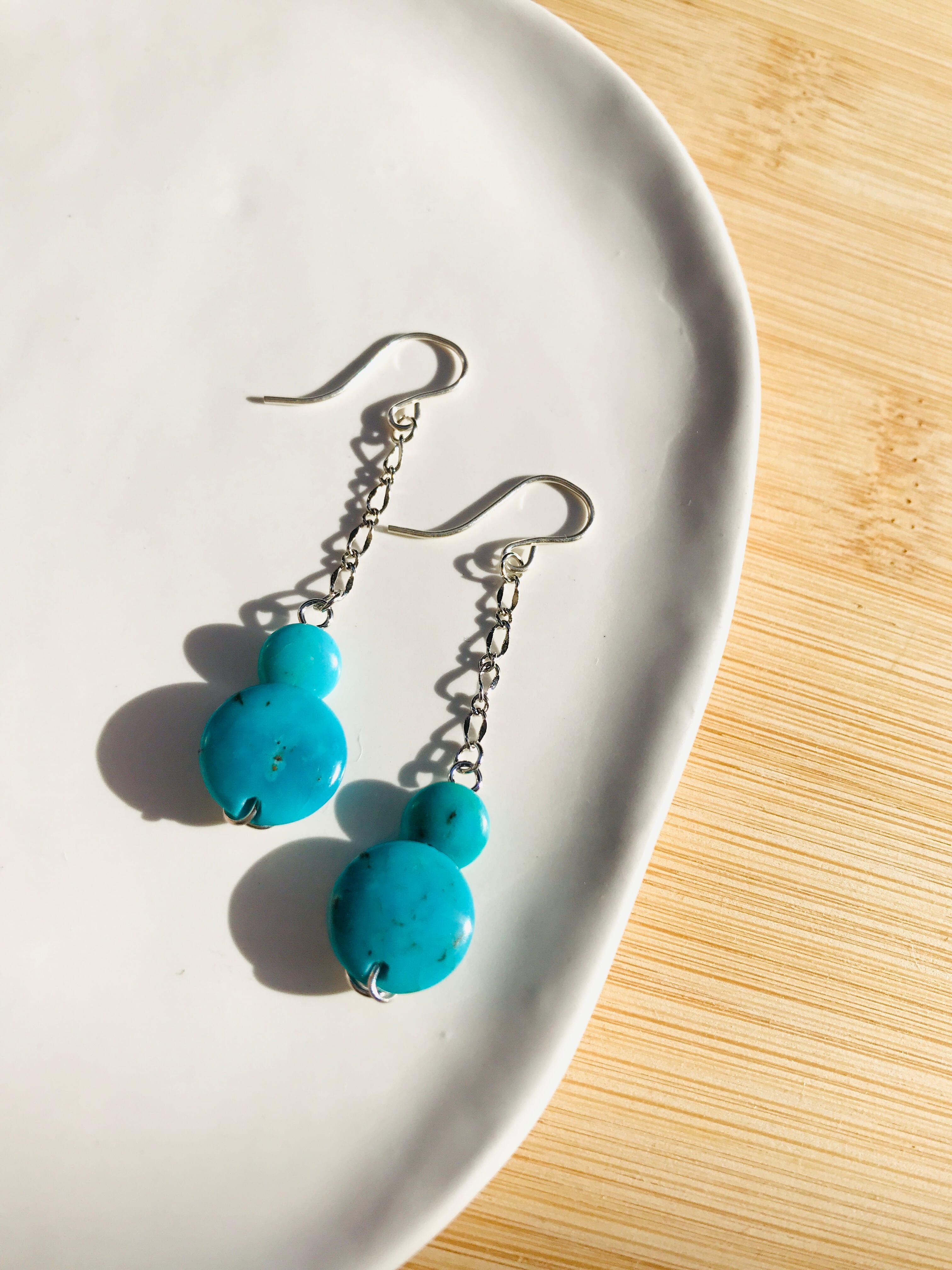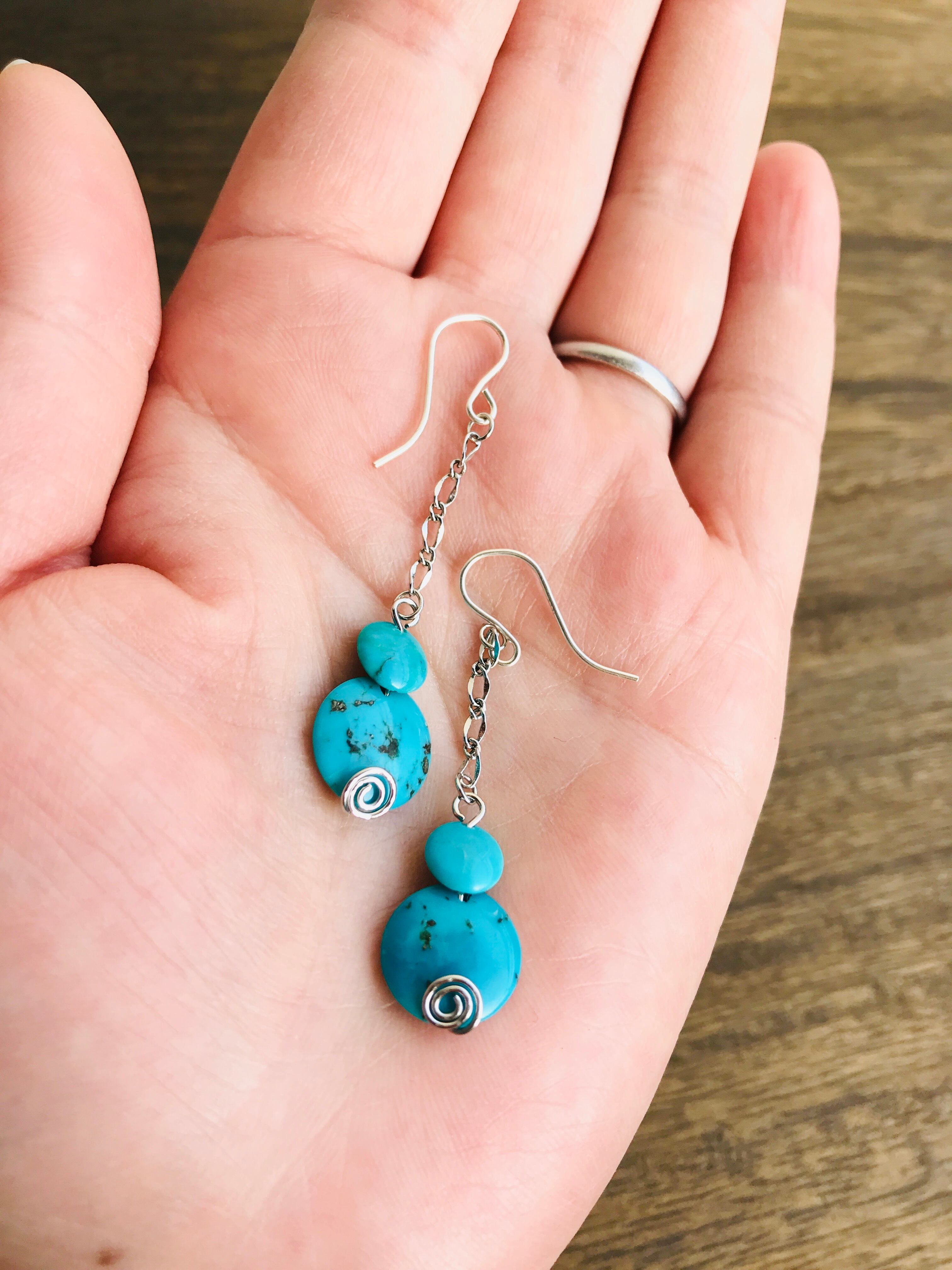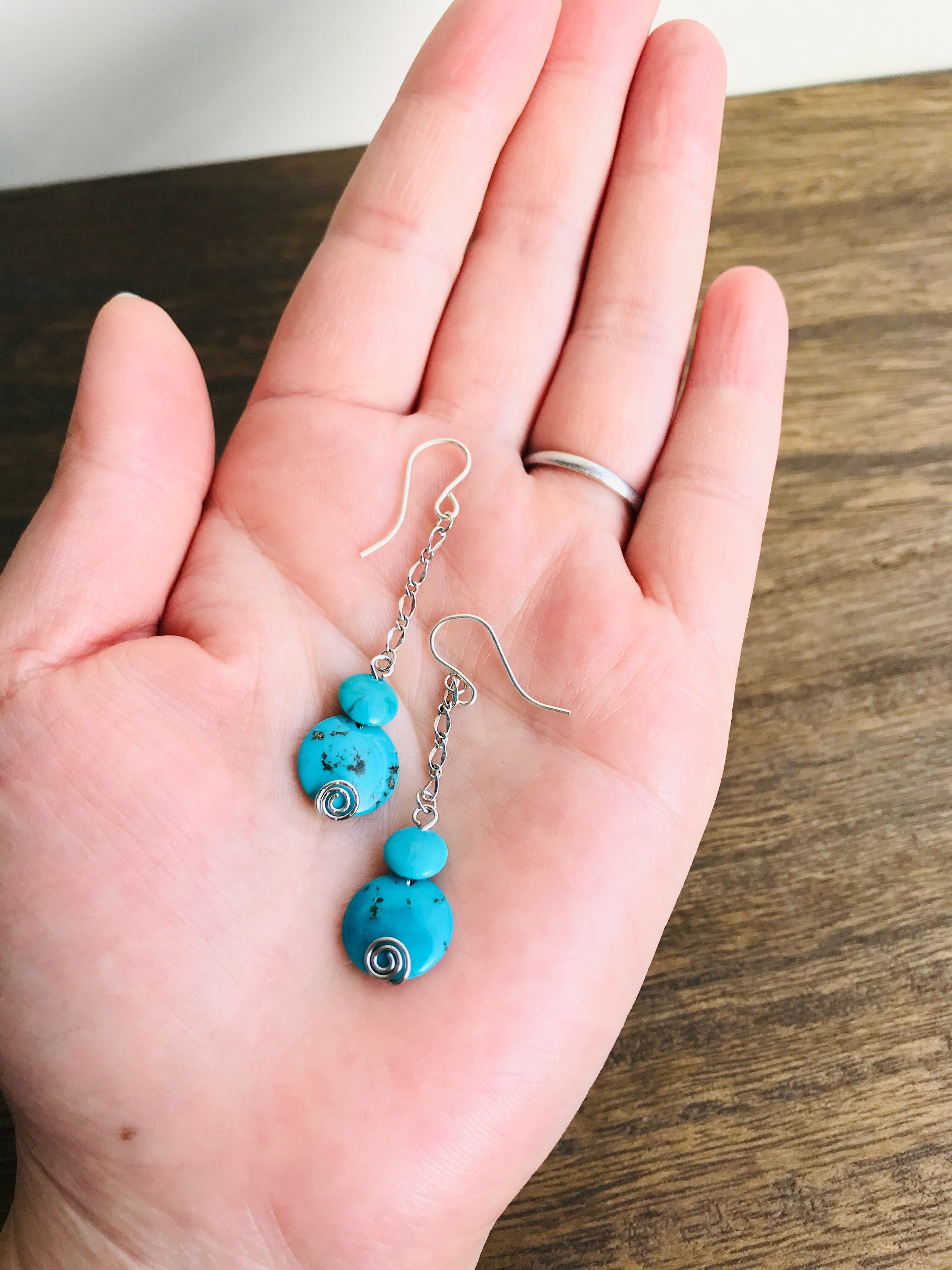 ターコーイズを2連つなげて、ワイヤーで渦巻きにして石止めし、チェーンでつなげてゆらゆら揺れるピアスに仕上げました。