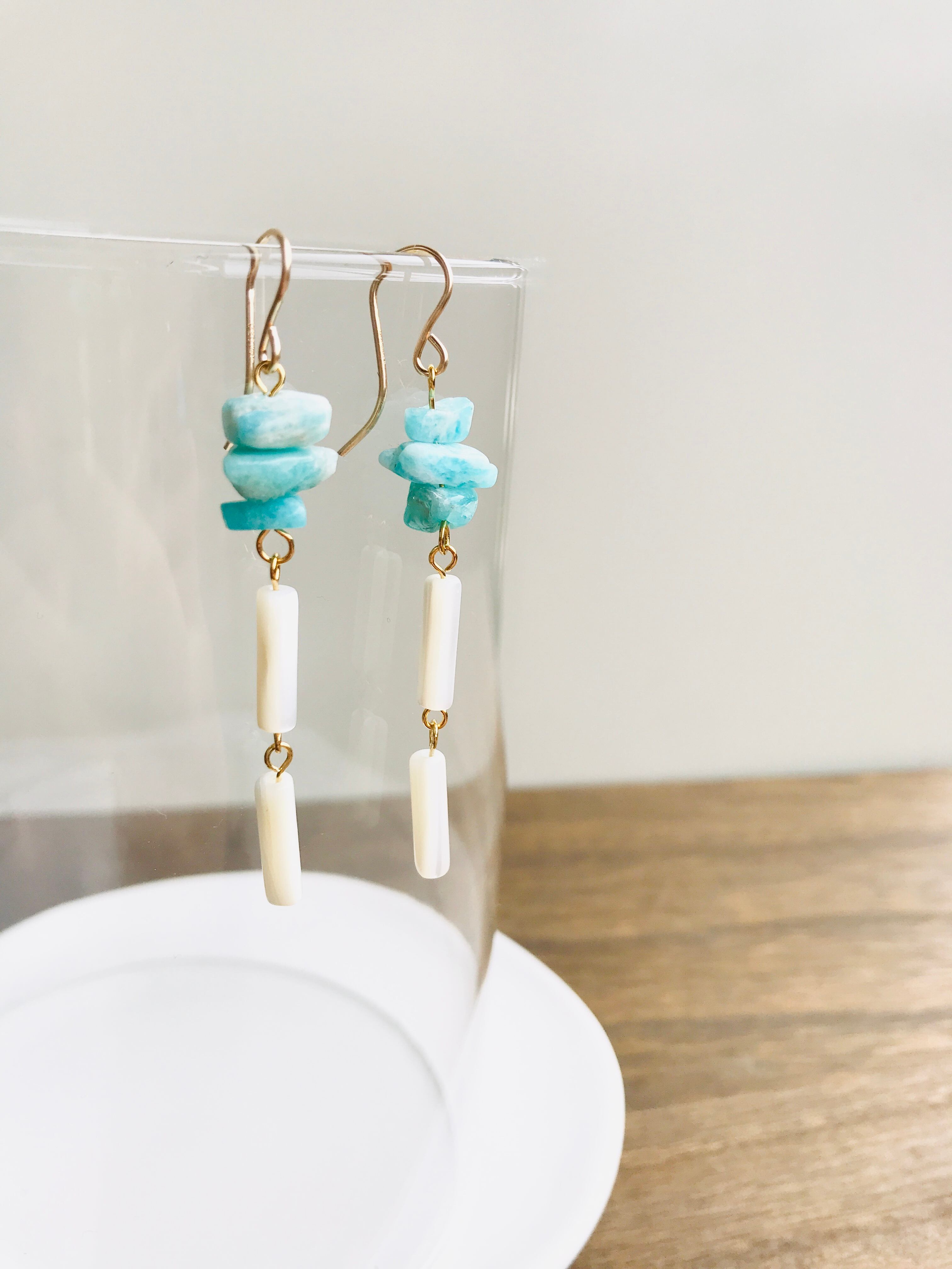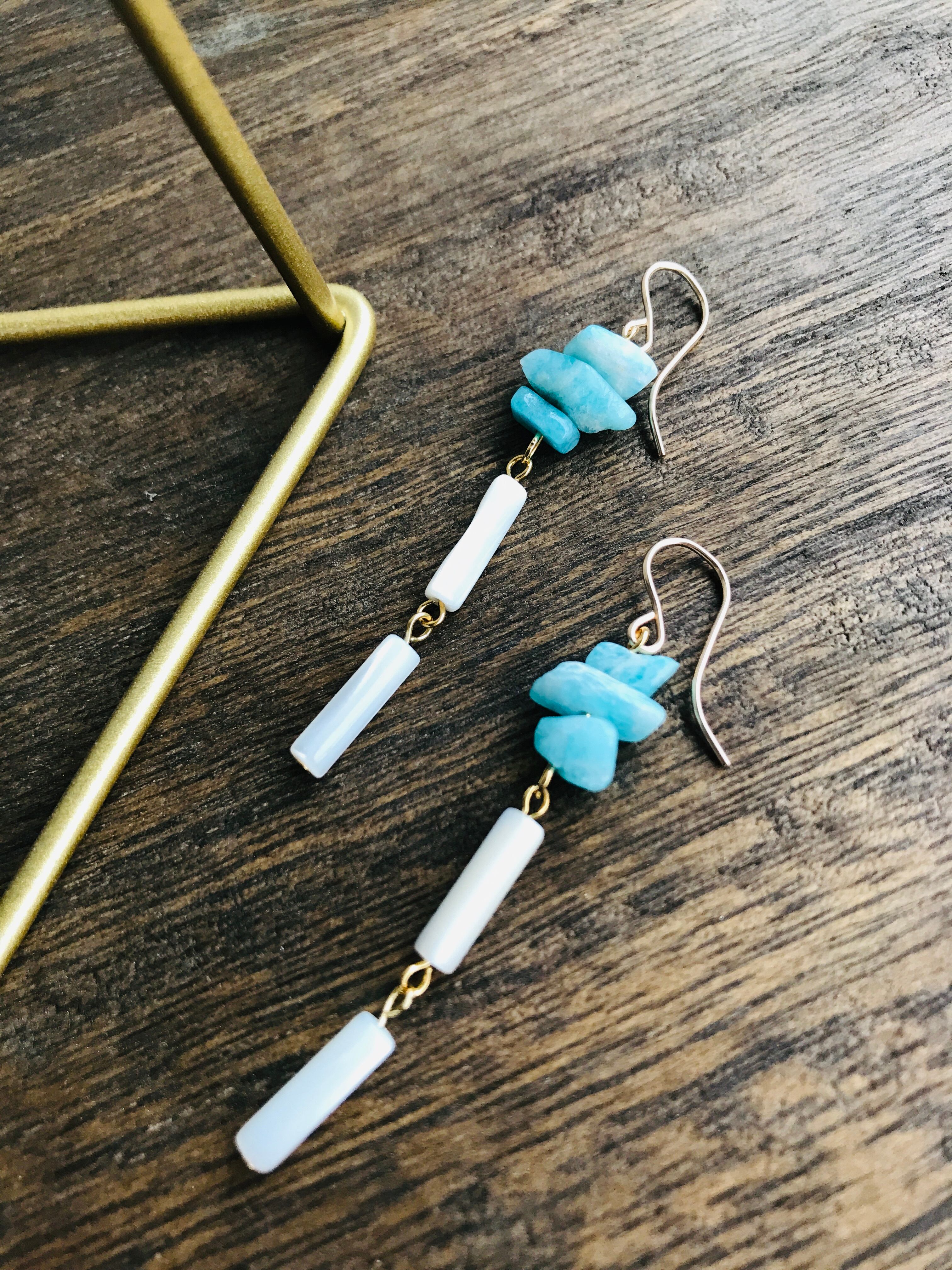 きれいな青空色のアマゾナイトのさざれ石を使った、これからの季節にぴったりなさわやかなピアスです。