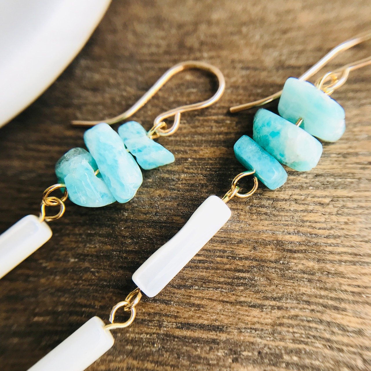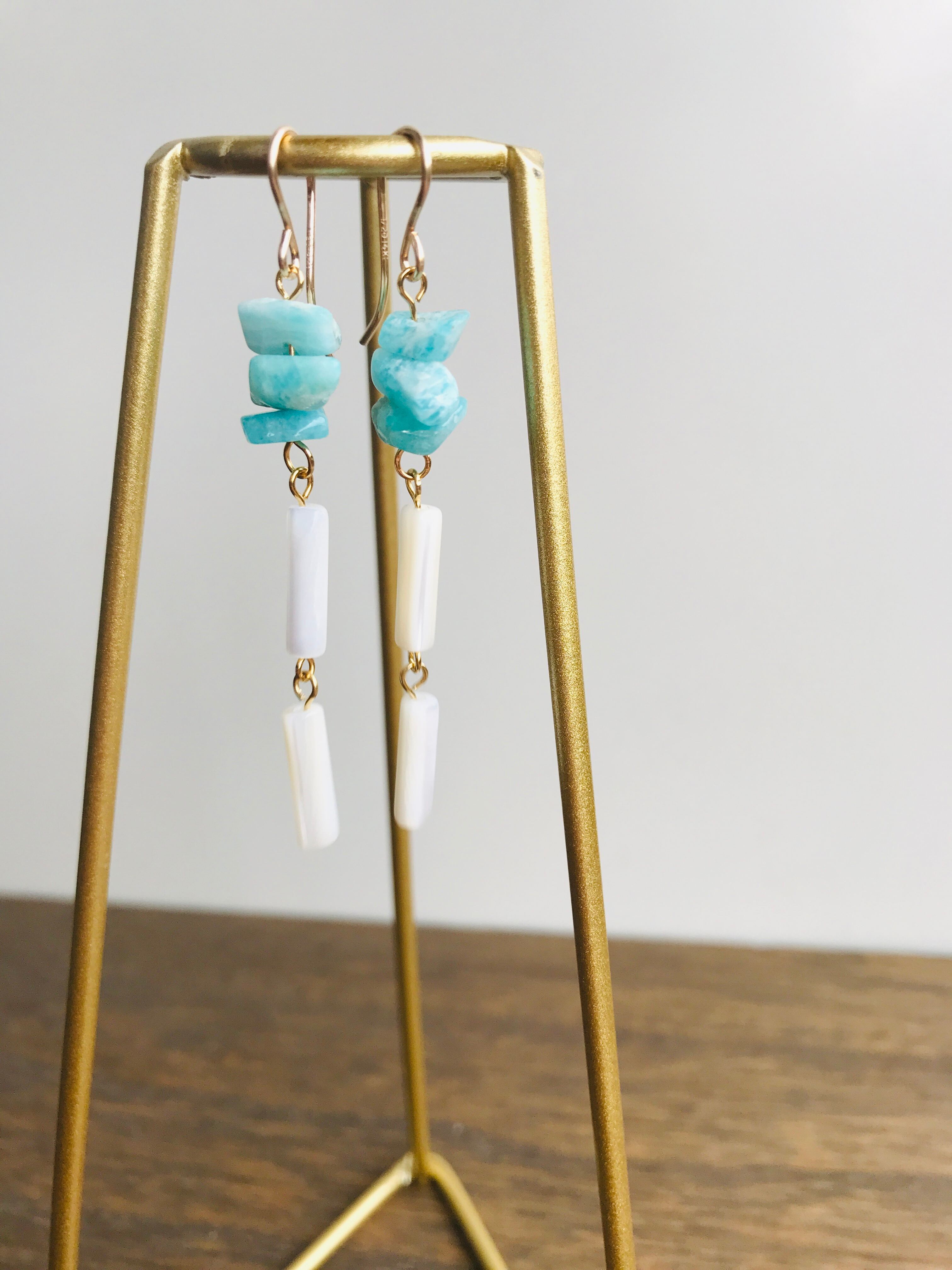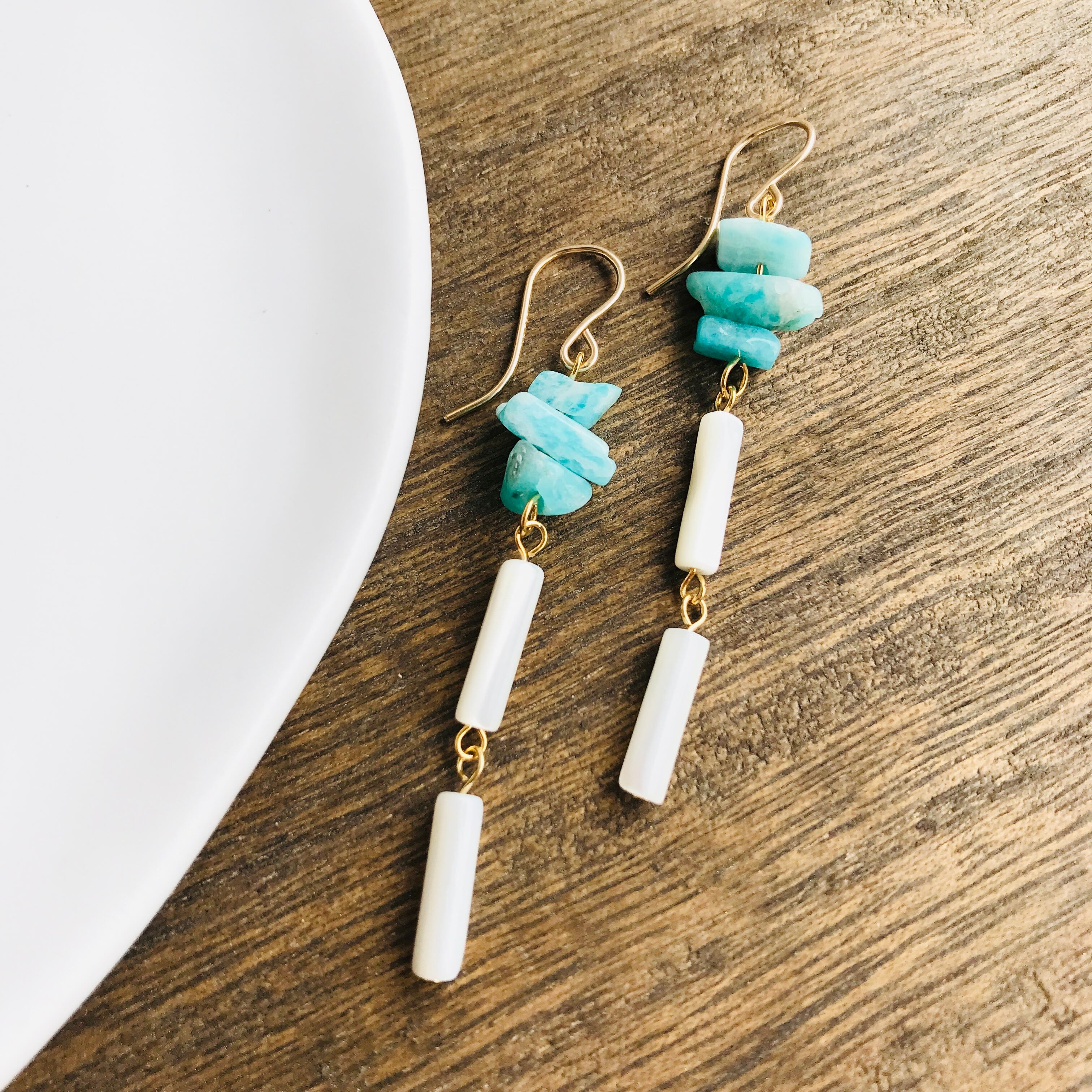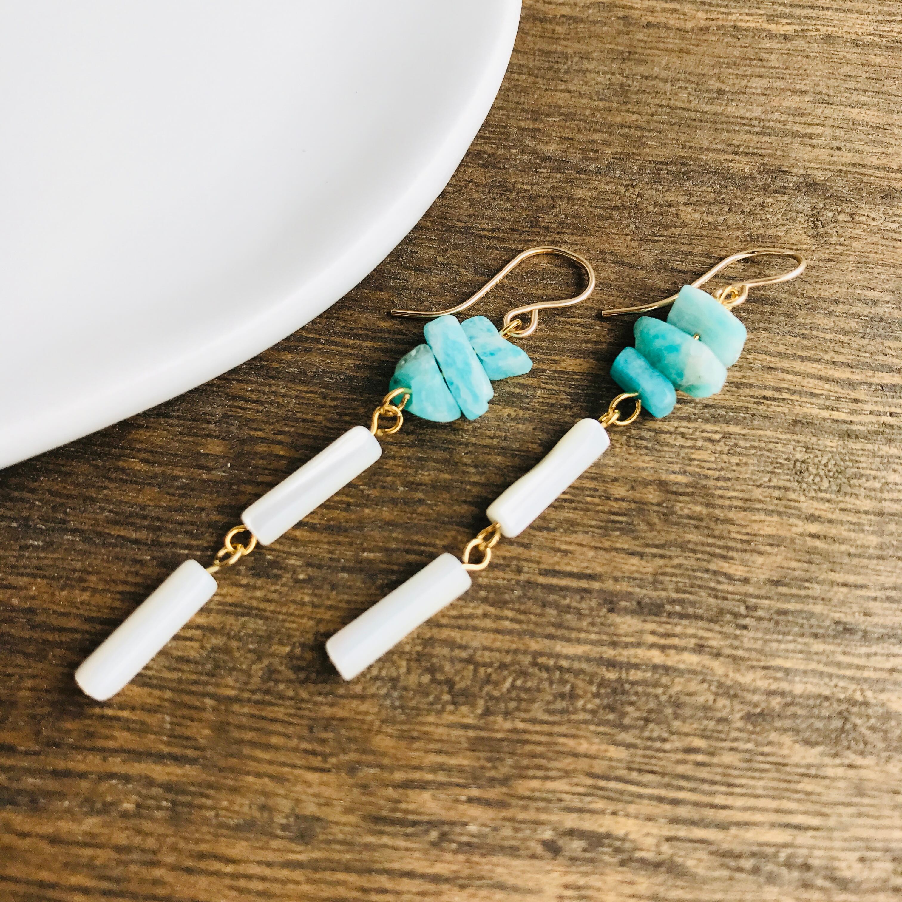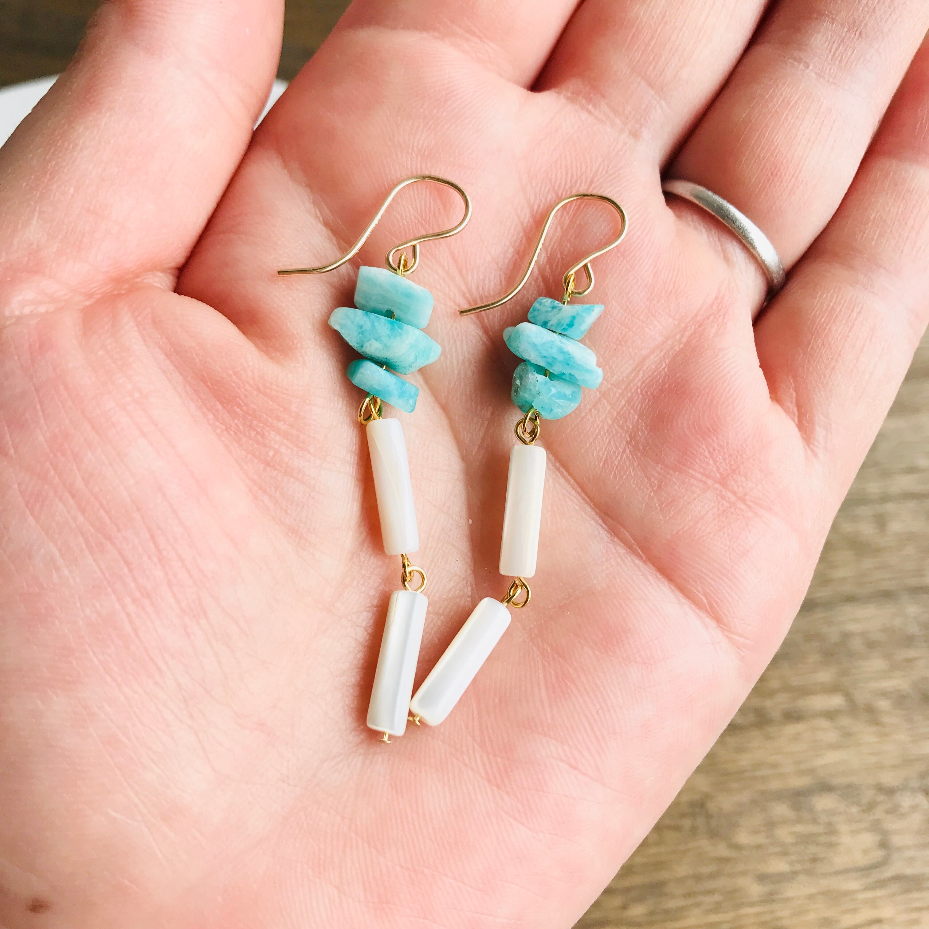 アマゾナイトのさざれ石の下には、相性のよい筒形のマザーオブパールを2つつなげました。