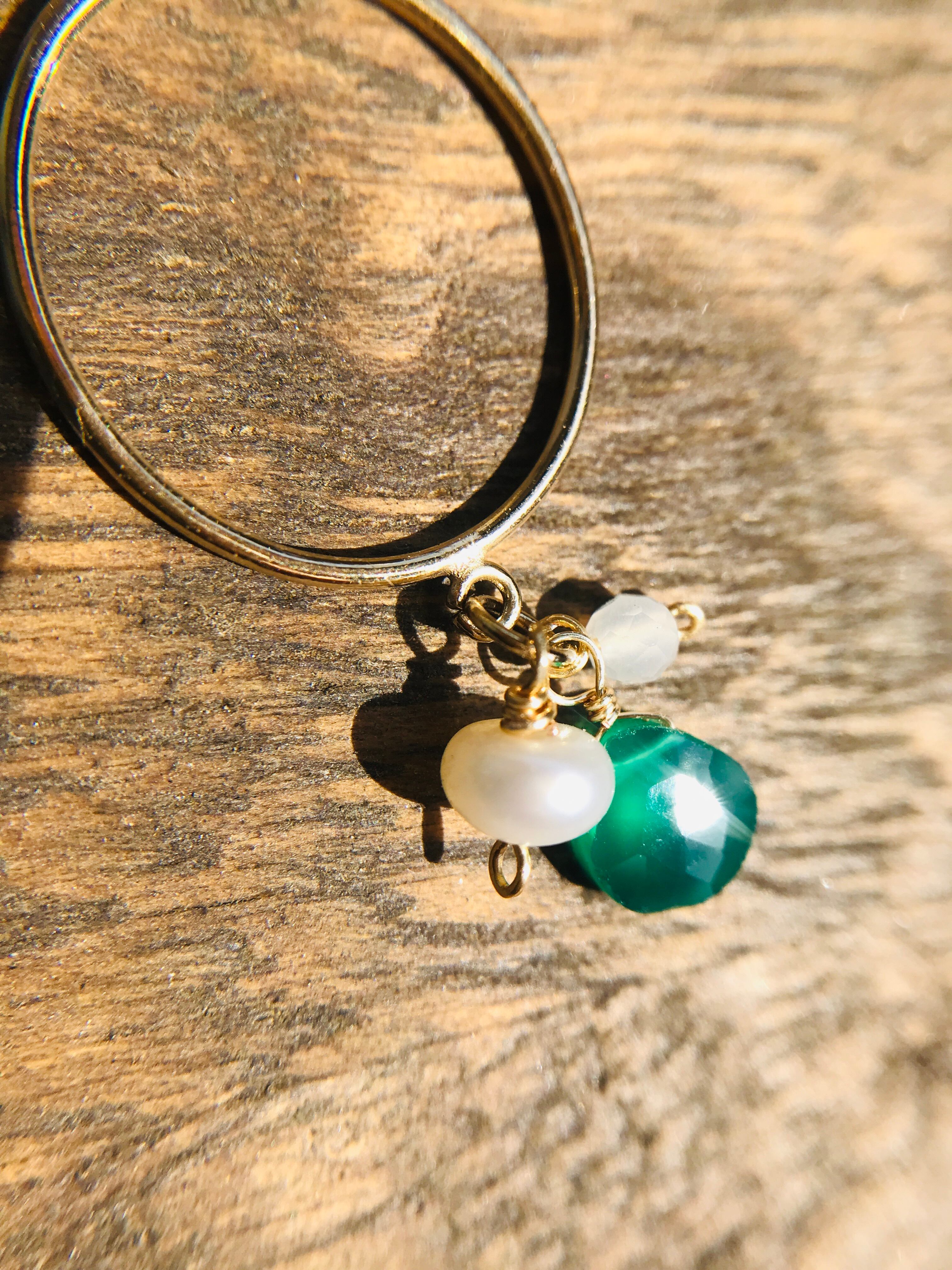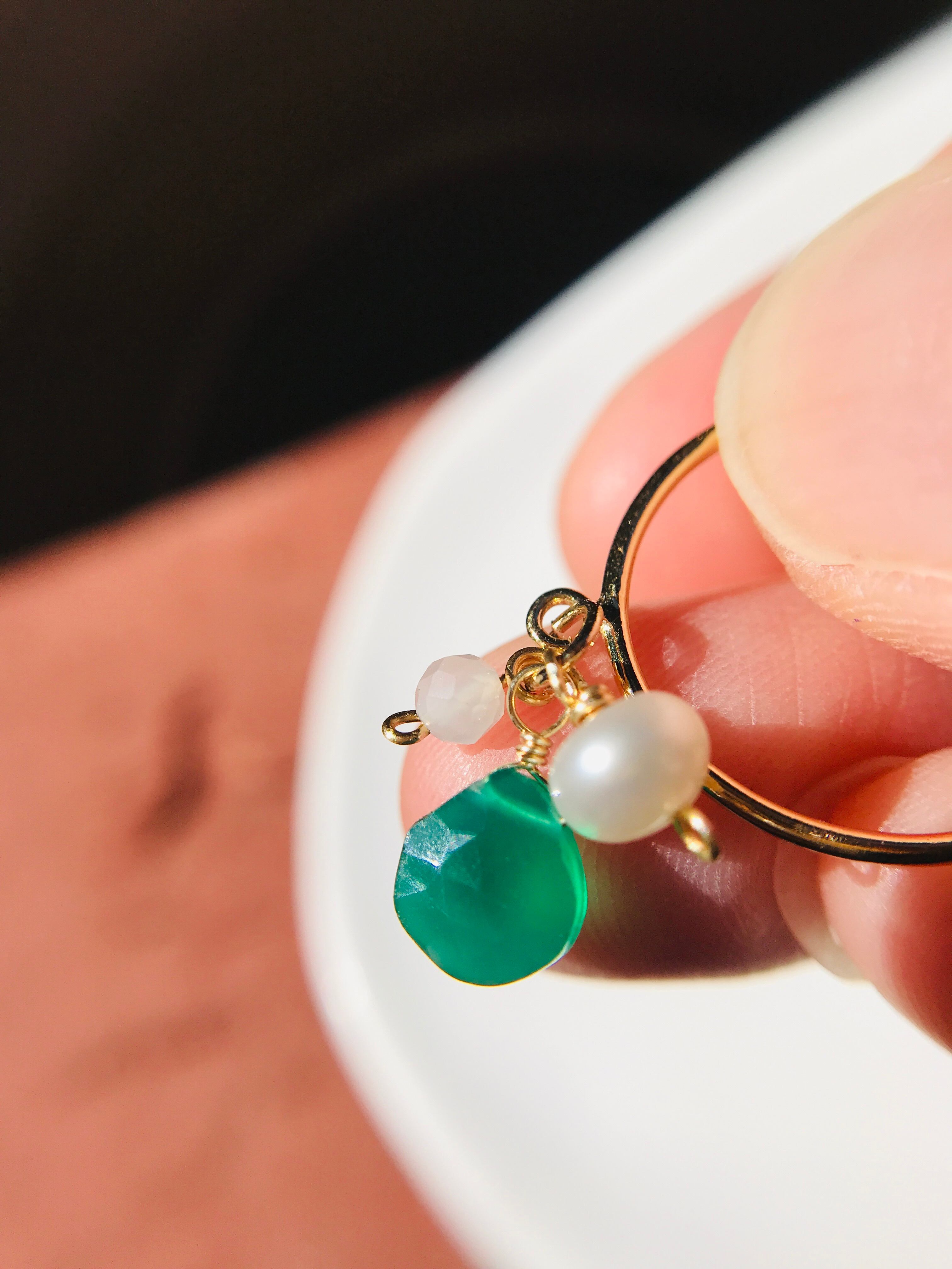 グリーンオニキスの他に、アクセントでホワイトムーンストーンカットボールと淡水パールをチャームにして付けています。