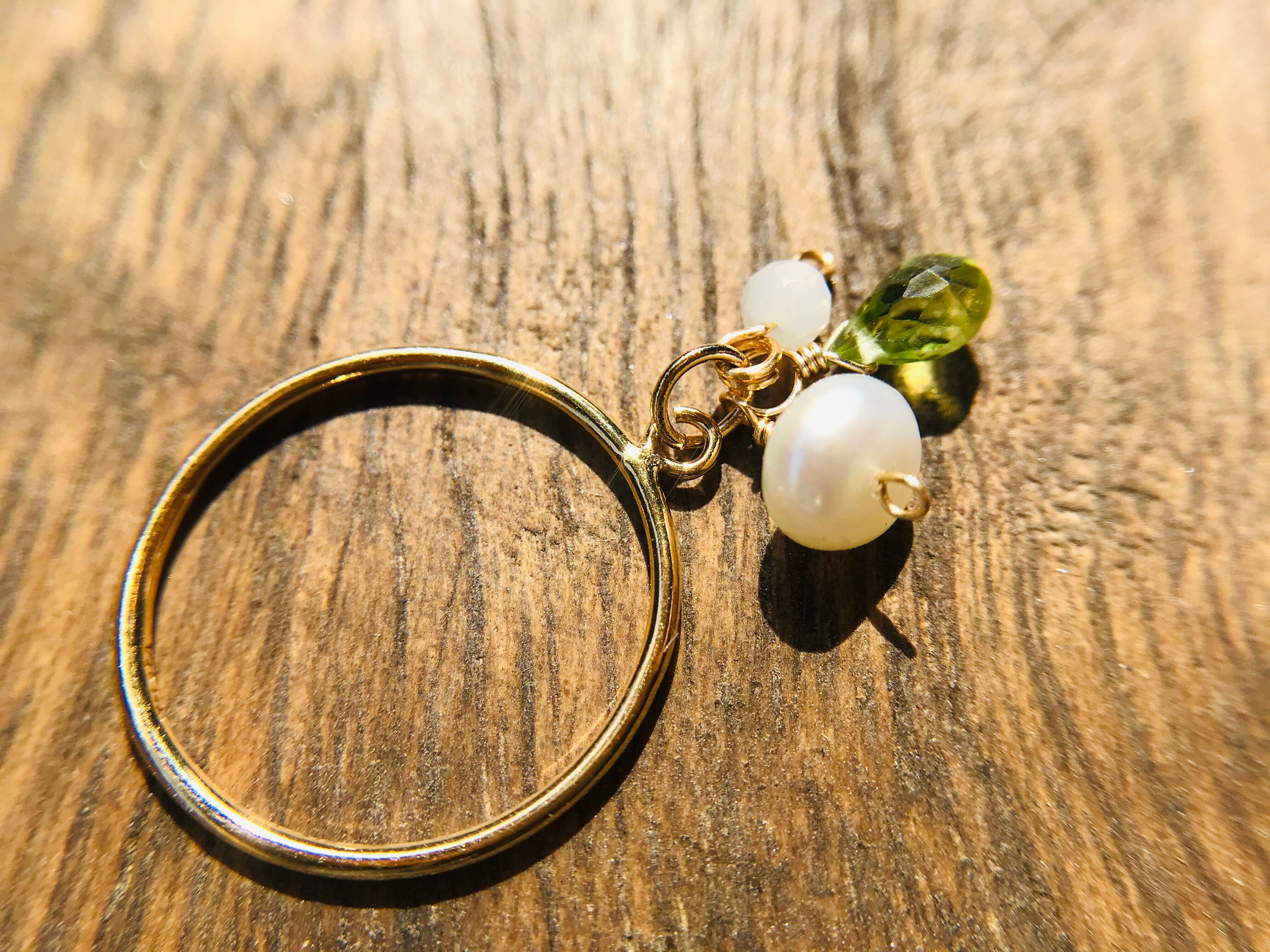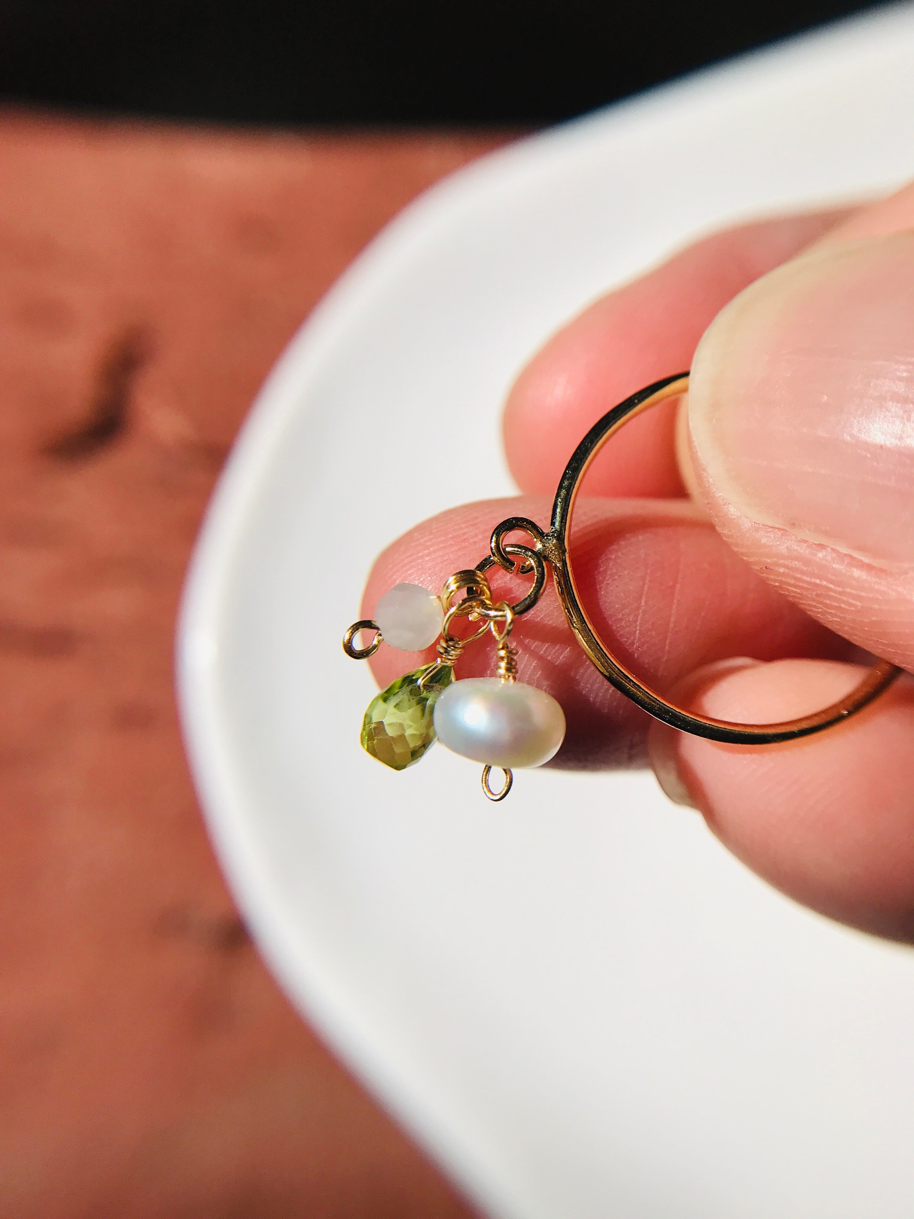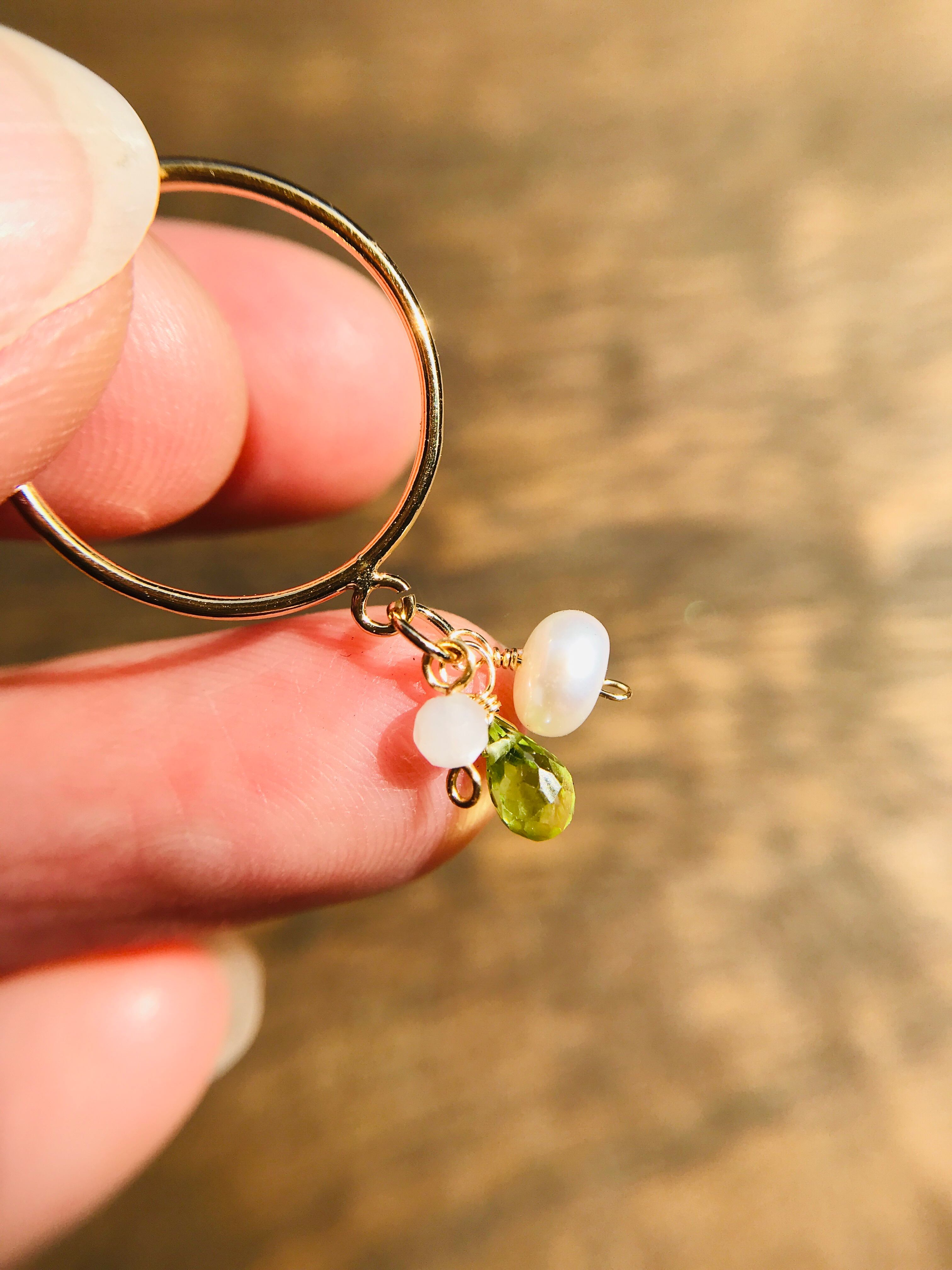 ペリドットの他に、アクセントでホワイトムーンストーンカットボールと淡水パールをチャームにしてつけています。