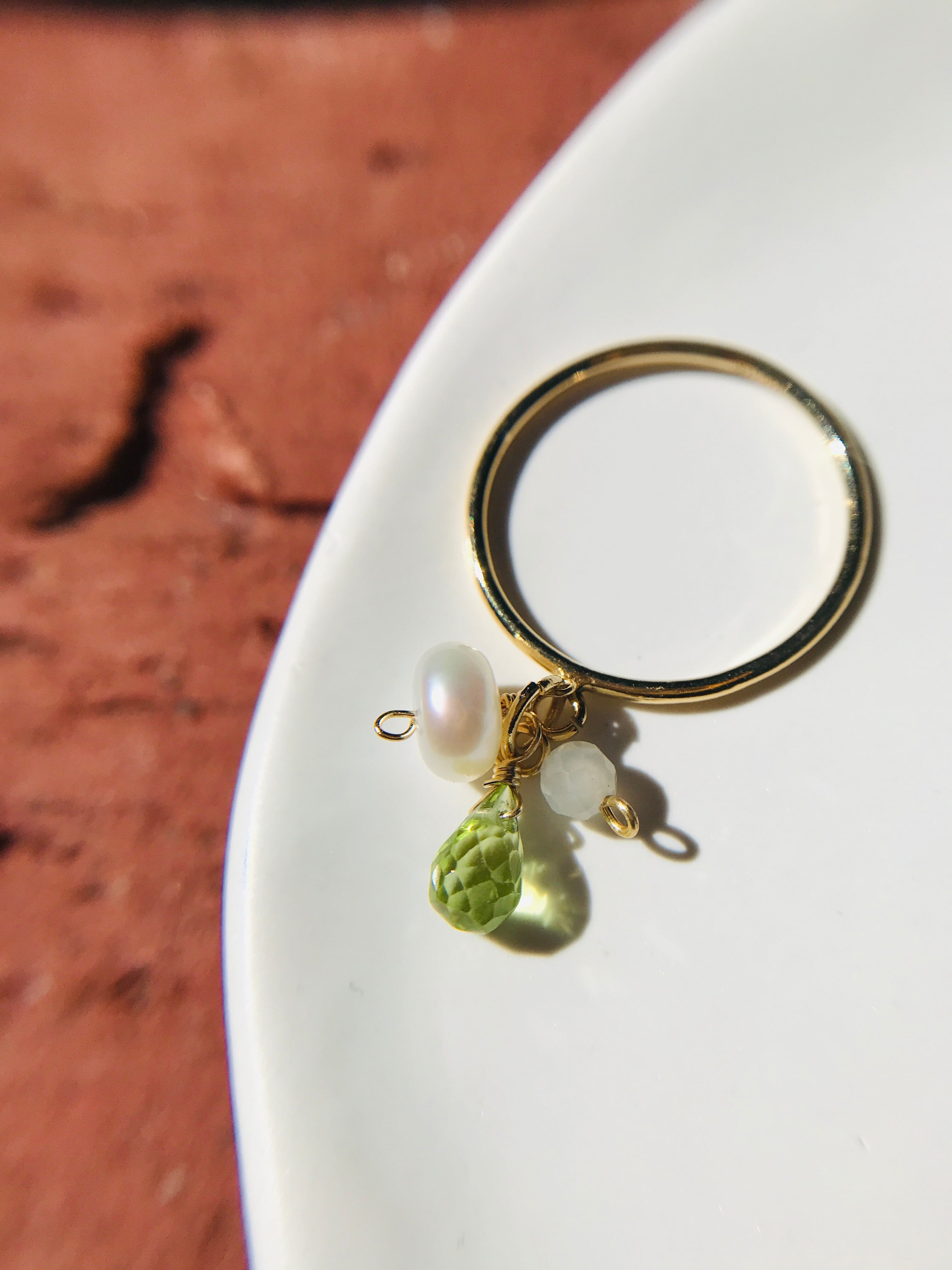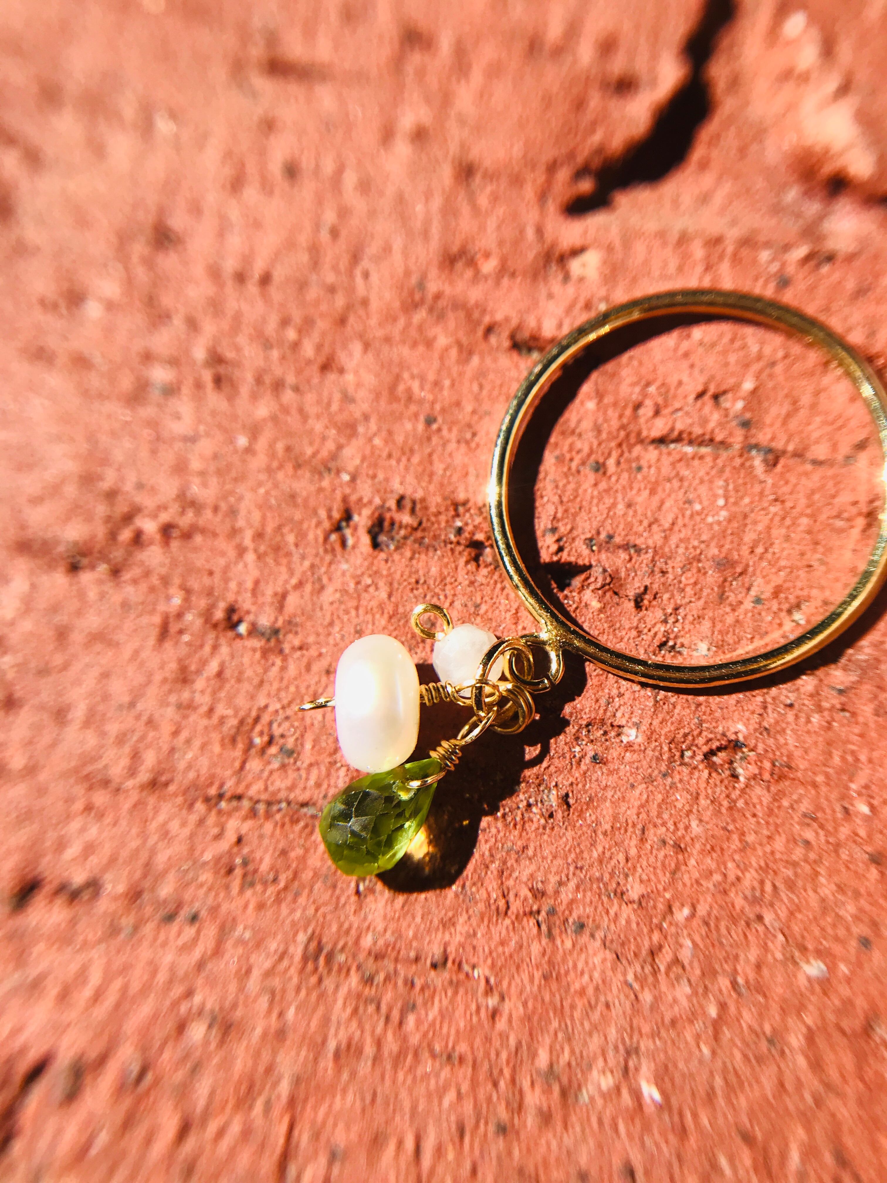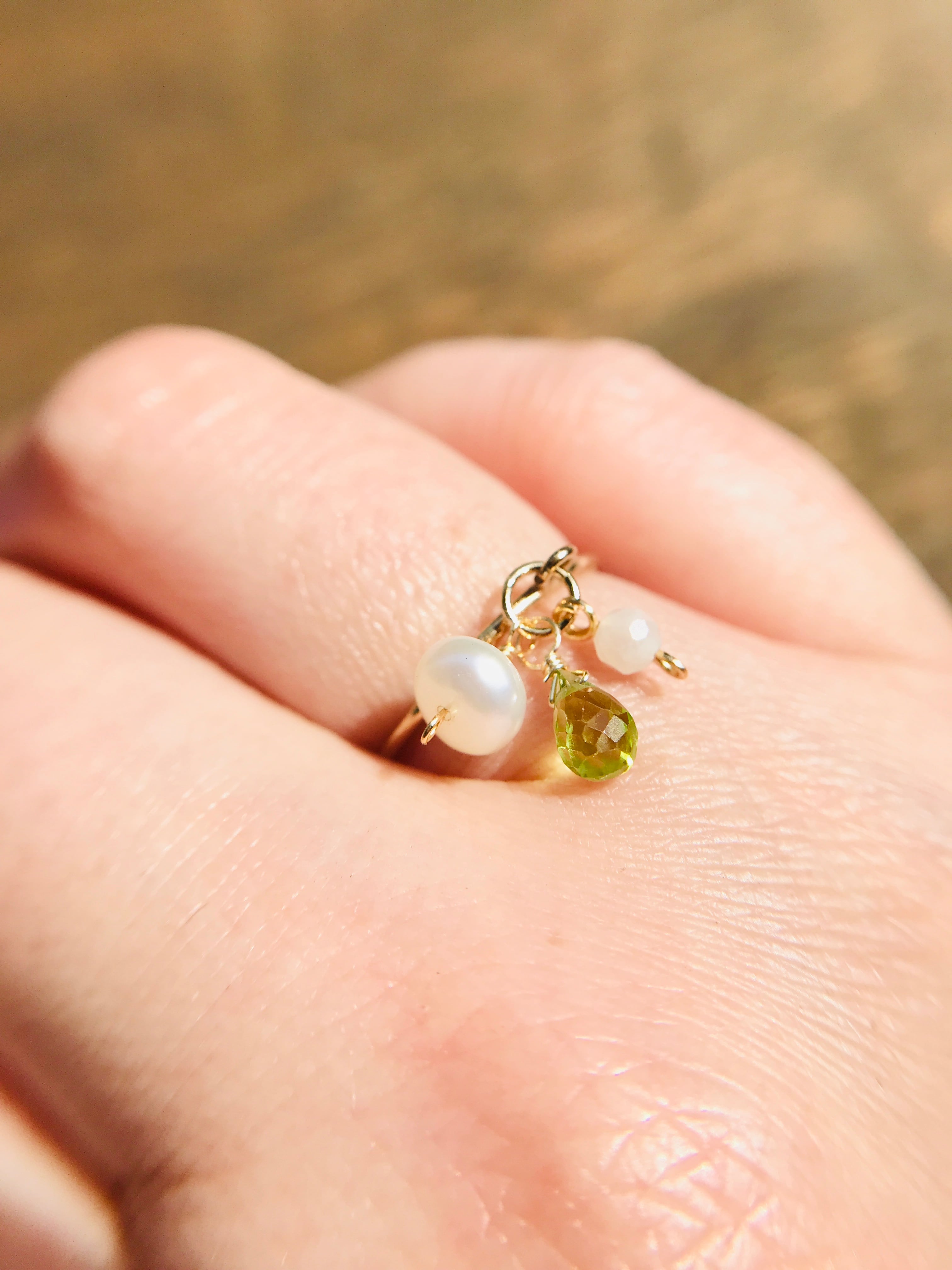 ペリドットの他に、アクセントでホワイトムーンストーンカットボールと淡水パールをチャームにしてつけています。