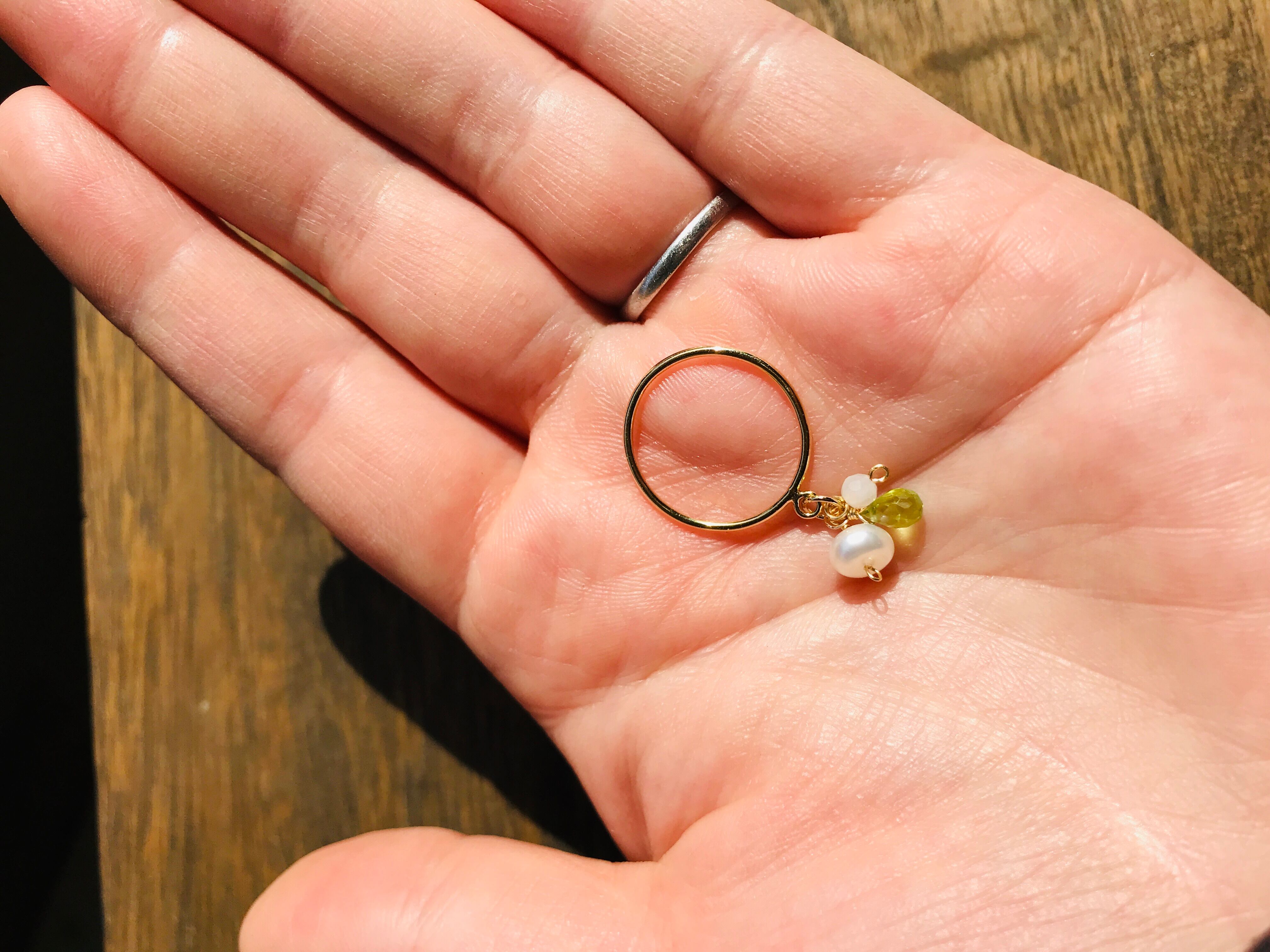 ※カン付のリングにチャームにして天然石を付けていますので、衝撃には十分注意してください。入浴時やプールなどに入る際には、外して保管してください。