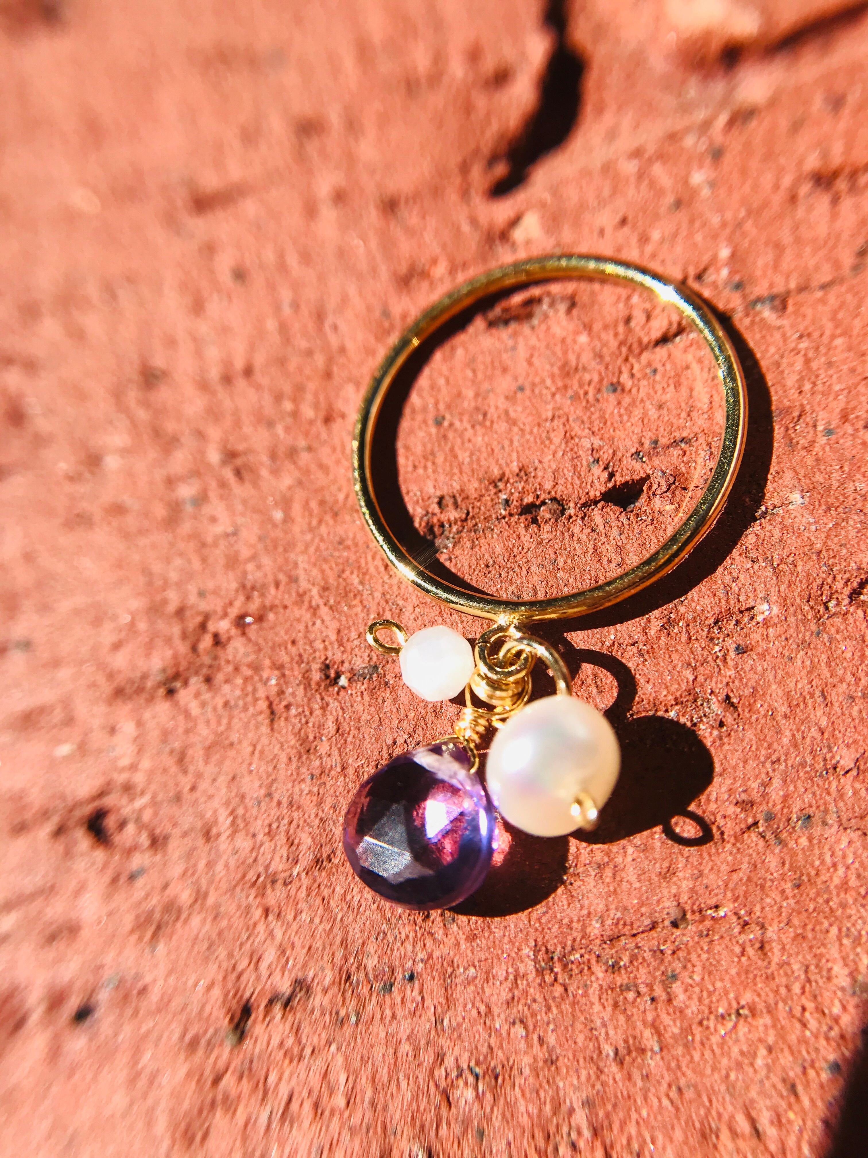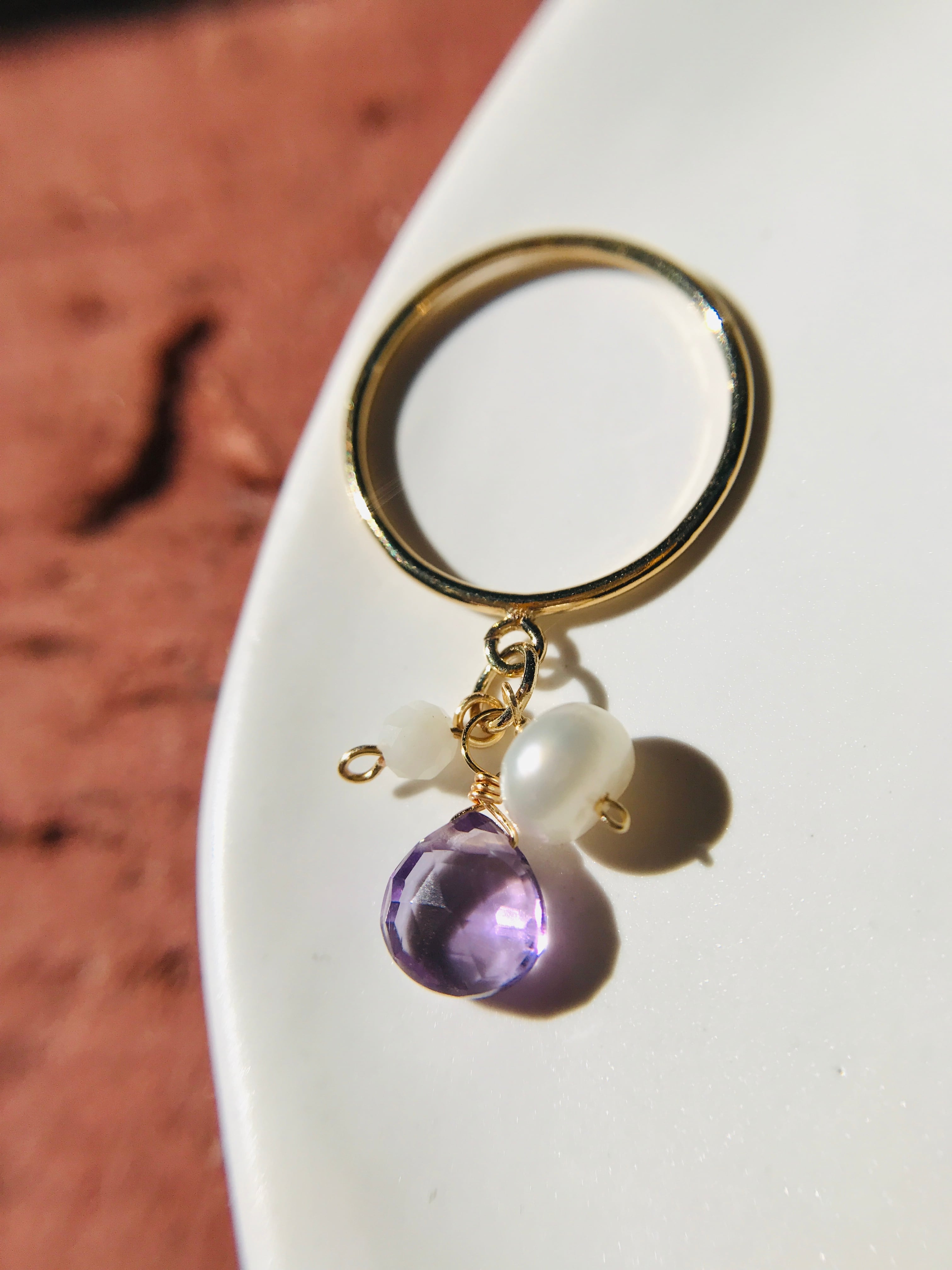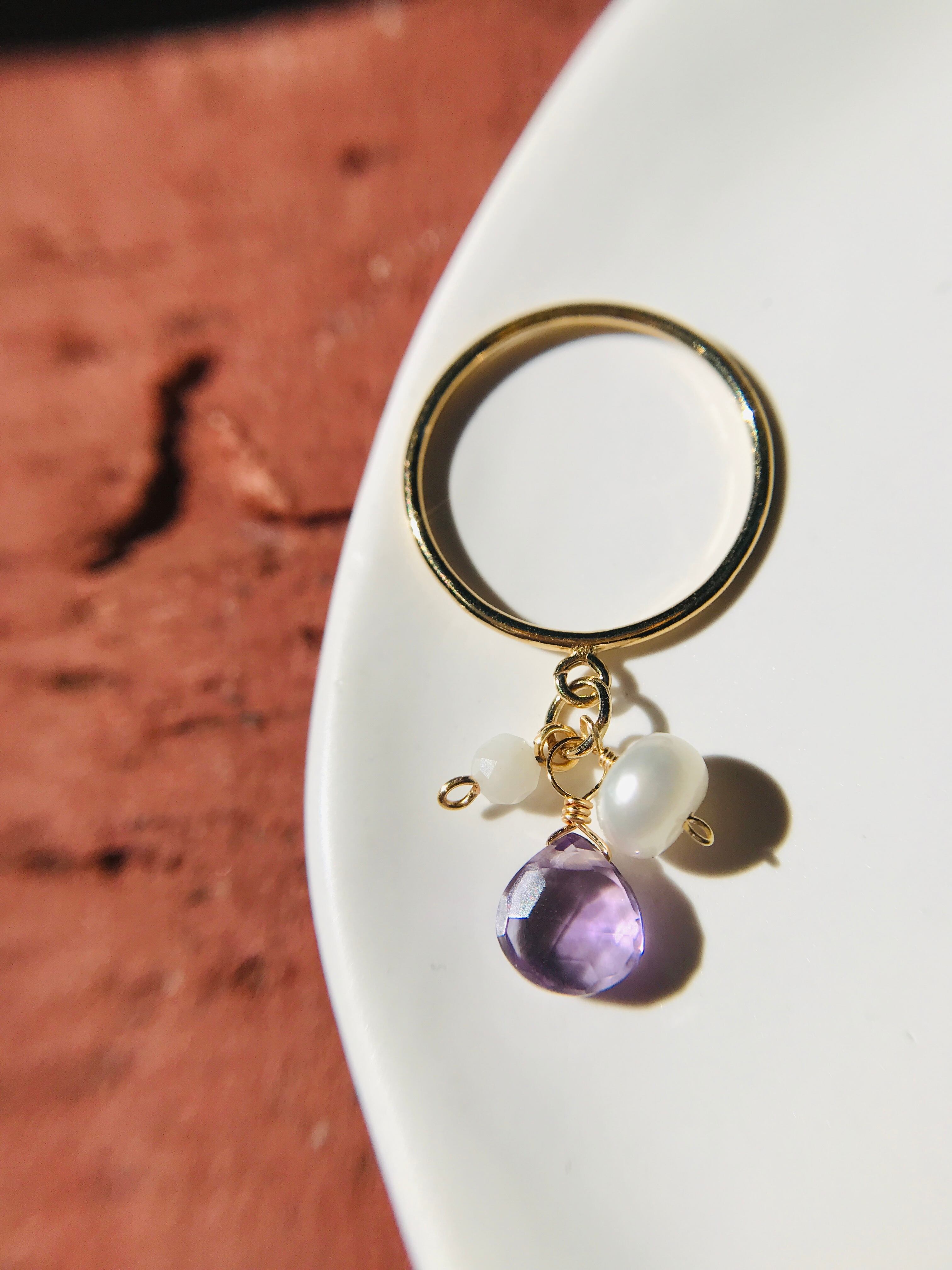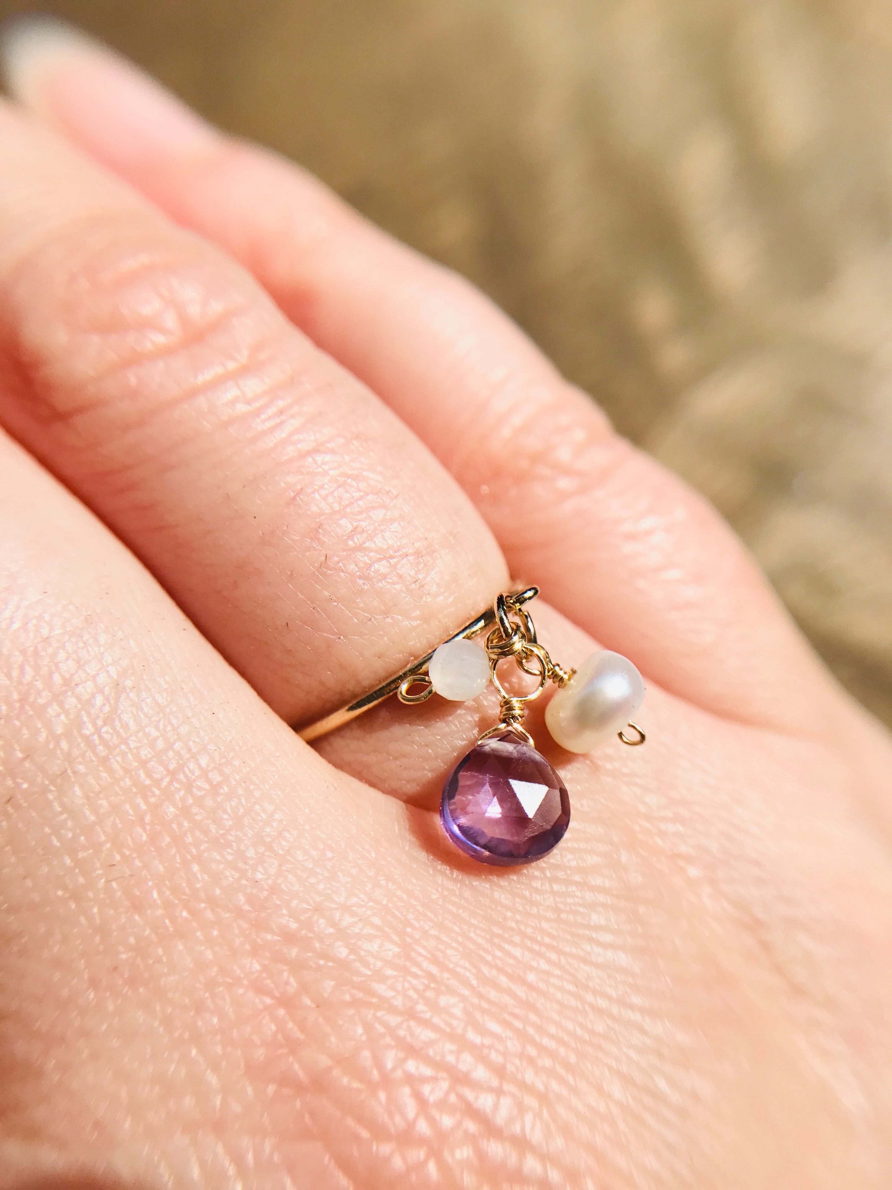 ※カン付のリングにチャームにして天然石を付けていますので、衝撃には十分注意してください。入浴時やプールなどに入る際には、外して保管してください。