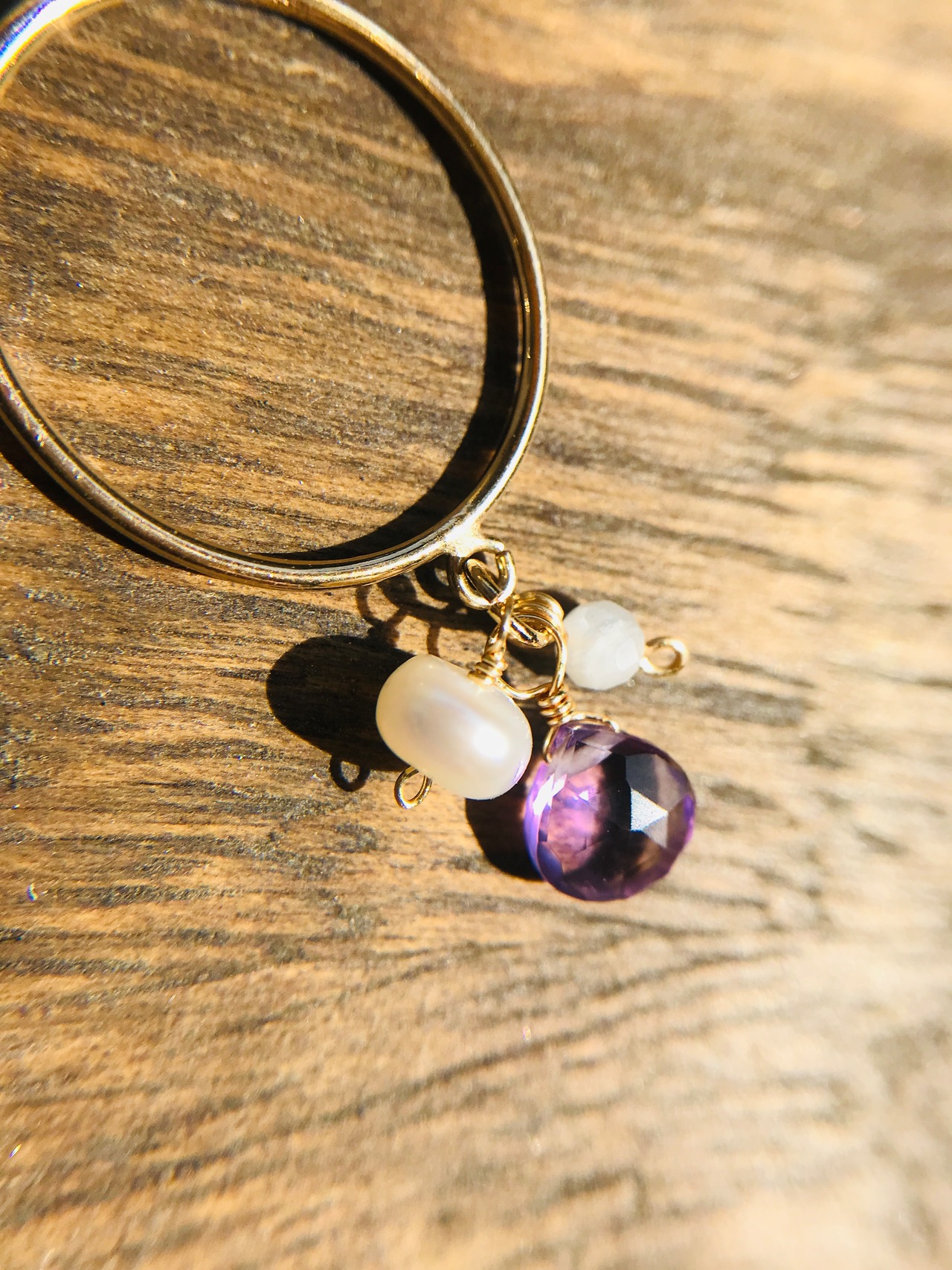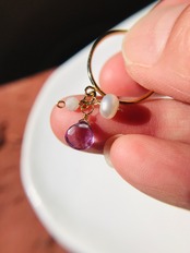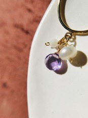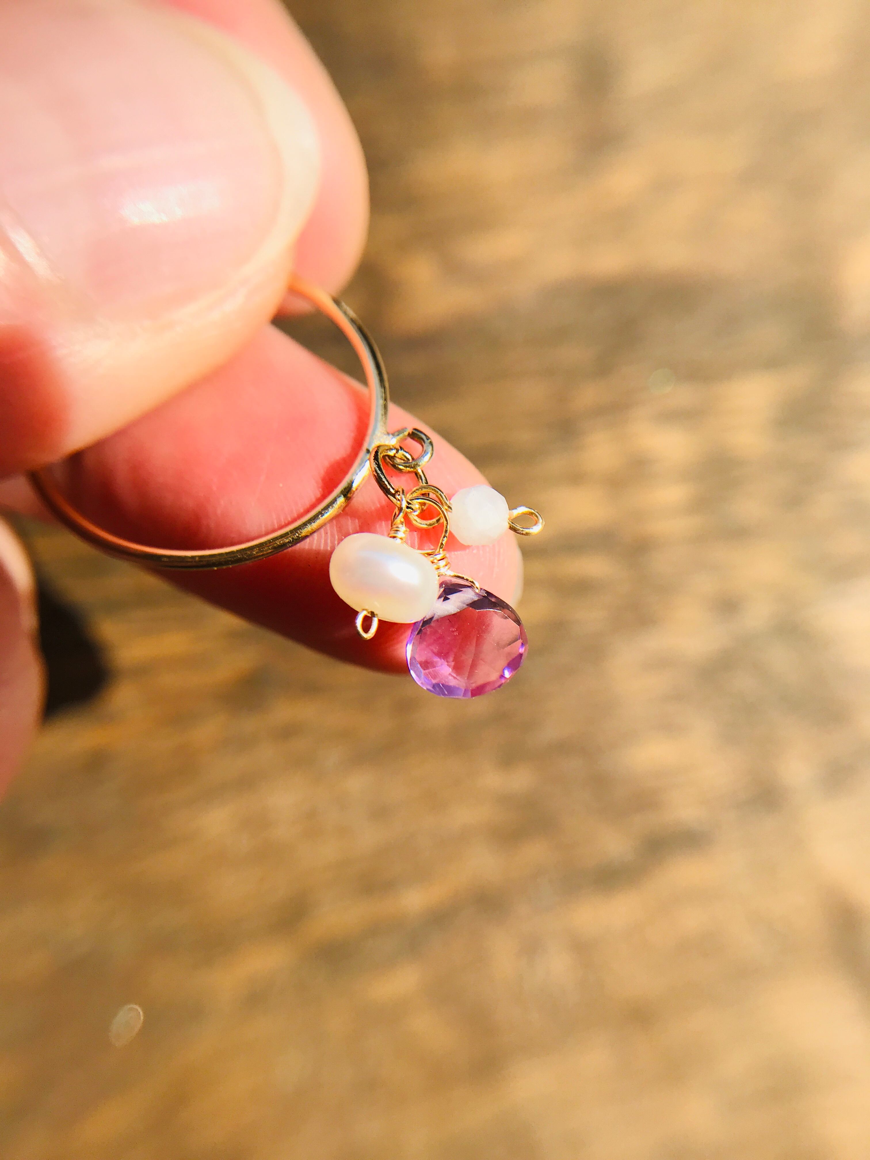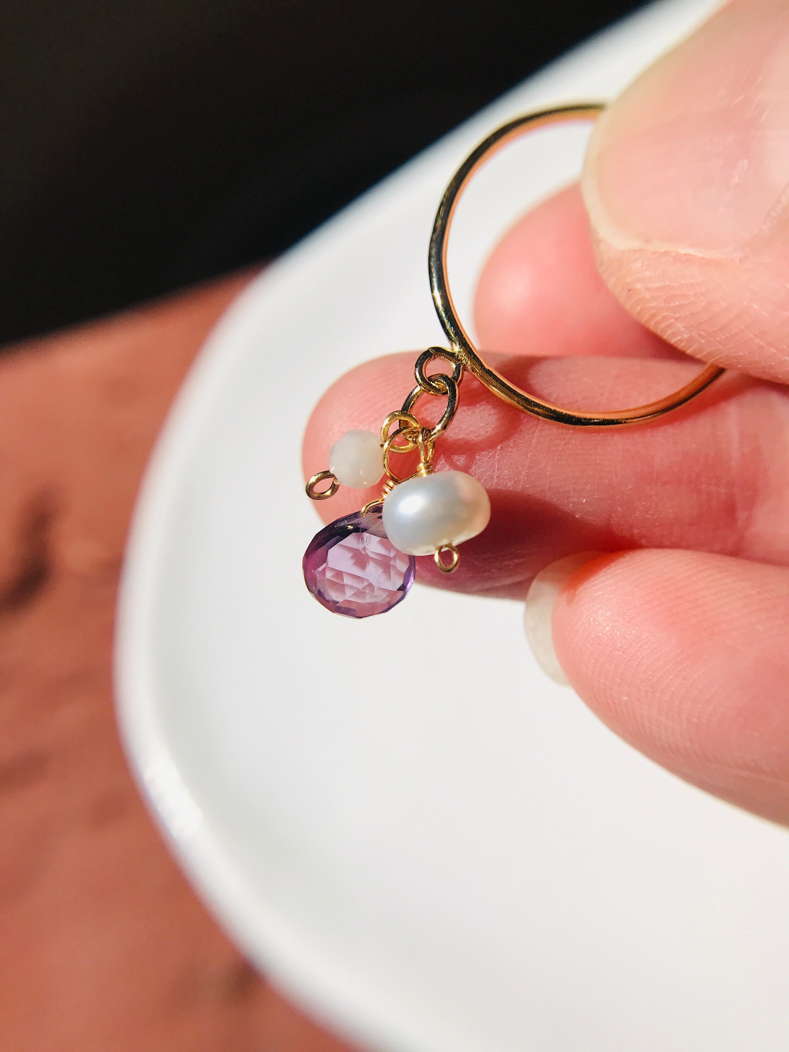 ピンクアメシストの他に、アクセントでホワイトムーンストーンカットボールと淡水パールをチャームにしてつけています。