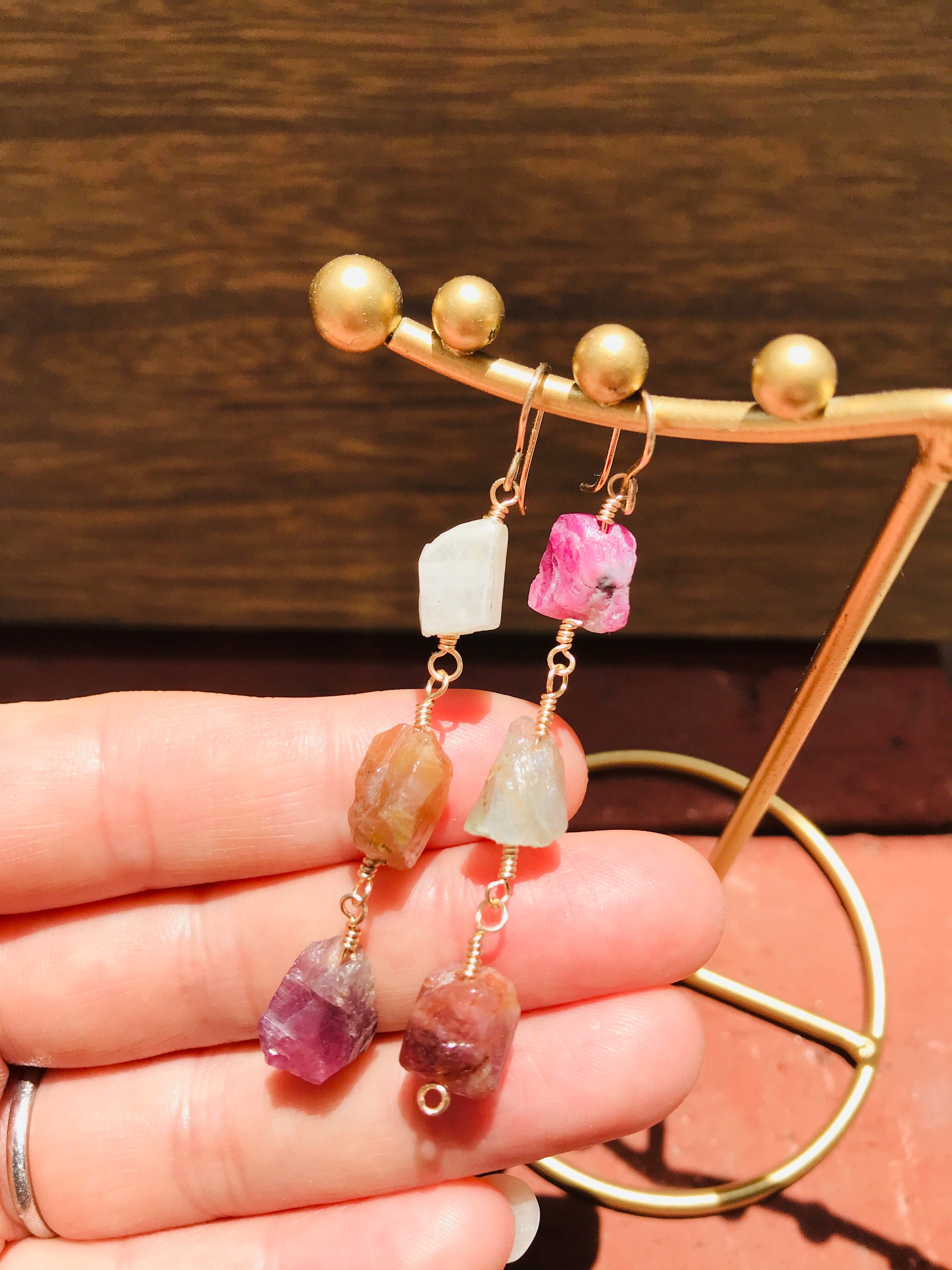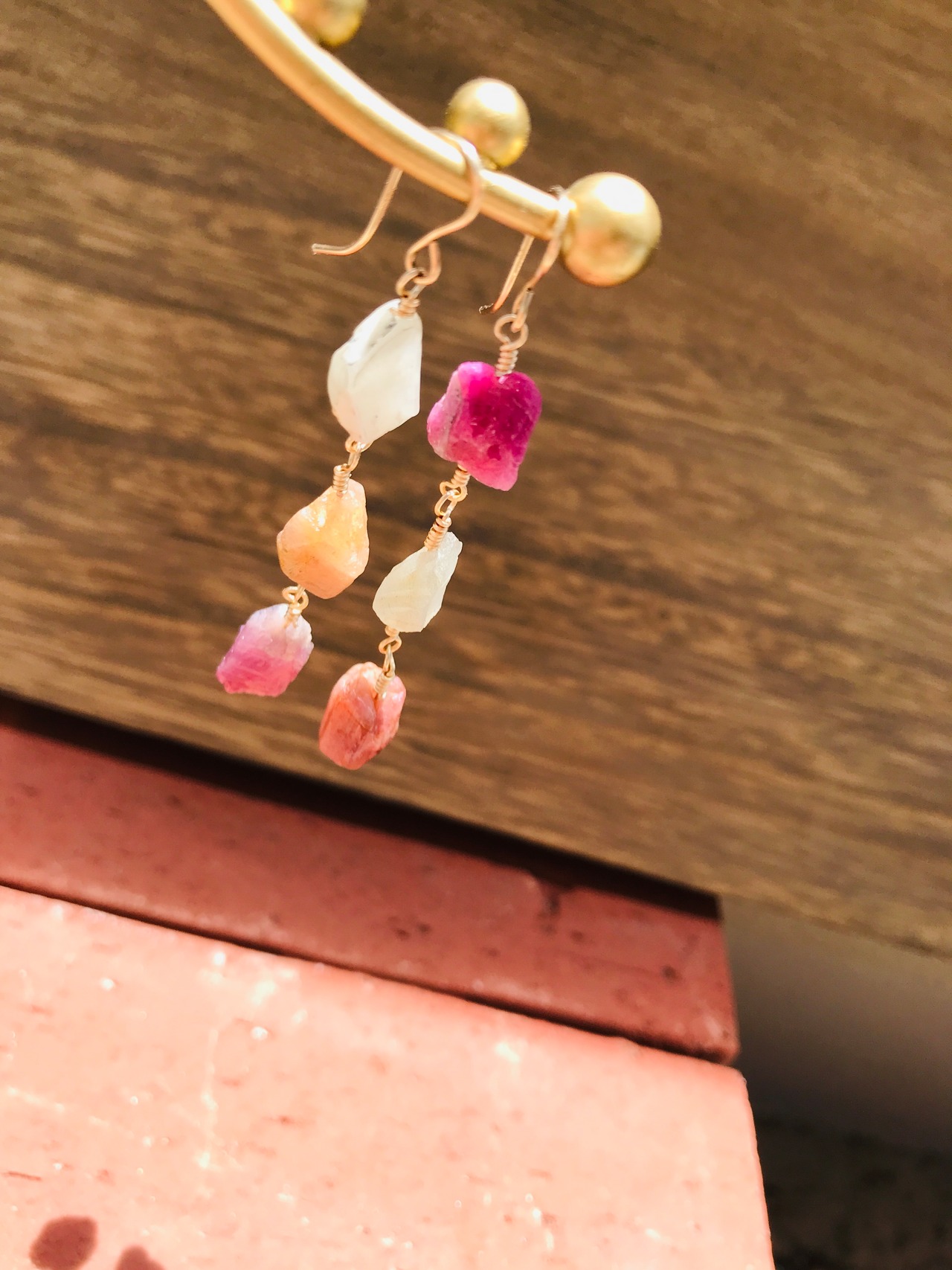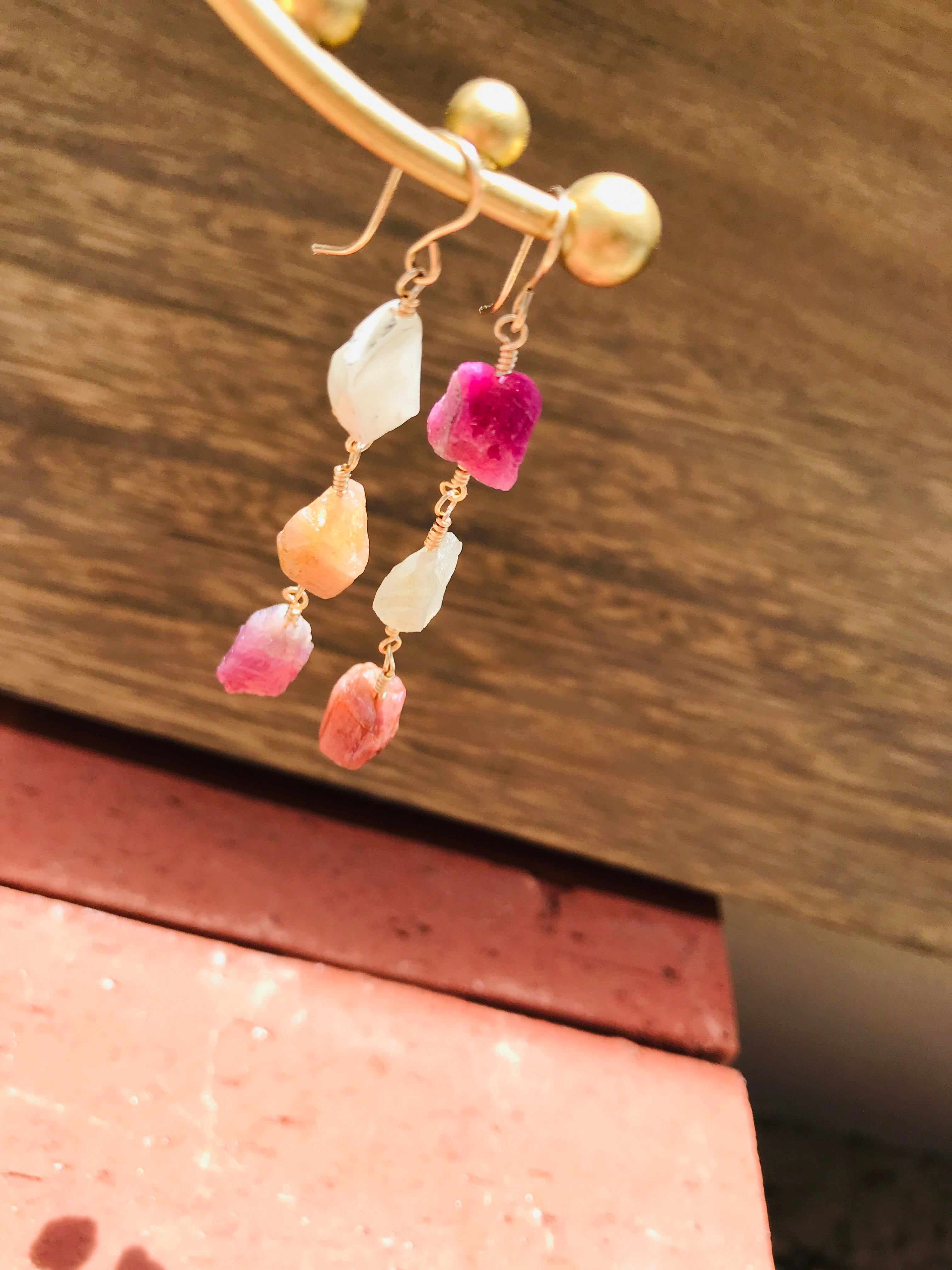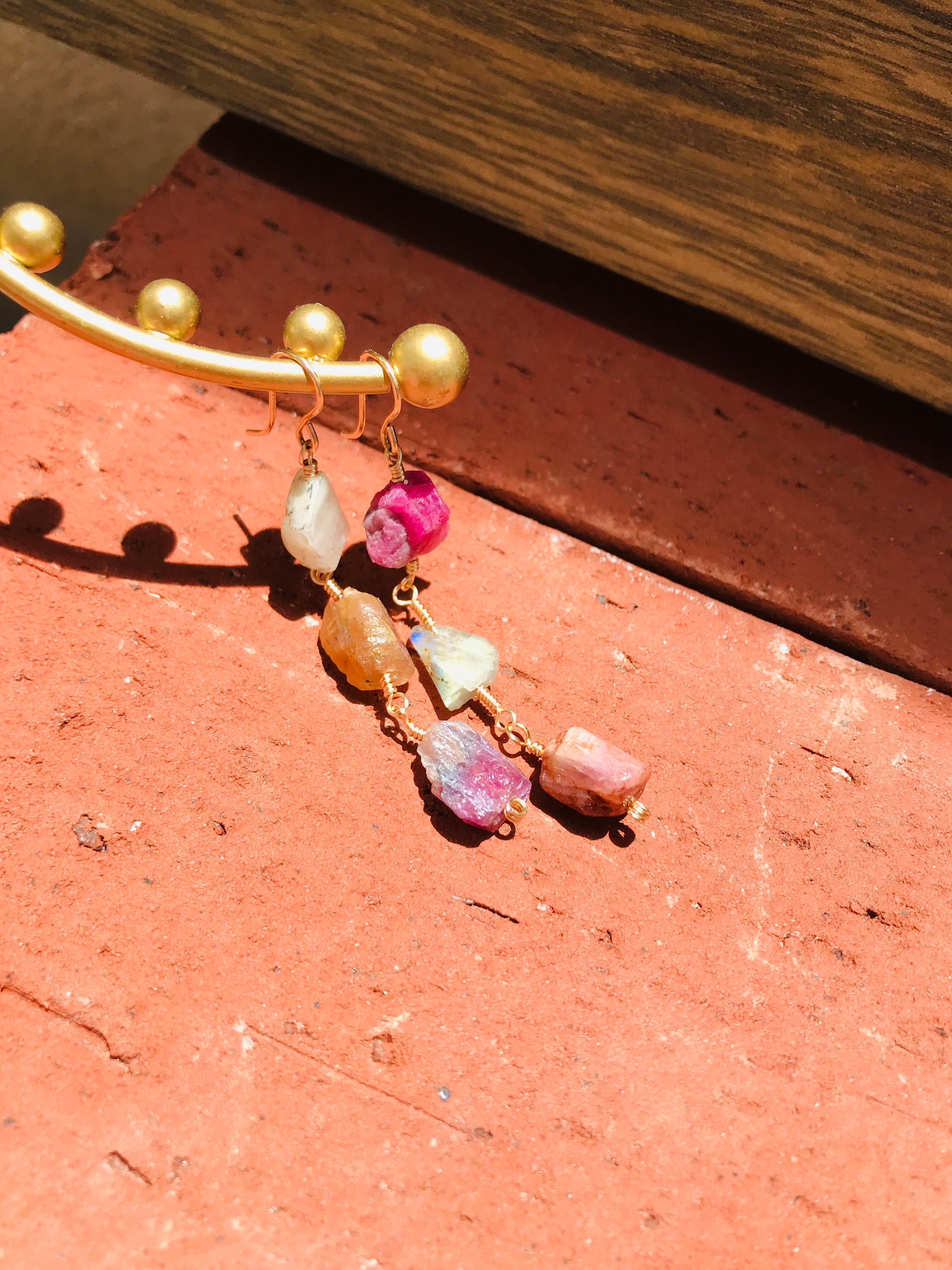 豪華にトルマリン原石を3個ワイヤーでつなげてあるので、耳元で原石がゆらゆらゆれて気分も高まります。