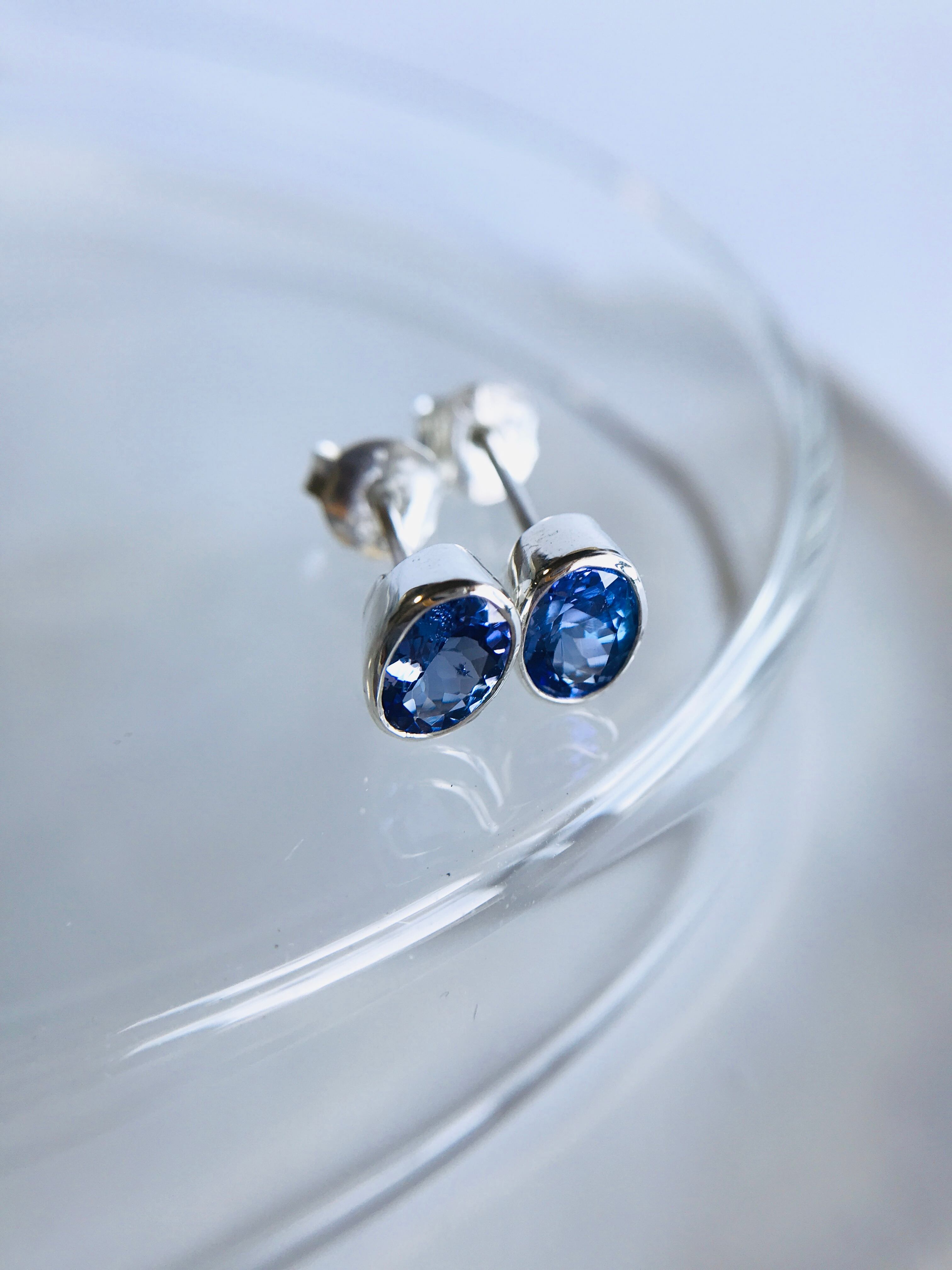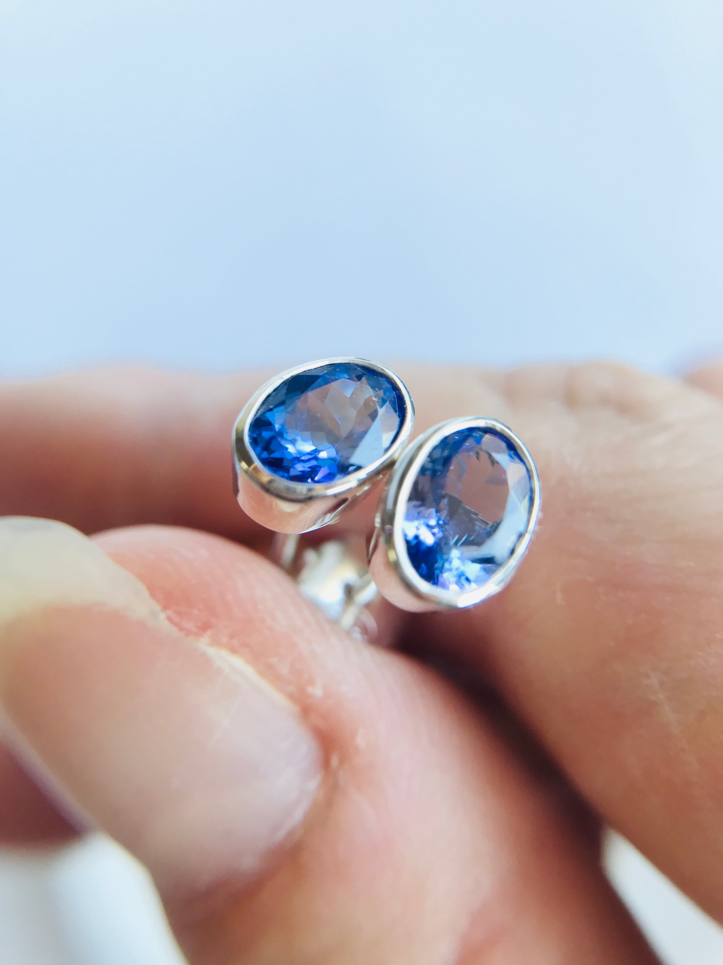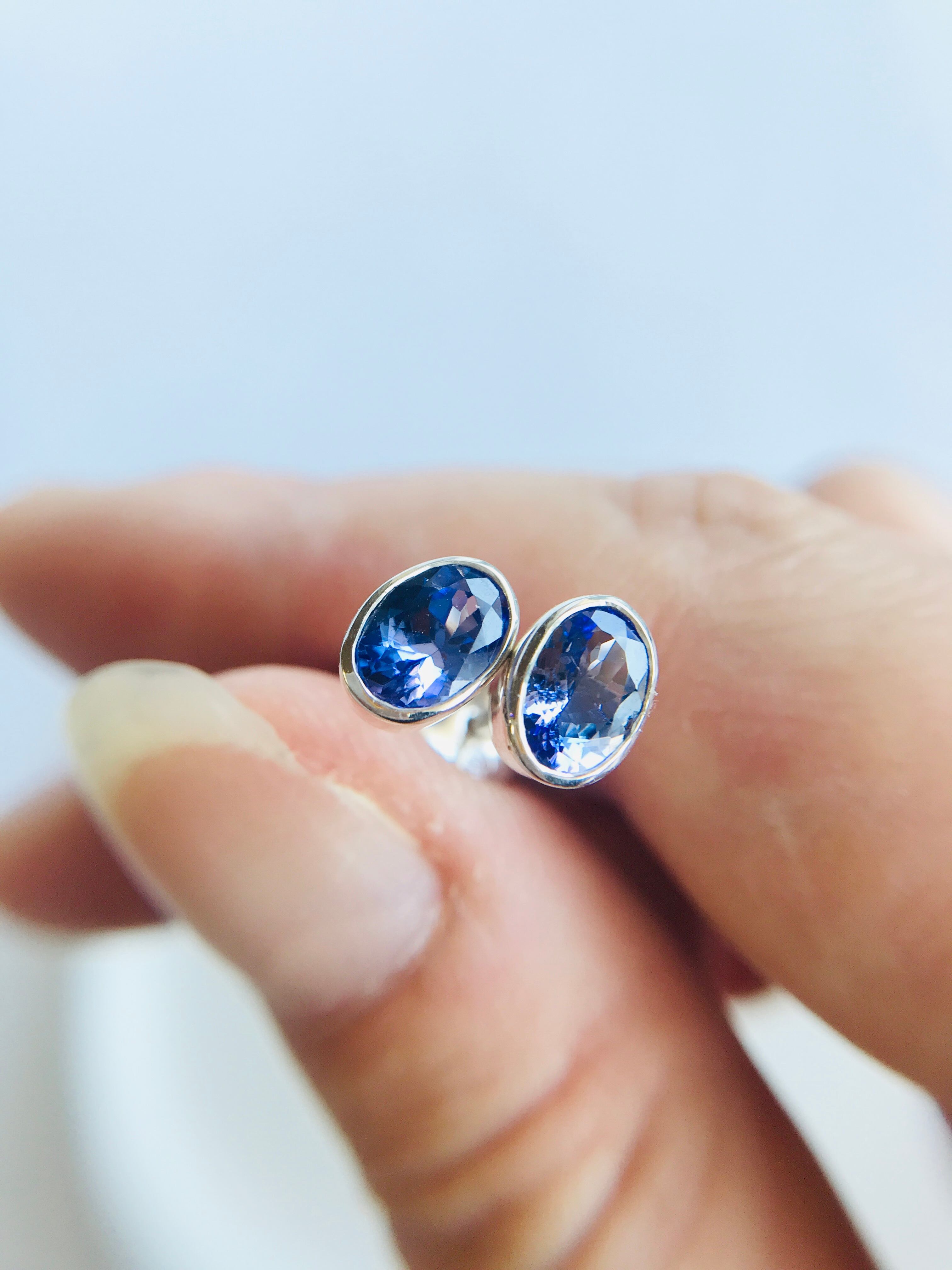オーバル型のタンザナイトをシルバーの石枠で留めた、シンプルかつ洗練されたピアスになります。